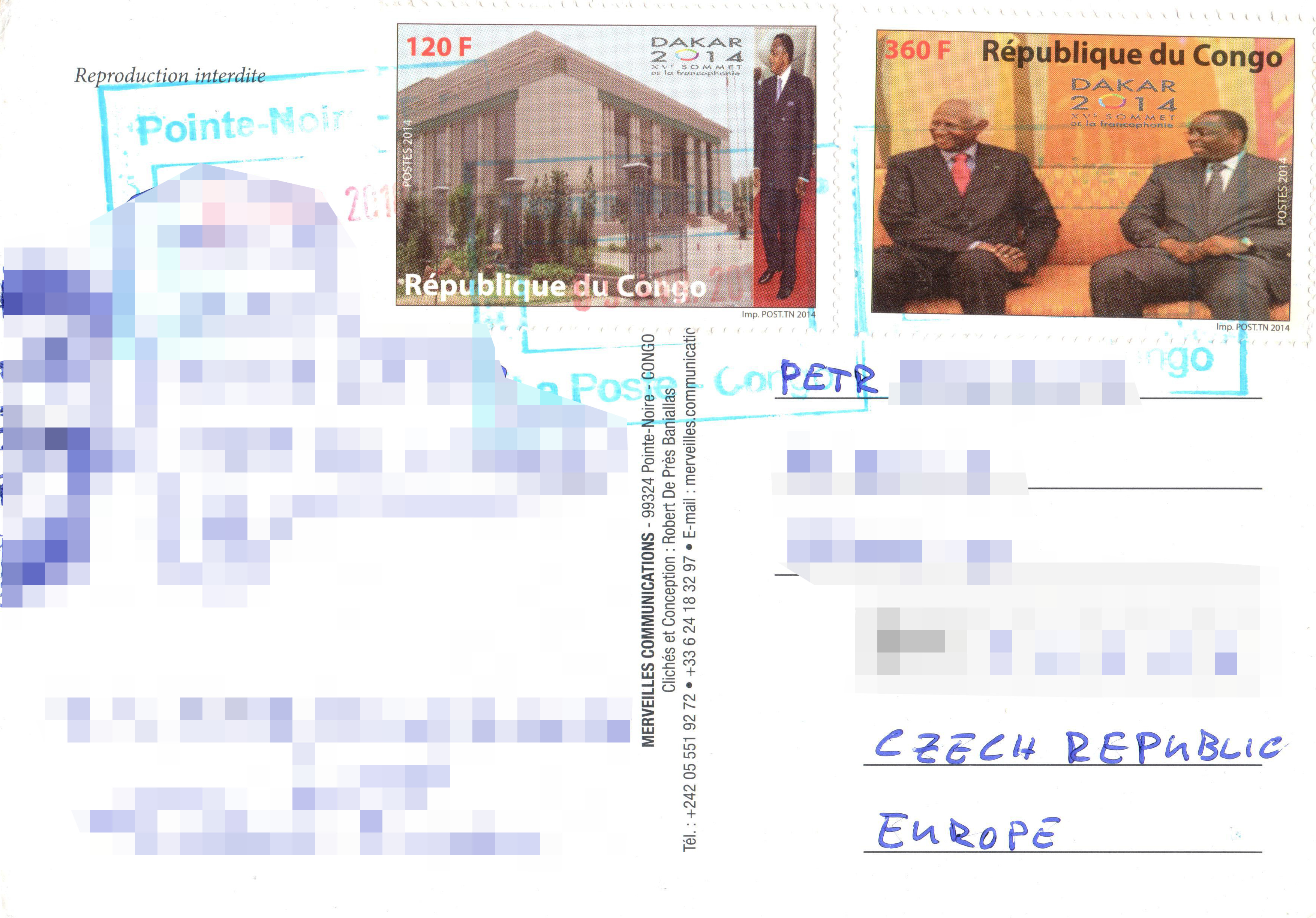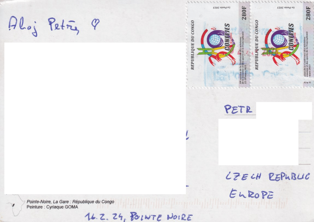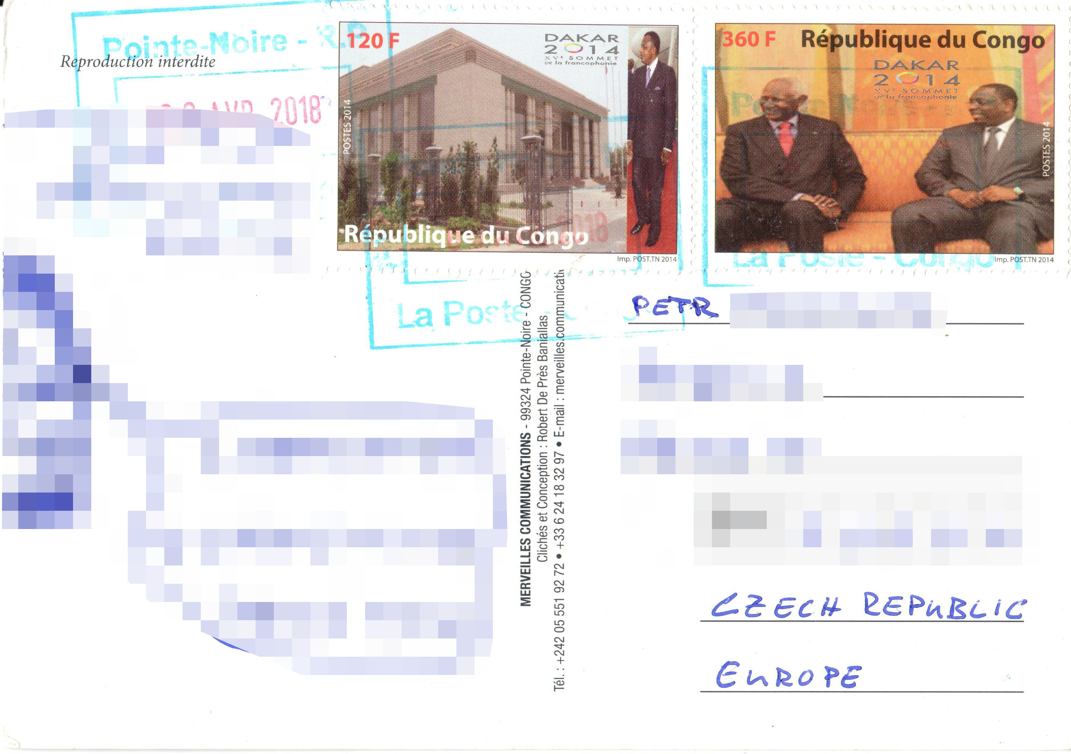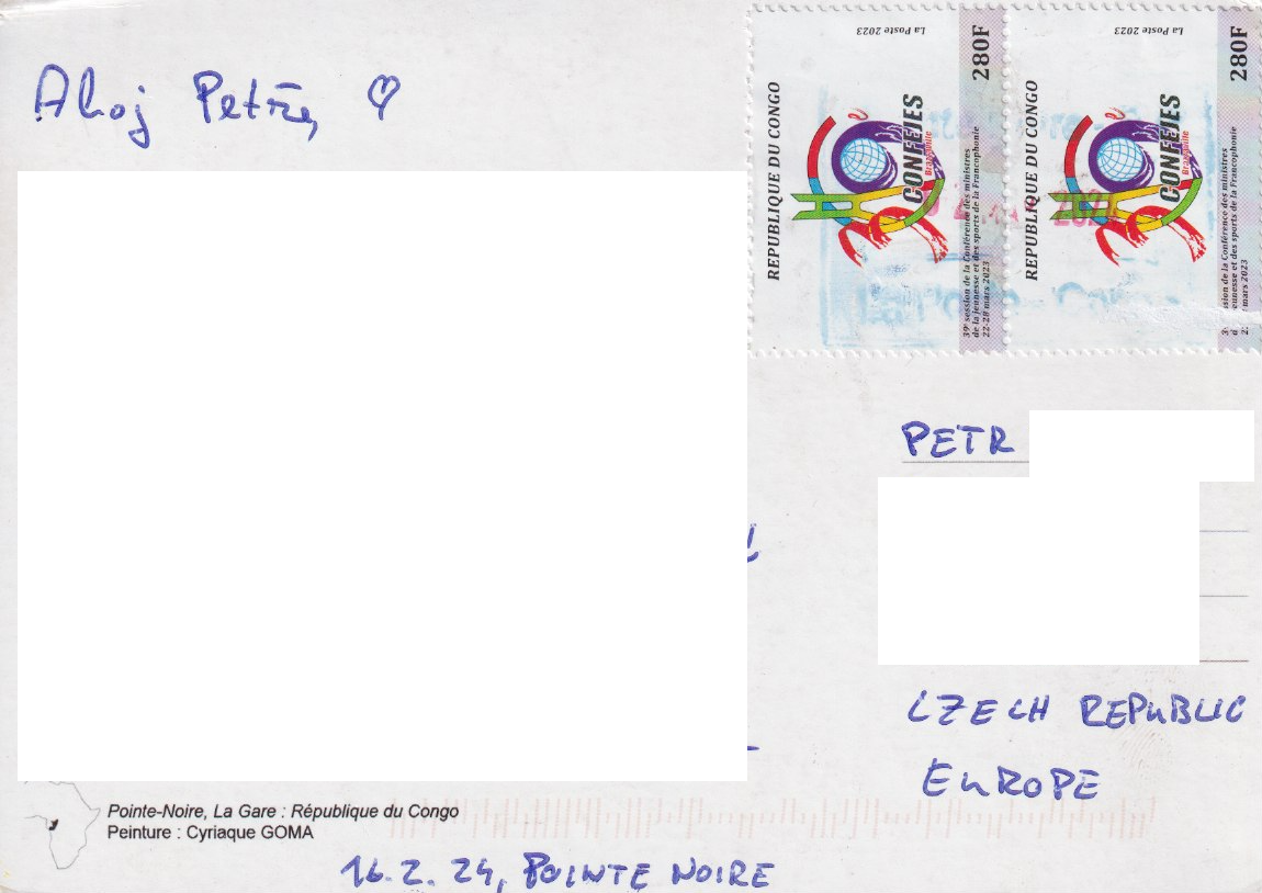 V úterý 15. května 2018 jsem od Tadeáše dostal druhý skvělý pohled z Konga, tentokrát zachycující místní železnici Kongo – Oceán, což je klíčová linka o délce 502 km, spojující přístav Ponte-Noire s hlavním městem Brazzaville. Příběh této železnice je nesmírně tragický. Stavba byla zahájena pod vedením francouzské koloniální administrativy v roce 1921. Místní obyvatelstvo bylo podrobováno masovým nuceným pracem na železnici a katastrofální pracovní podmínky, které i za celou dobu stavby vyžádaly více než 17.000 mrtvých dělníků, vyvolaly rozsáhlé povstání Kongo-Wara v letech 1928-1931. Na trase je 1,7 kilometru dlouhý tunel a 14 dlouhých betonových viaduktů. V letech 1997-2003 byla trať uzavřena kvůli občanské válce.V pondělí 14. května 2018 do mé poštovní schránky dorazil vůbec první pohled od cestovatele Tadeáše, protagonisty úžasného projektu “Na kole přes Afriku”. Zachycuje pomníky v Brazzaville, hlavním městě země.Po dlouhých šesti letech jsem dostal další pohled z Konga, a to v roce 2024 – díky mému oblíbenému cestovateli a dobrodruhovi Tadeášovi.