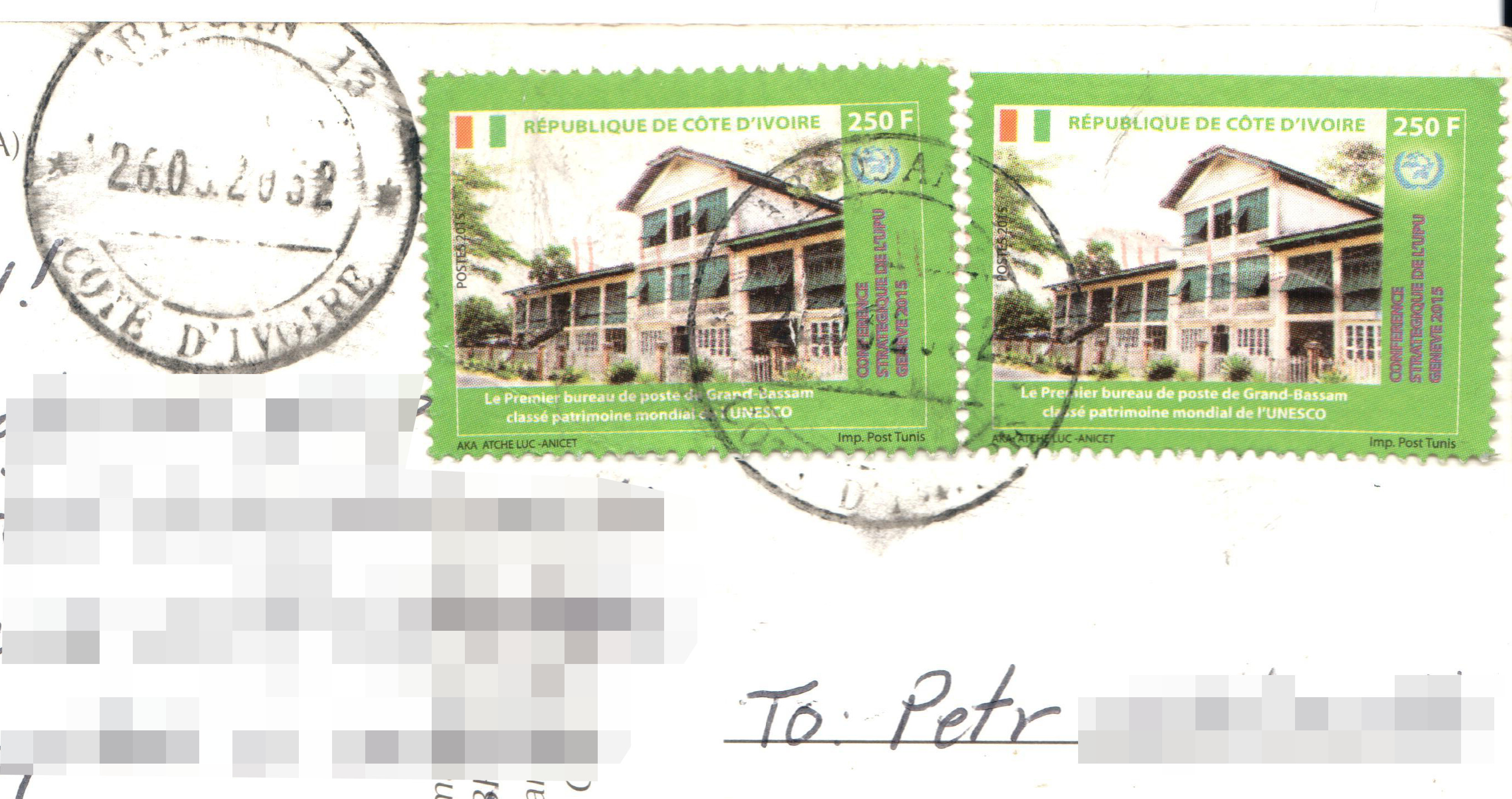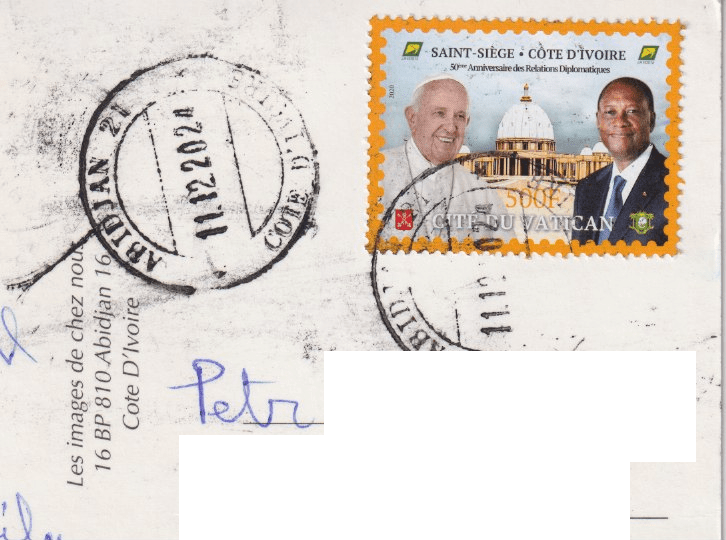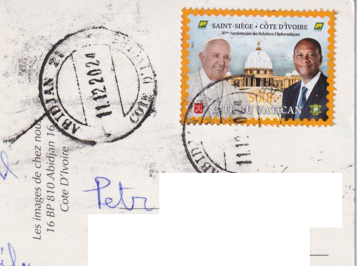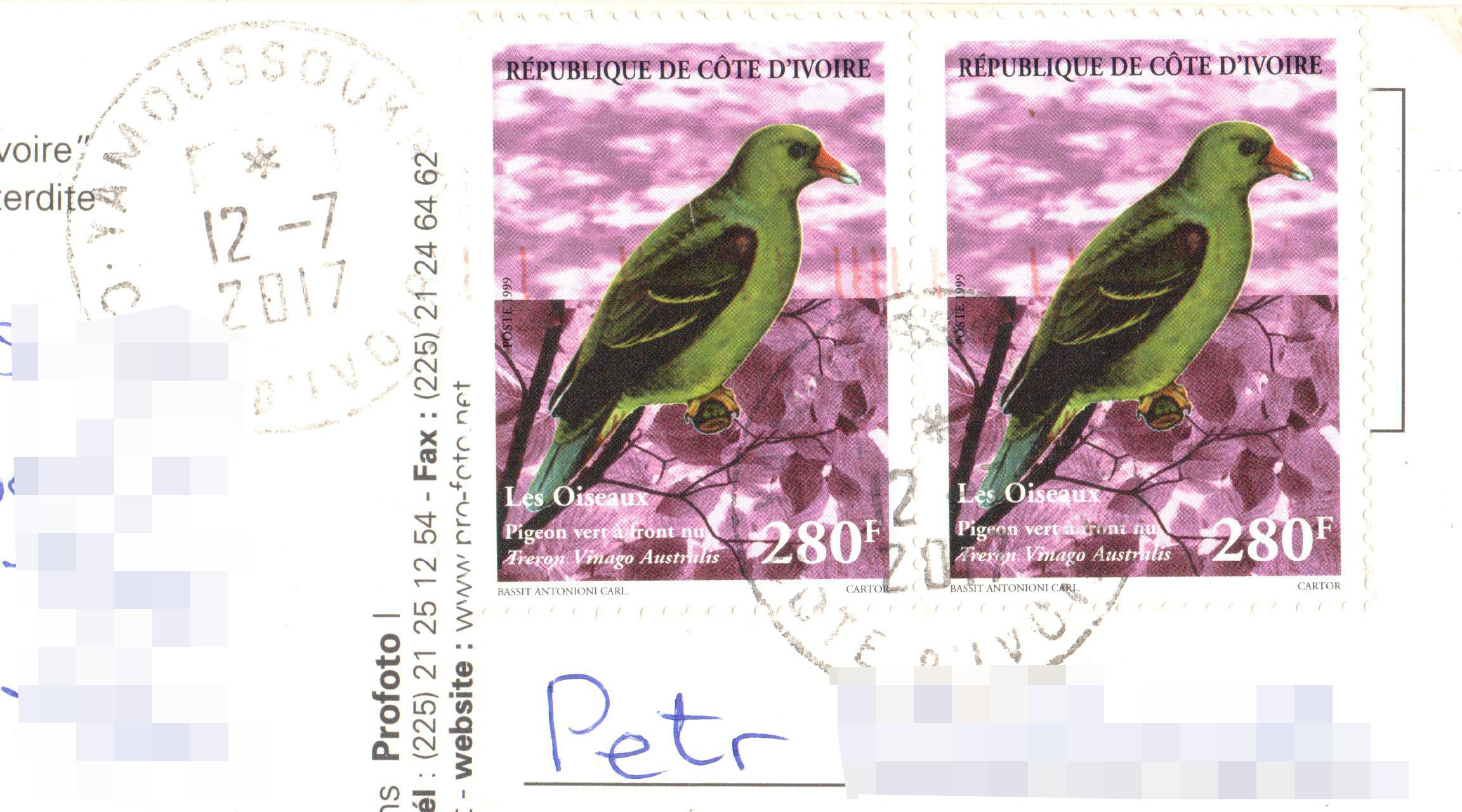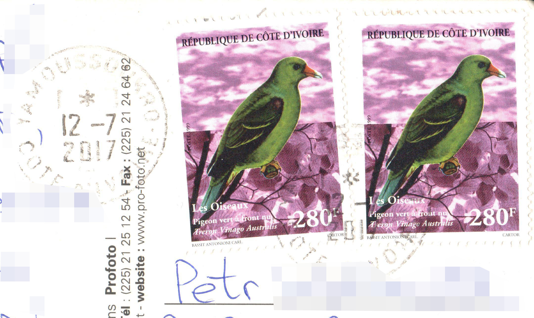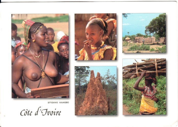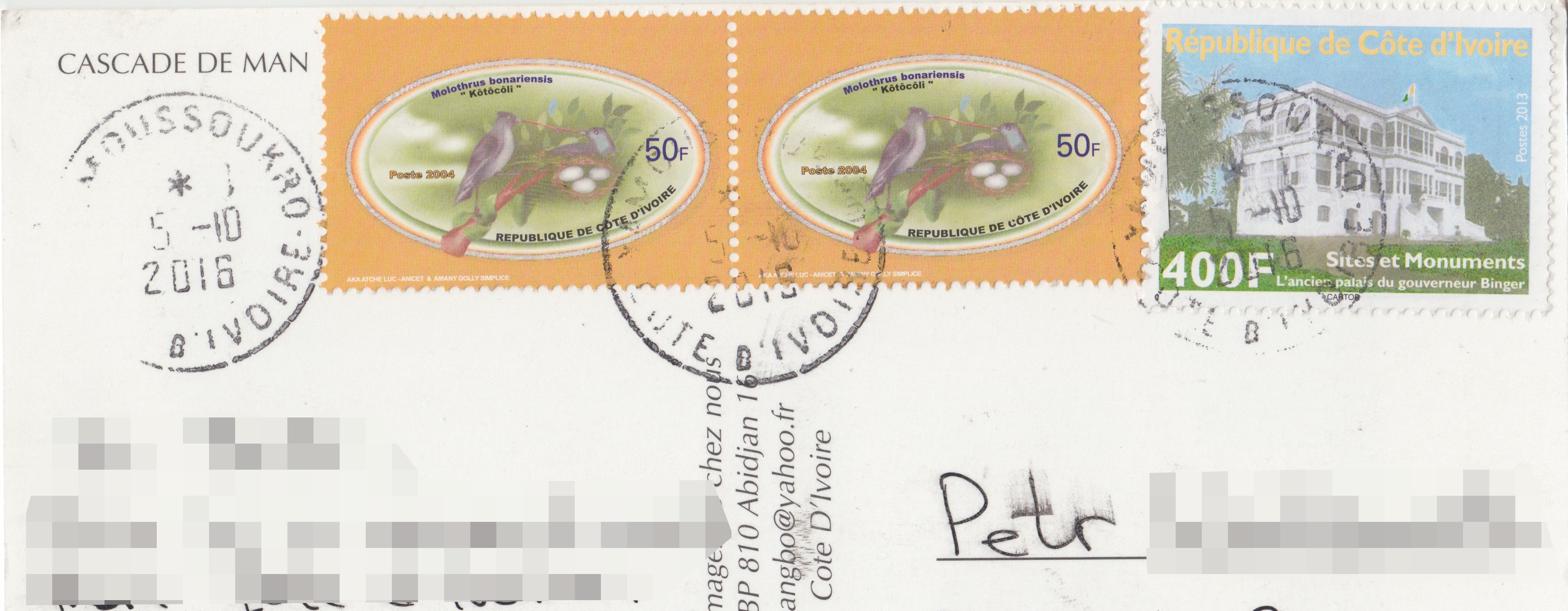V úterý 10. dubna 2018 jsem ve své poštovní schránce našel tento etnografický pohled z Pobřeží Slonoviny, zachycující na hlavní fotografii vlevo děvče z etnika Koyaka z vesnice Lobi, během svatebního obřadu.V pondělí 25. července do mé poštovní schránky dorazily dvě krásné pohlednice z Pobřeží Slonoviny od Natalie v rámci mého druhého swapu z Alandských ostrovů. Zobrazují metropoli Abidjan a pobřeží u vzácné biosférické rezervace Dagbego.V pondělí 31. 10. 2016 do mé poštovní schránky dorazily dvě krásné pohlednice z Pobřeží Slonoviny od Natalie v rámci mého swapu z Faerských ostrovů. Stejně jako první pohlednice jsou i tyto od od vynikajícího místního fotografa Etienna Nangba, průkopníka tohoto žánru v Pobřeží Slonoviny, který zemřel v roce 2003 ve věku 69 let. Nangbo se zabýval portrétní i žánrovou fotografií již od roku 1970 a byl jeden z vůbec prvních afrických uměleckých fotografů, kteří dosáhli uznání na mezinárodní scéně a kteří fotografovali specificky africká kulturní témata a každodenní život.V roce 2024 jsem po velice dlouhé době dostal do své poštovní schránky další pohlednici z Pobřeží Slonoviny.