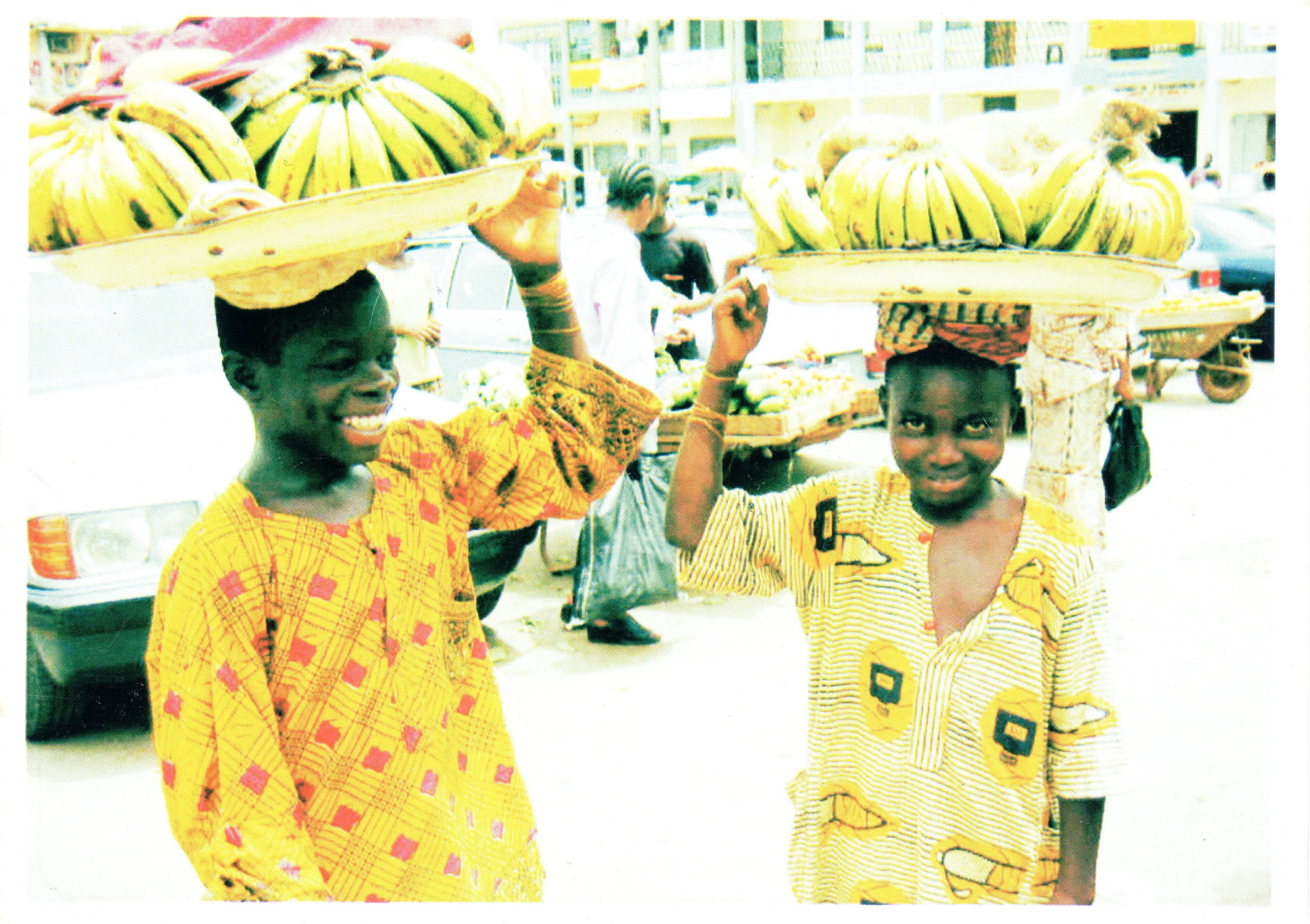 Na tuhle pohlednici můj kolega napsal, že vyhlíží velmi optimisticky, ale on je smutný z rozsáhlého zneužívání dětské práce, které je v Nigérii bohužel běžné.
