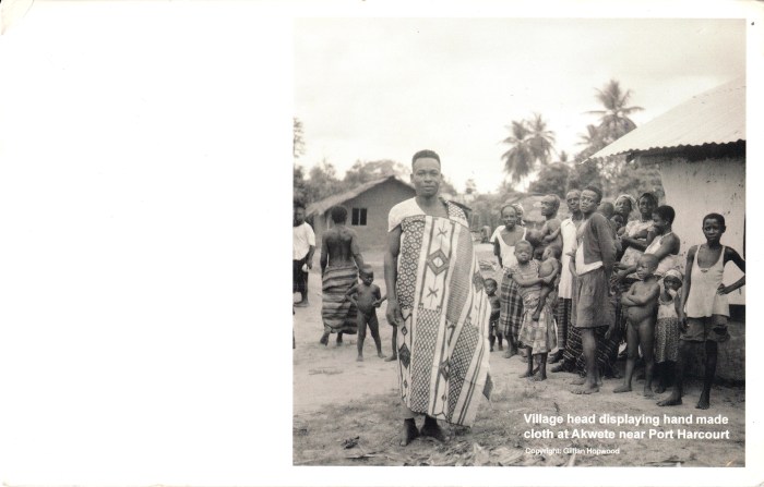Na této hodně staré a raritní pohlednici se nachází záběr na náčelníka a obyvatele původní vesnice u Port Harcourt. Dnes je tato oblast centrem ropného průmyslu a mají zde centrály všechny západní korporace, které nigerijské zdroje dlouhá léta bezohledně zneužívají.