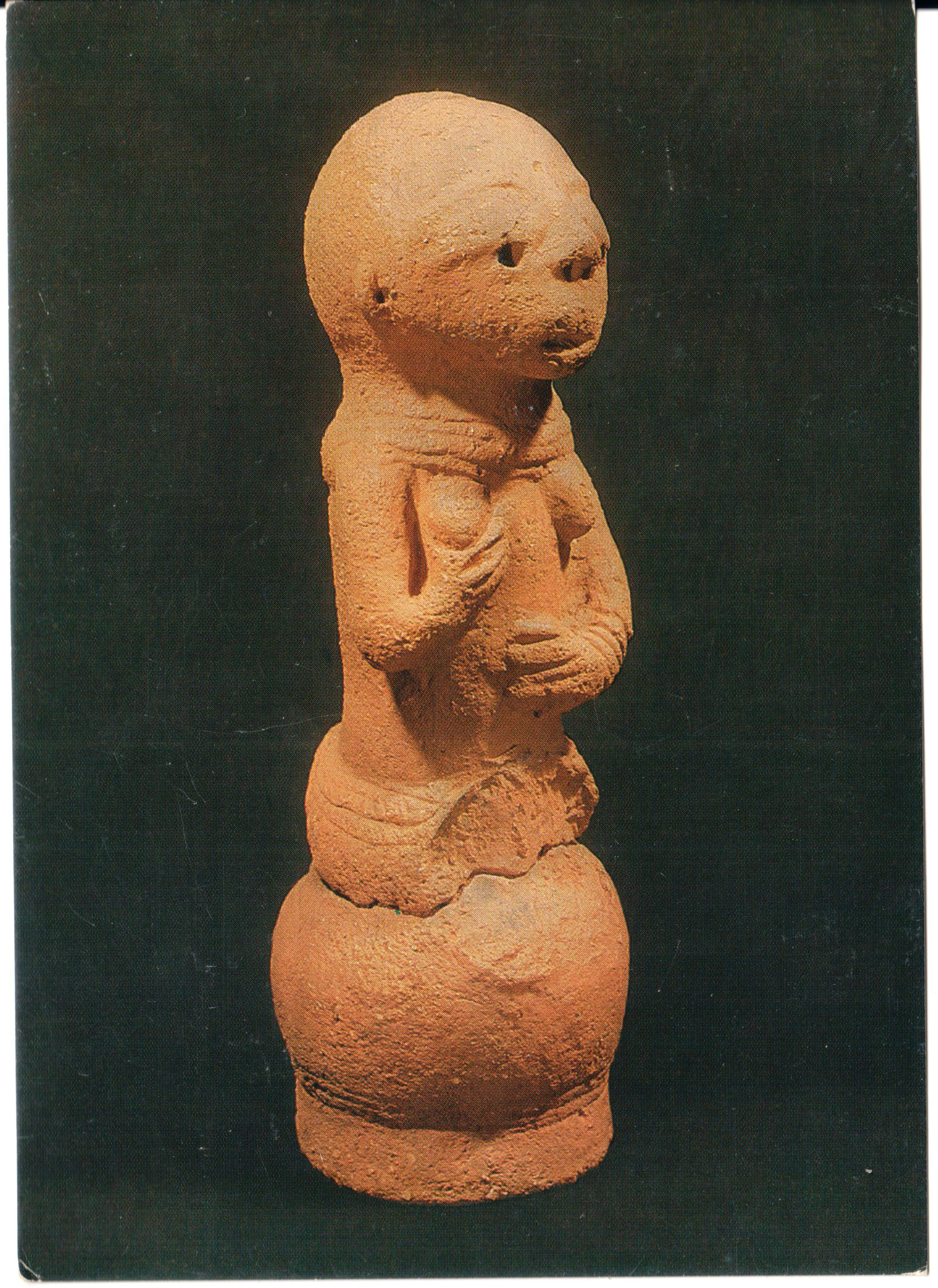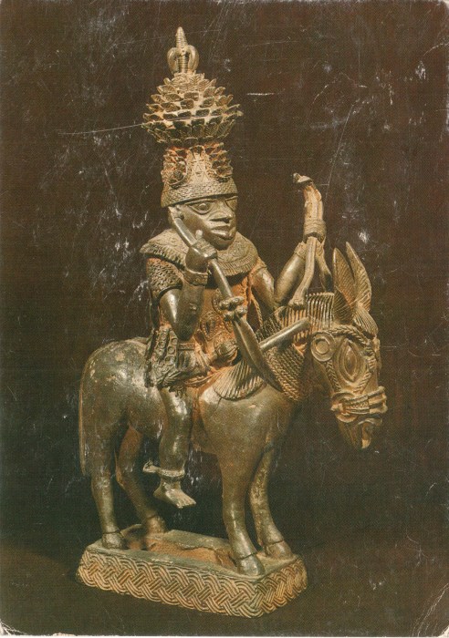 Na této pohlednici je jeden z takzvaných Beninských bronzů. Jedná se o sbírku více než 1000 bronzových soch a reliéfů z bývalého královského paláce království Benin, kterou celou v roce 1897 ukořistili Britové během válečné výpravy a odvezli do Londýna. Tažení pod velením admirála Harryho Rawsona vyvrcholilo dobytím a naprostou devastací města Benin. Beninské království bylo jedním z nejdůležitějších prekoloniálních státních útvarů v Západní Africe, které dlouho kladlo odpor kolonizátorům. Dnes ukradené bronzy drží v počtu asi 200 kusů Britské muzeum a více než 800 kusů je rozptýlených po soukromých sbírkách. V jejich domovině se jich zachovalo jen velmi málo.