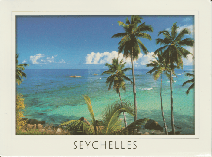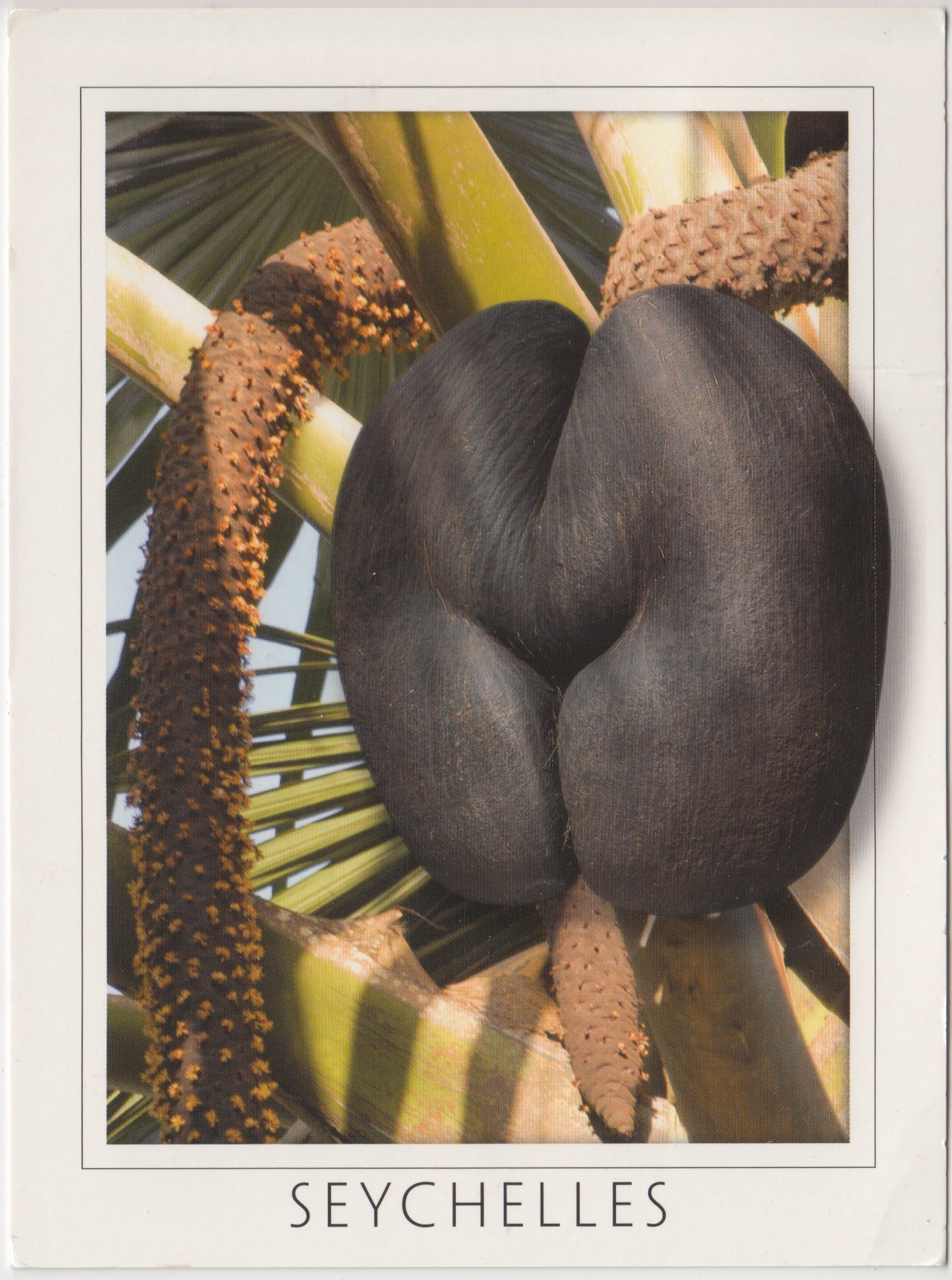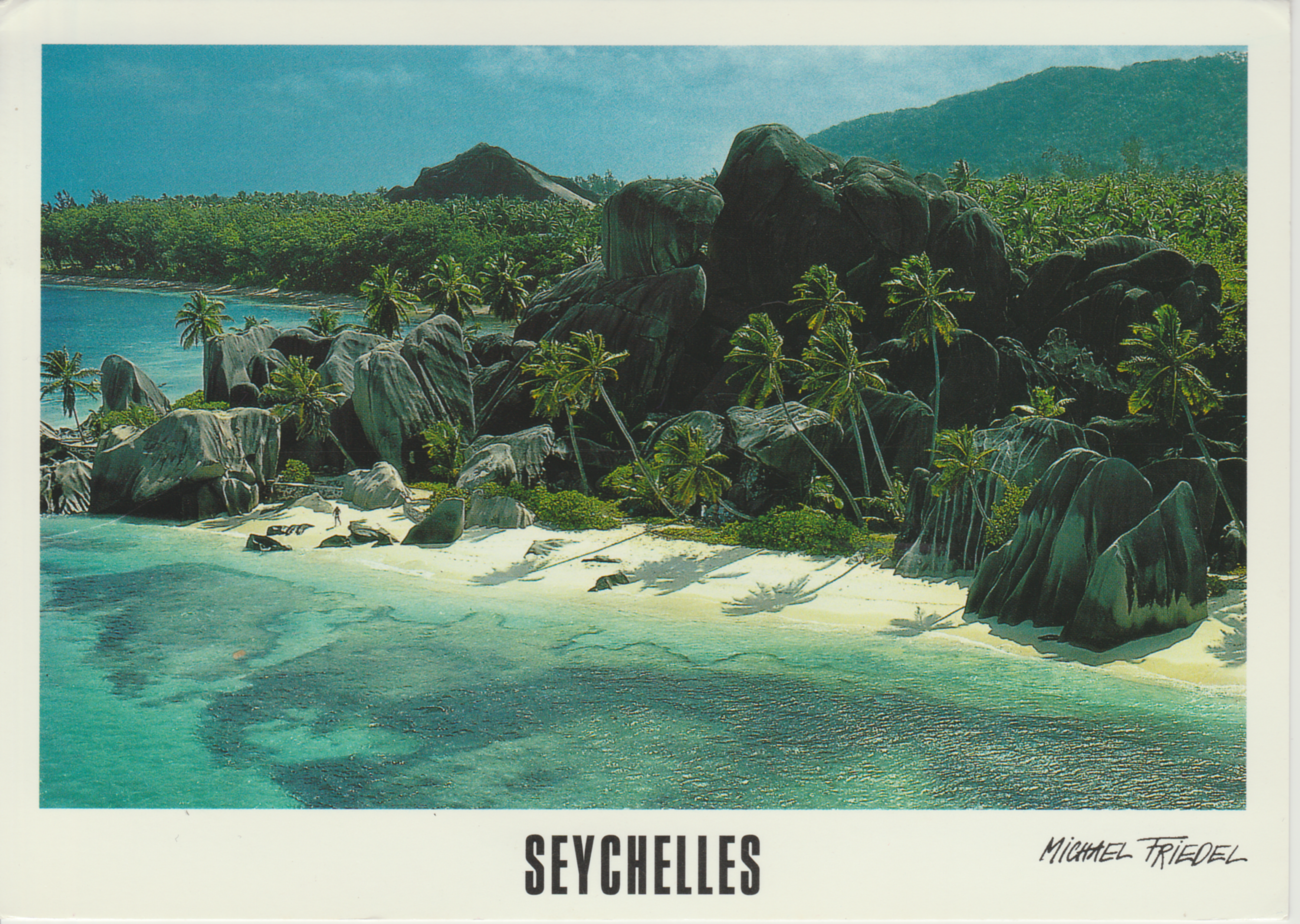 Moje první pohlednice ze Seychel dorazila v červenci 2015. Na pohlednici se nachází největší ořech na světě, plod palmy Lodoicea maldivica, které se rovněž přezdívá mořský kokos. Palma roste pouze endemicky pouze na dvou místech na celém světě: na ostrovech na Seychelách – Praslin a Curieuse. Ořech může vážit 15 – 30 kilogramů a používá se v tradiční ajurvédské a čínské medicíně. Seychely jsou republika, rozkládající se v Indickém oceánu na celkem 115 ostrůvcích, mající hlavní město Victoria. Geograficky a politicky jsou řazeny k Africe. Mají asi 90 tisíc obyvatel a představují tak nejméně lidnatou africkou zemi. Ostrovy až do roku 1756 nebyly obydlené a byly využívány většinou pouze piráty jako kotviště a úkryt. V tomto roce se zde ovšem vylodila francouzská expedice, která zde vybudovala vojenskou základnu a pojmenovala souostroví po Jeanu Moreau de Séchelles, ministru financí krále Ludvíka XIV. Po roce 1814 Seychely přešly pod britskou svrchovanost a nezávislosti se dočkaly až v roce 1976. V letech 1979-1993 na Seychelách vládl diktátorský socialistický režim jedné politické strany, která si dodnes udržuje na ostrovech silné postavení, i když už Seychely jsou prezidentskou republikou se systémem více politických stran. Seychely jsou přírodní “ráj” pro více než 70 endemicky se vyskytujících vzácných druhů živočichů a rostlin a ekologická legislativa je na ostrovech velmi přísná. Seychely jsou domovem například vzácné želvy obrovské, která se dožívá až 160 let a na mnoha ostrovech se nacházejí obrovské kolonie mořských ptáků.