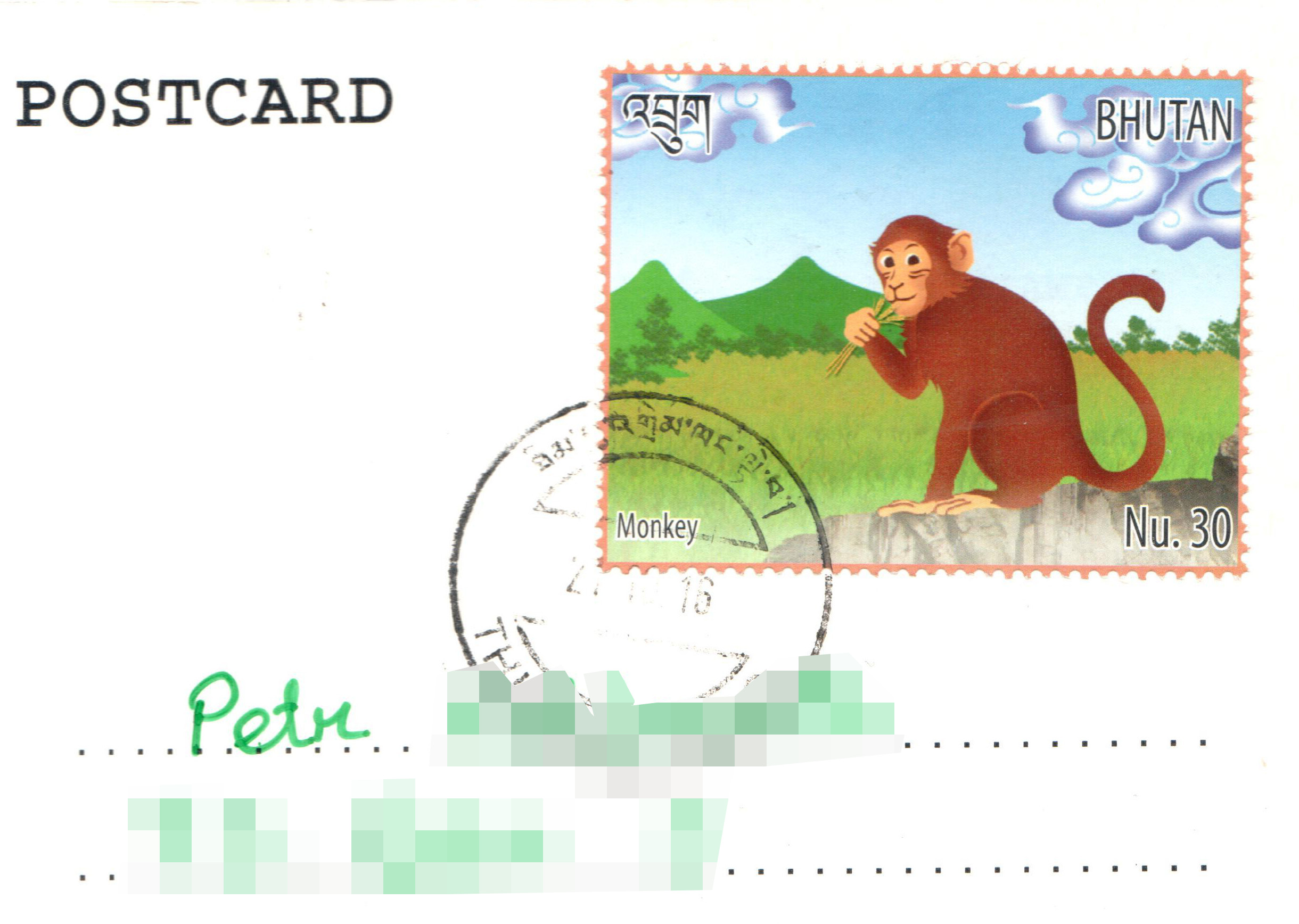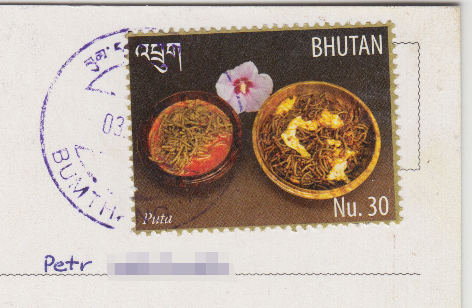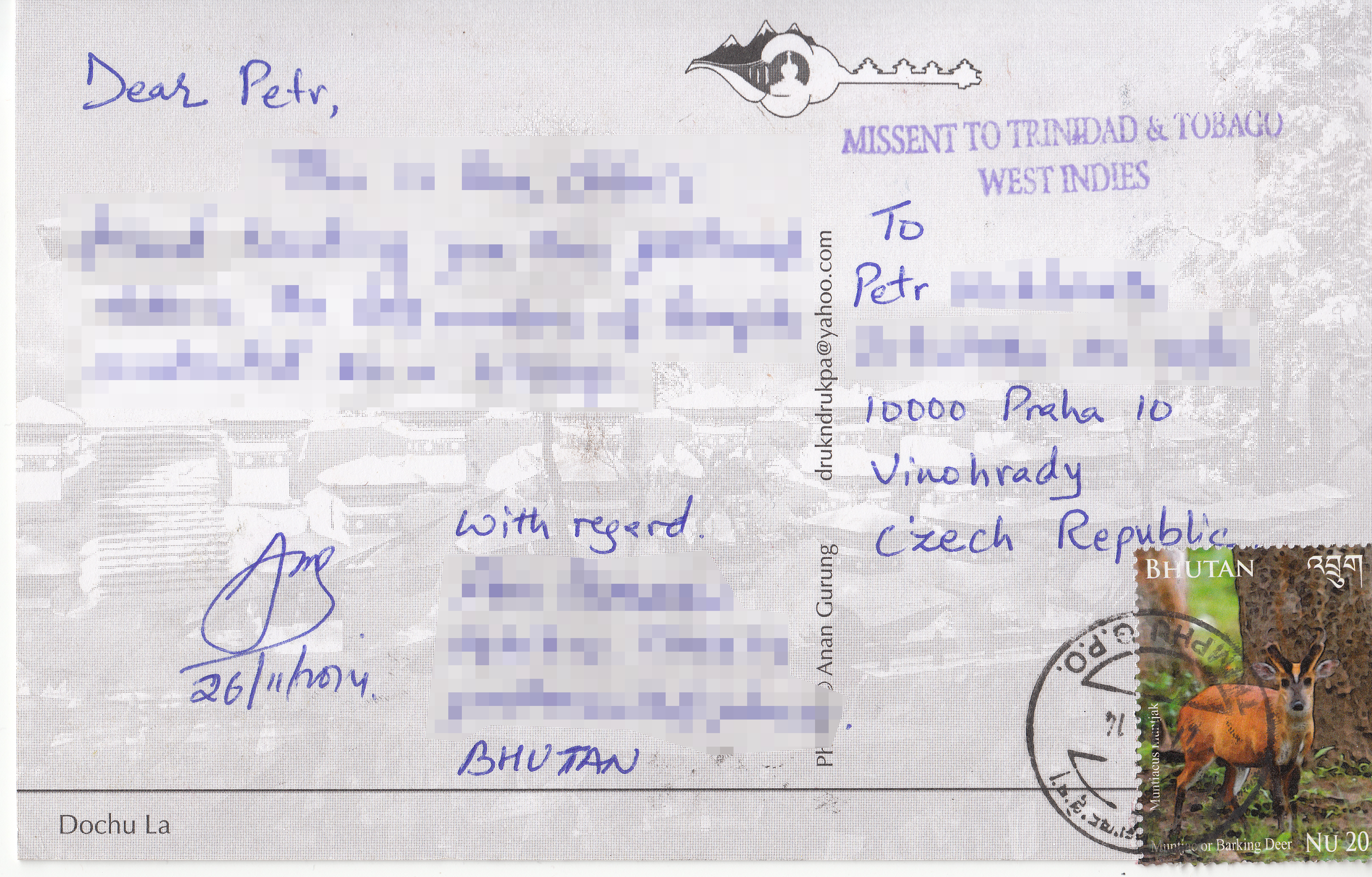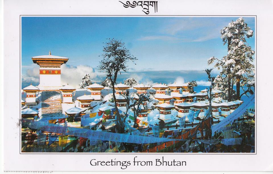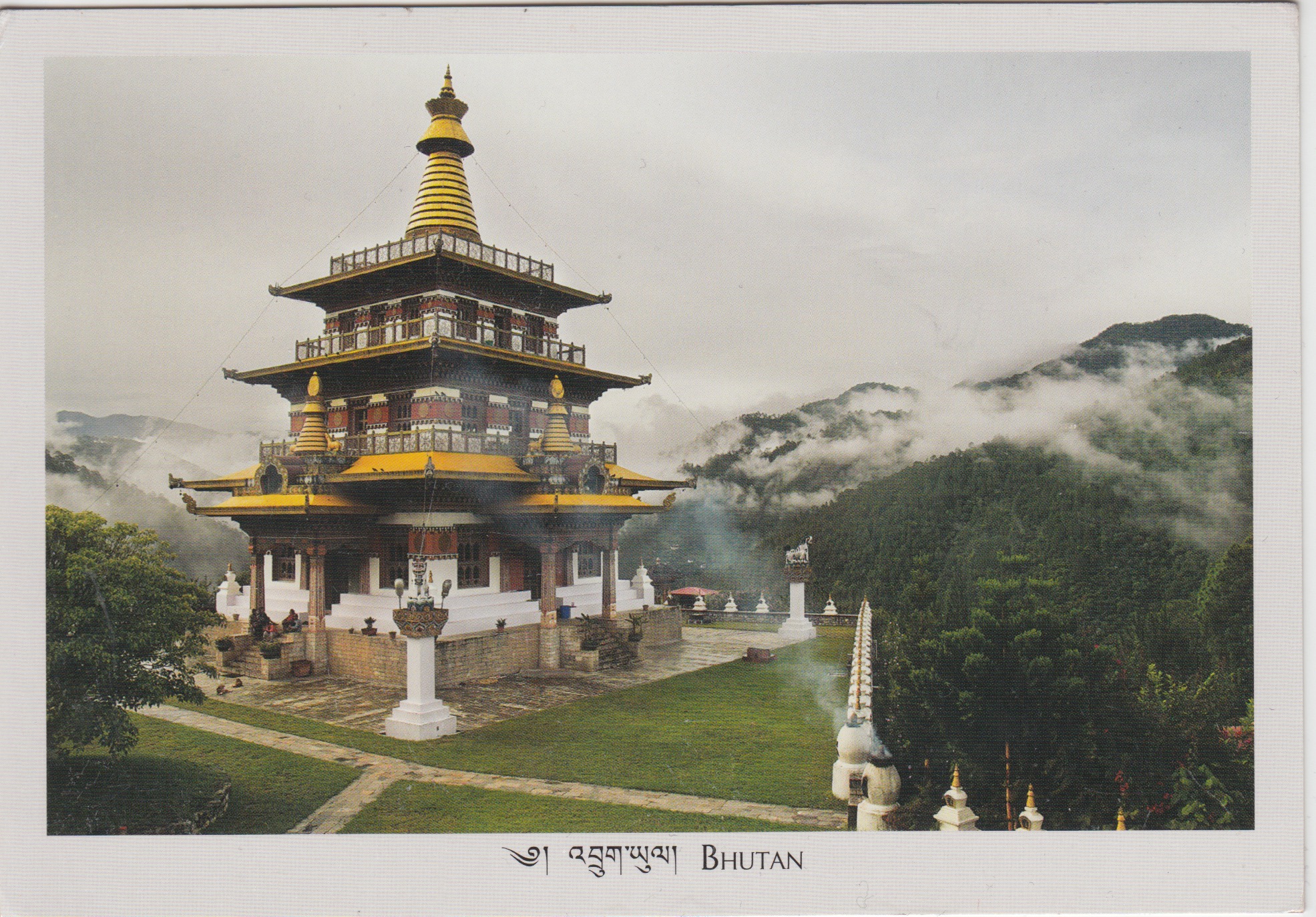 Můj vůbec první pohled z Bhútánu podnikl naprosto neuvěřitelnou cestu po světě. Byl omylem nejprve zaslán na karibské ostrovy Trinidad a Tobago, jak dokládá razítko tamější pošty. Teprve poté byl nasměrován správně do Prahy. Urazil tedy celkovou téměř neuvěřitelnou vzdálenost nejméně 22.900 kilometrů a přesto si nakonec našel cestu do té správné schránky. Zobrazuje buddhistický chrám Druk Wangyal Lhakhang, nacházející se v průsmyku Dochula, odkud je překrásný panoramatický výhled na Himaláje. Chrám se skládá ze 108 chortenů. Chrám je vyhledávaným místem nejen pro buddhisty, ale i pro místní lidi, kteří se zde setkávají a je vcelku běžné si mezi chorteny uspořádat piknik – prostor má tedy sakrální i veskrze světský charakter.