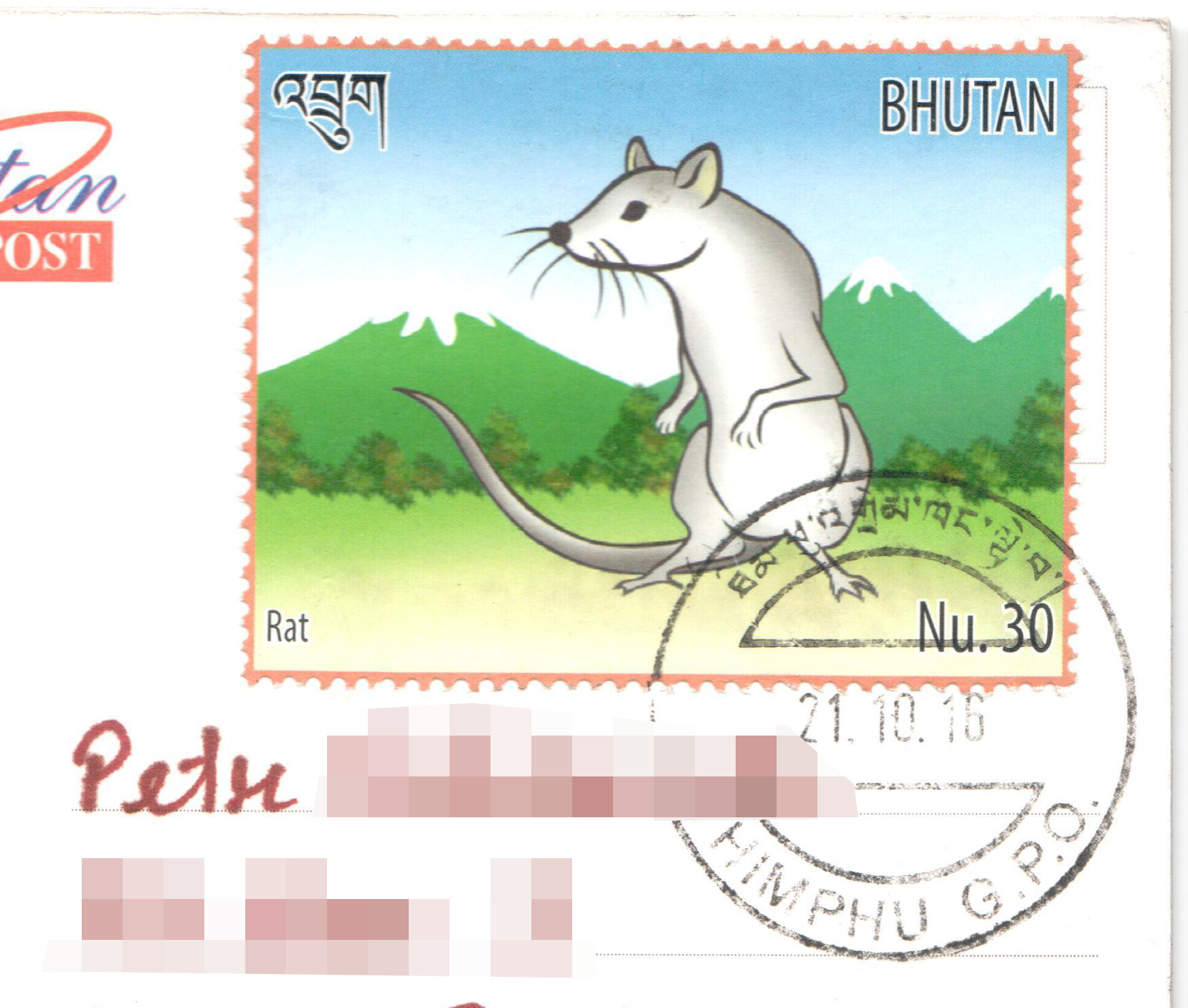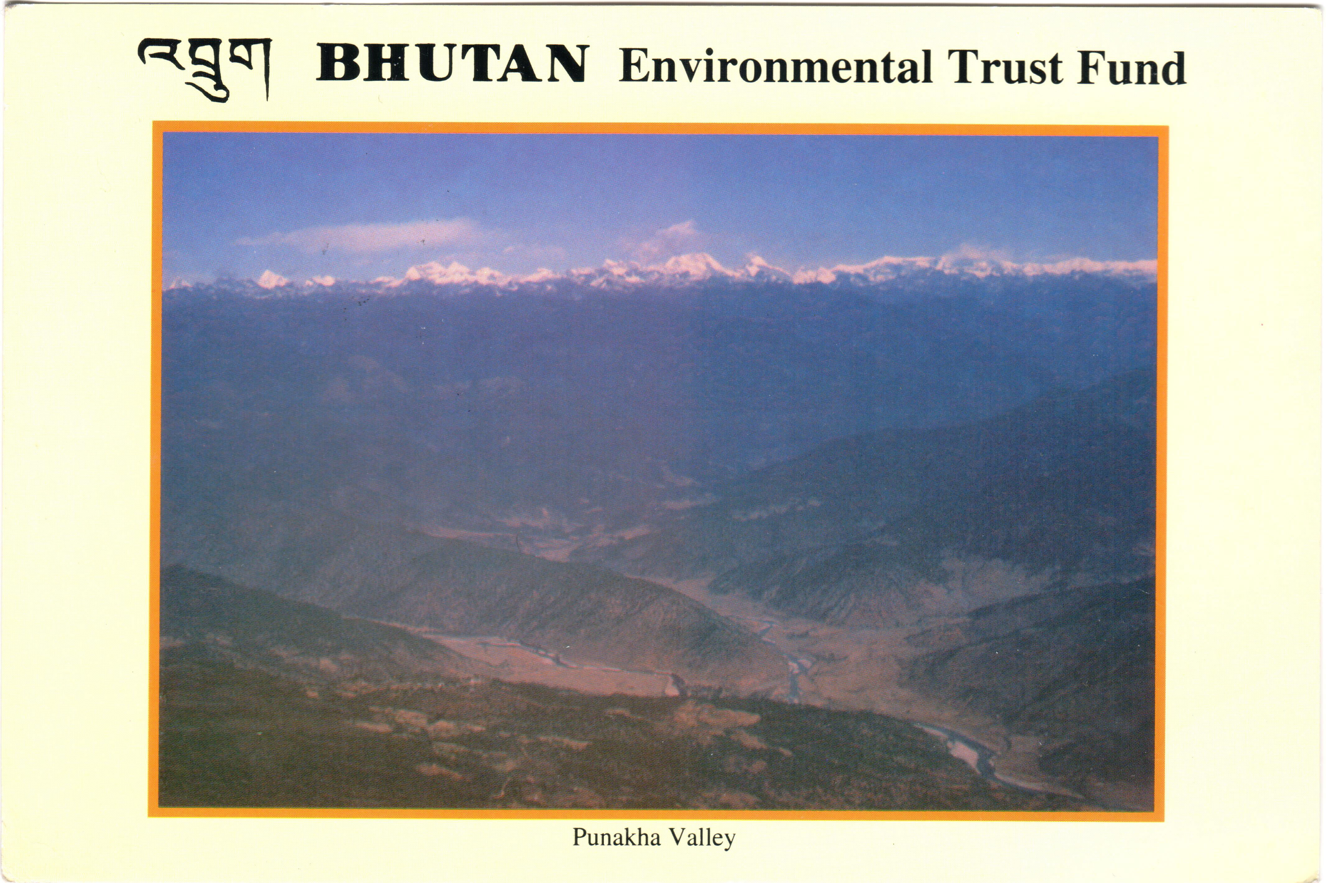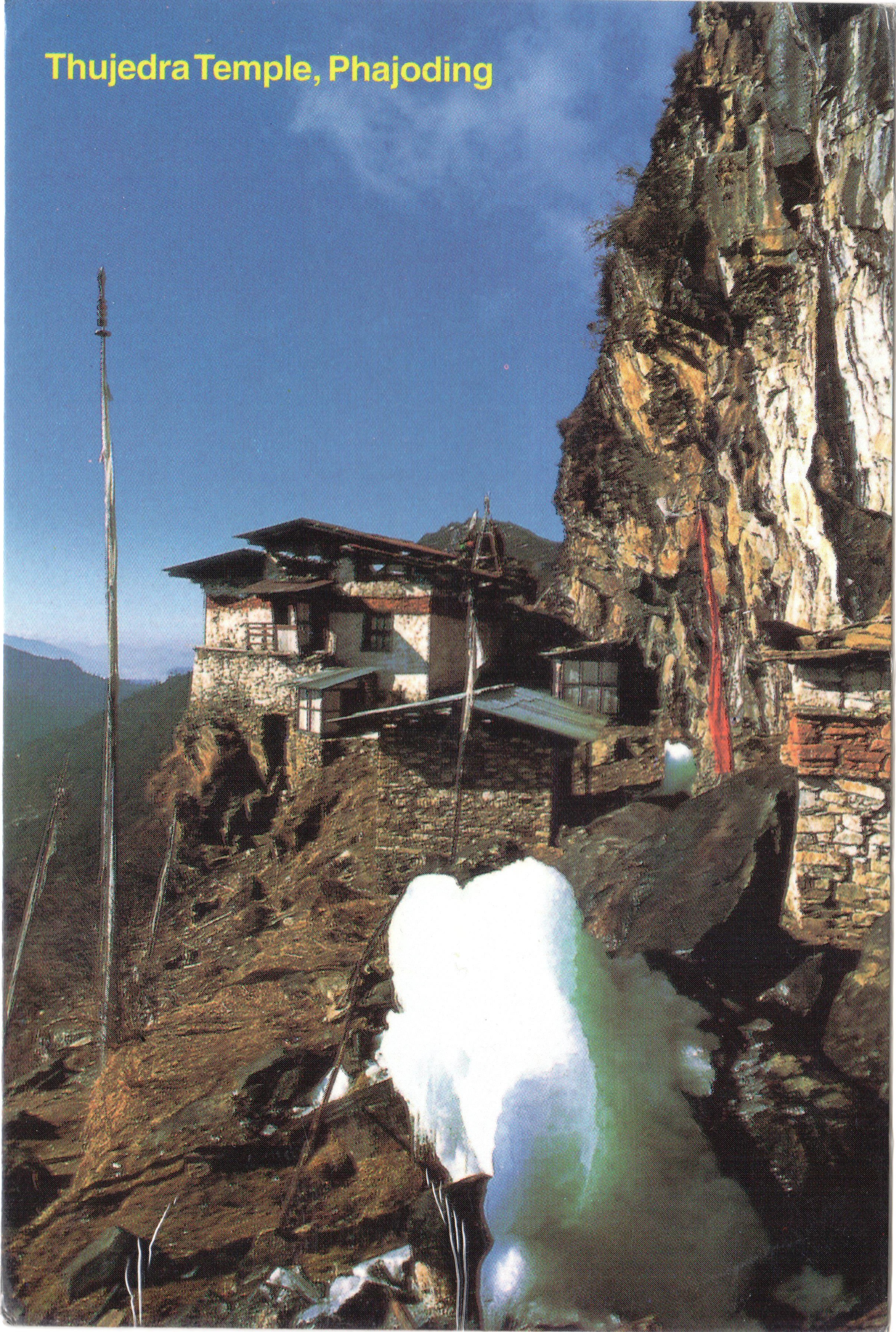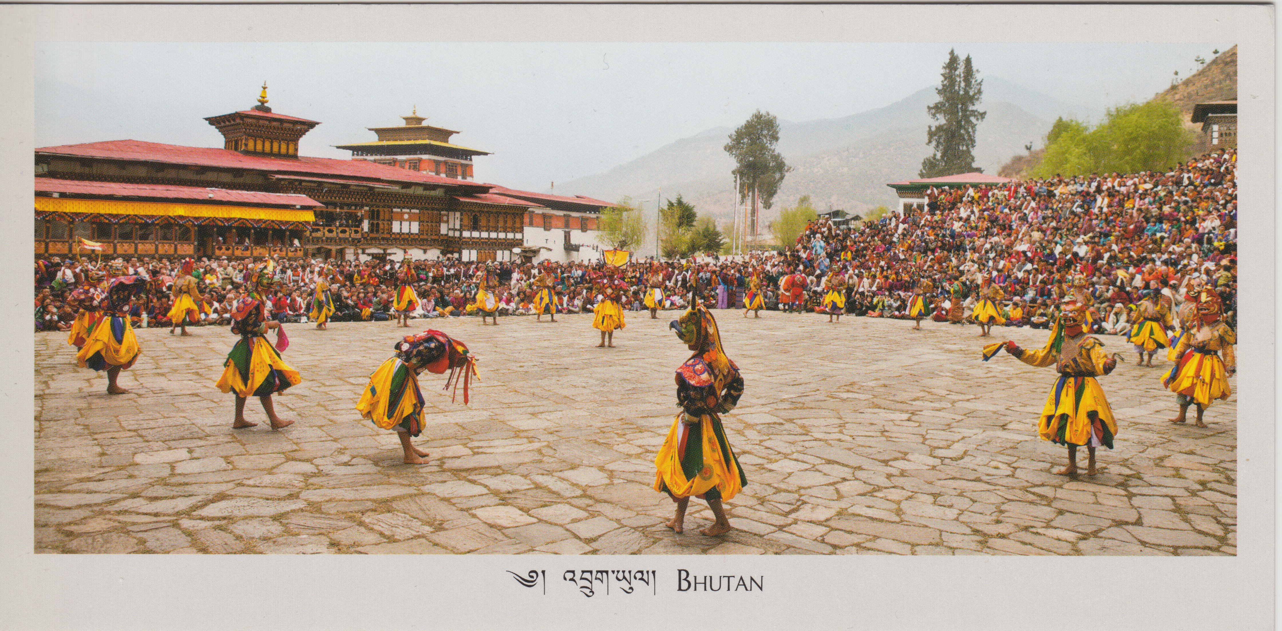 Můj vůbec první pohled z Bhútánu podnikl naprosto neuvěřitelnou cestu po světě. Byl omylem nejprve zaslán na karibské ostrovy Trinidad a Tobago, jak dokládá razítko tamější pošty. Teprve poté byl nasměrován správně do Prahy. Urazil tedy celkovou téměř neuvěřitelnou vzdálenost nejméně 22.900 kilometrů a přesto si nakonec našel cestu do té správné schránky. Zobrazuje buddhistický chrám Druk Wangyal Lhakhang, nacházející se v průsmyku Dochula, odkud je překrásný panoramatický výhled na Himaláje. Chrám se skládá ze 108 chortenů. Chrám je vyhledávaným místem nejen pro buddhisty, ale i pro místní lidi, kteří se zde setkávají a je vcelku běžné si mezi chorteny uspořádat piknik – prostor má tedy sakrální i veskrze světský charakter.