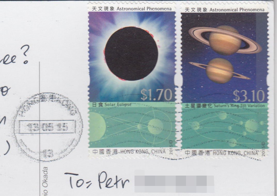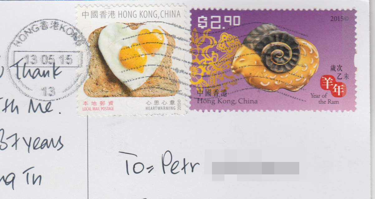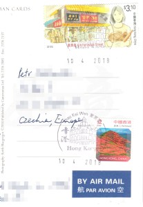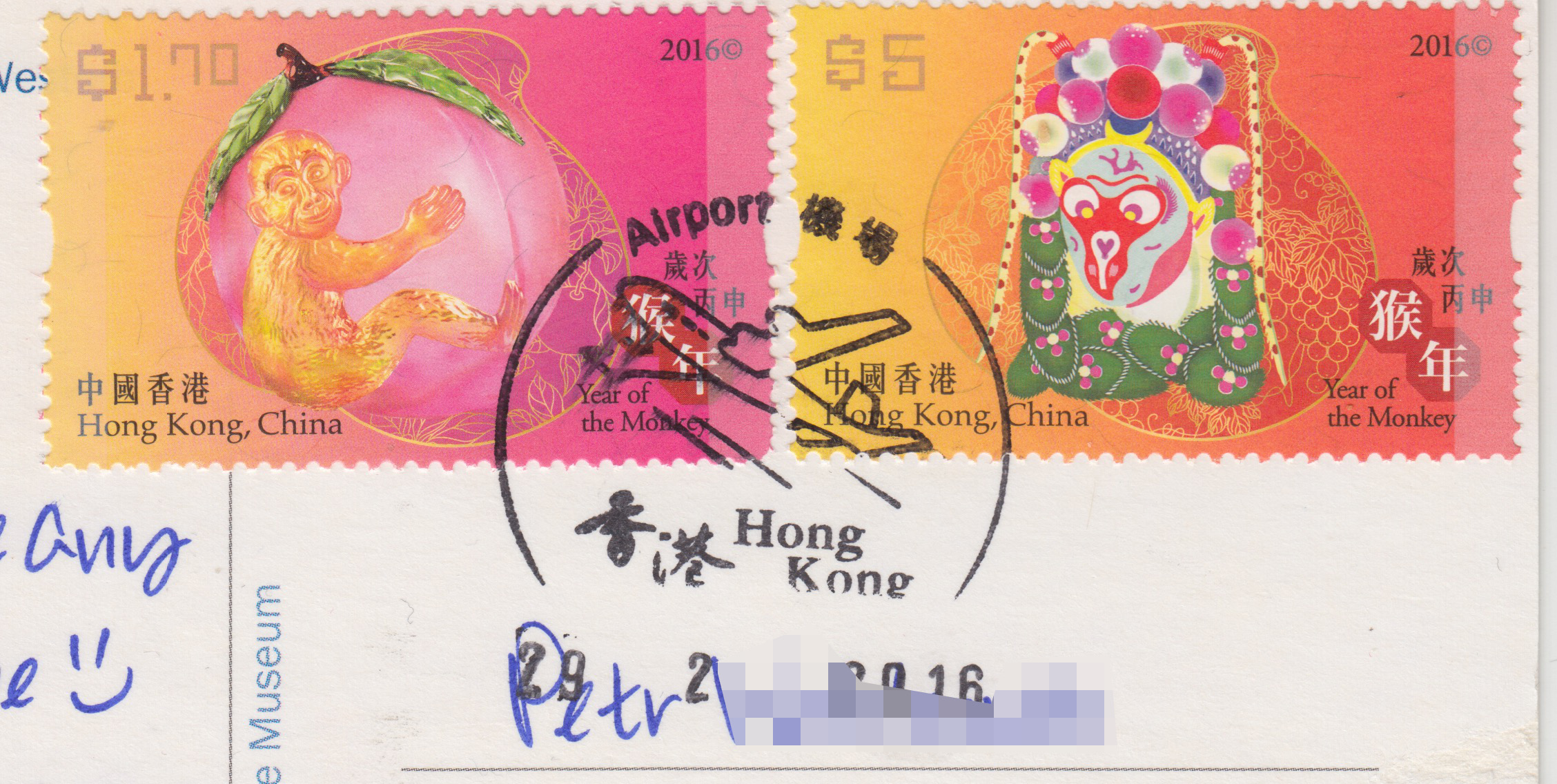Moje zatím poslední pohledy z Hong Kongu dorazily i s krásnými známkami v květnu 2016 od Kathy. Zobrazují krásné tradiční plachetnice v moderním hongkongském přístavu.