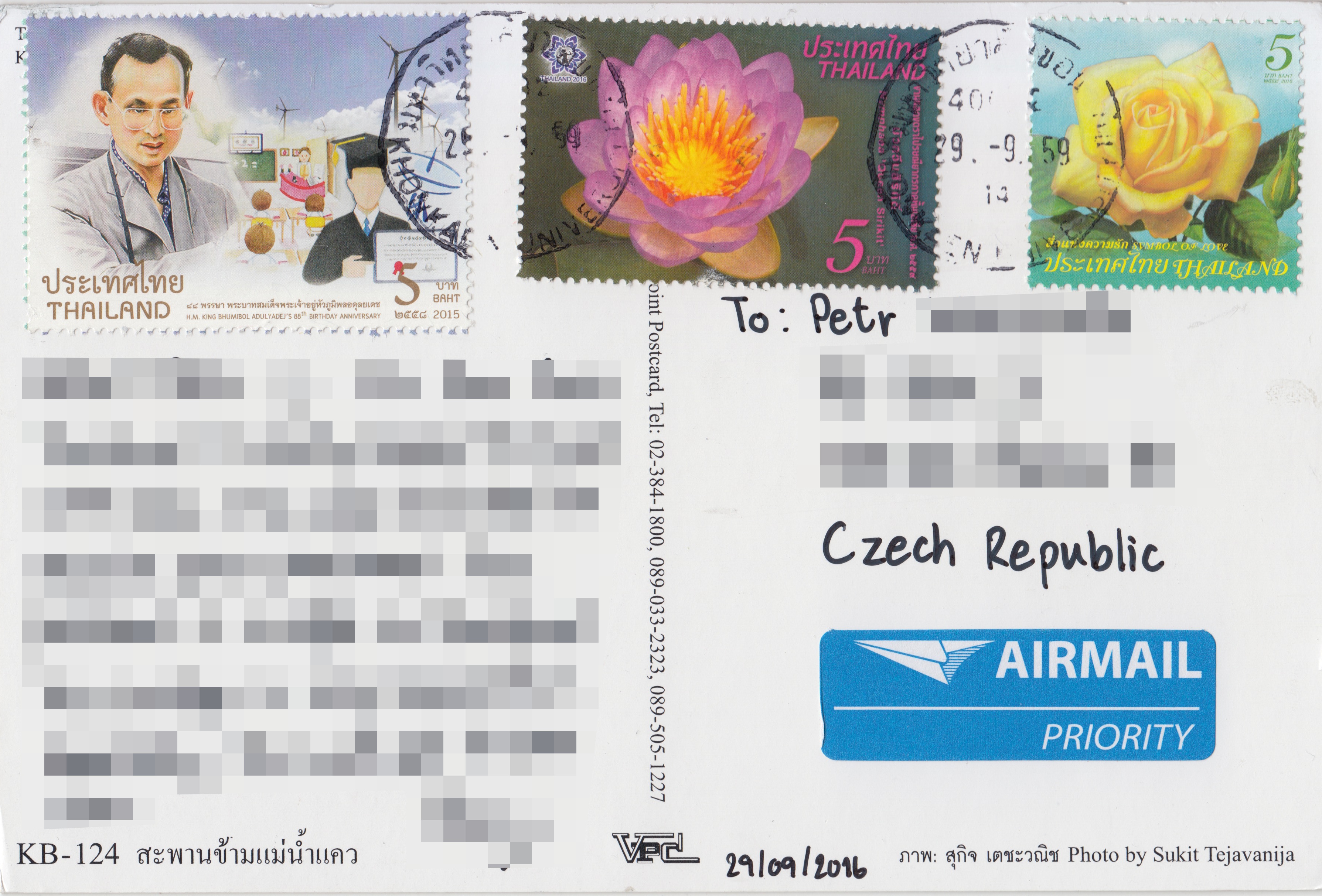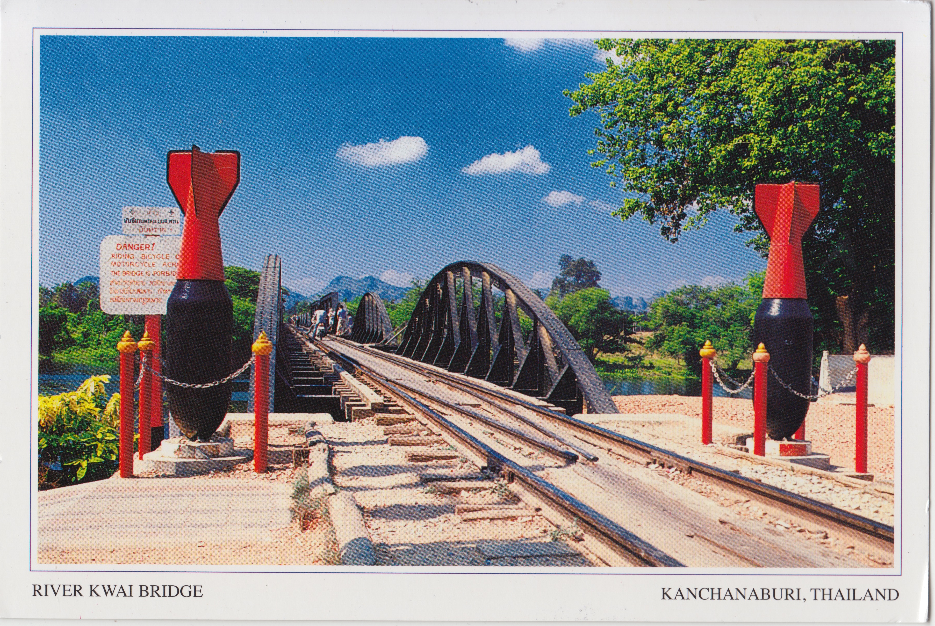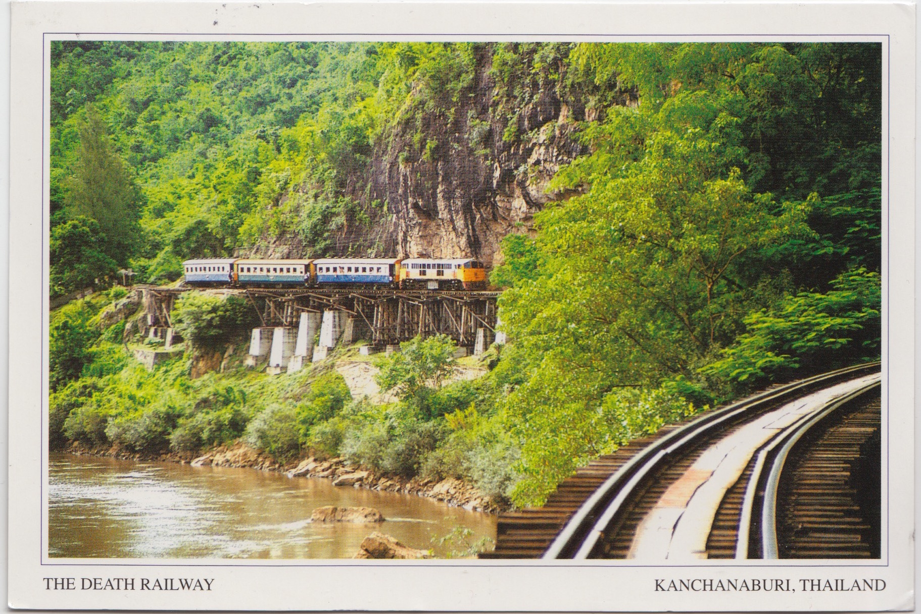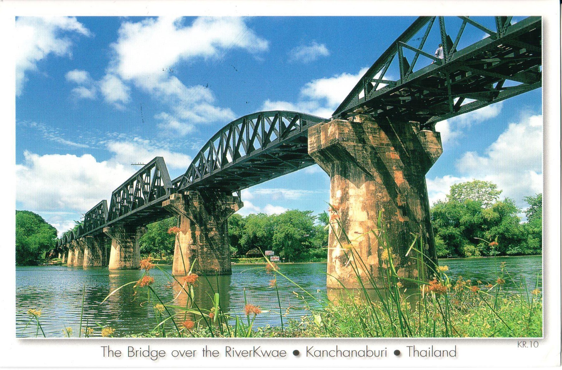 Každá sbírka pohlednic z Thajska by měla zahrnovat něco z Wat Phra Kaew, neboli Chrámu smaragdového Buddhy z Bangkoku. Z Thajska mám ovšem také několik pohledů z neslavně historicky proslulé “Železnice smrti”. Tak se nazývá barmsko-siamská dráha, je 415 kilometrů dlouhá železnice, spojující Ban Pong v Thajsku a Thanbyuzayat v současné Barmě. Byla celá postavena během roku 1943 japonskými okupačními silami, hlavně s využitím otrocké práce spojeneckých válečných zajatců. Mnoho jich během stavby zemřelo a železncie má velmi složitý profil. Její stavba, zahrnující šest velkých mostů a mnoho železničních estakád, byla mimořádně náročná. Stavba “Železnice smrti” byla popsána v proslulém románu Most přes řeknu Kwai, který se také dočkal skvělé filmové adaptace. Dráha je dodnes v provozu a v Kanchanaburi se nachází velký válečný hřbitov a památník.