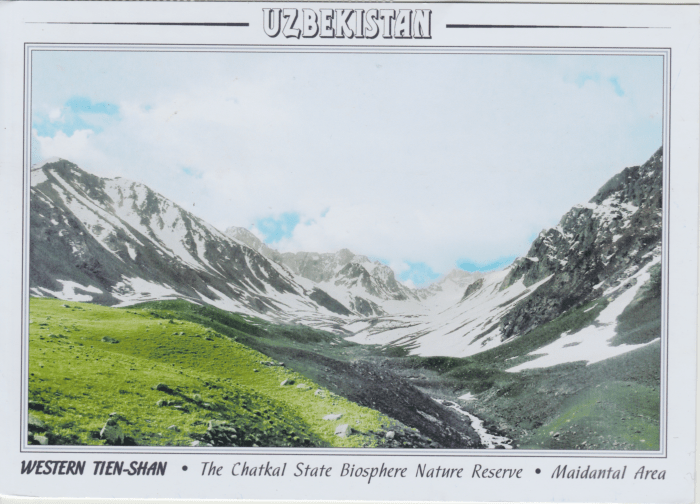 V úterý 19. června 2018 jsem dostal tuto krásnou pohlednici západní části pohoří Ťan-Šan. Název pochází z ujgurštiny a znamená Nebeské hory. Ťan Šan je silně zaledněné pohoří a obsahuje unikátní biosférické celky. Je to také místo, kde se vyskytuje vzácný irbis, levhart sněžný.
