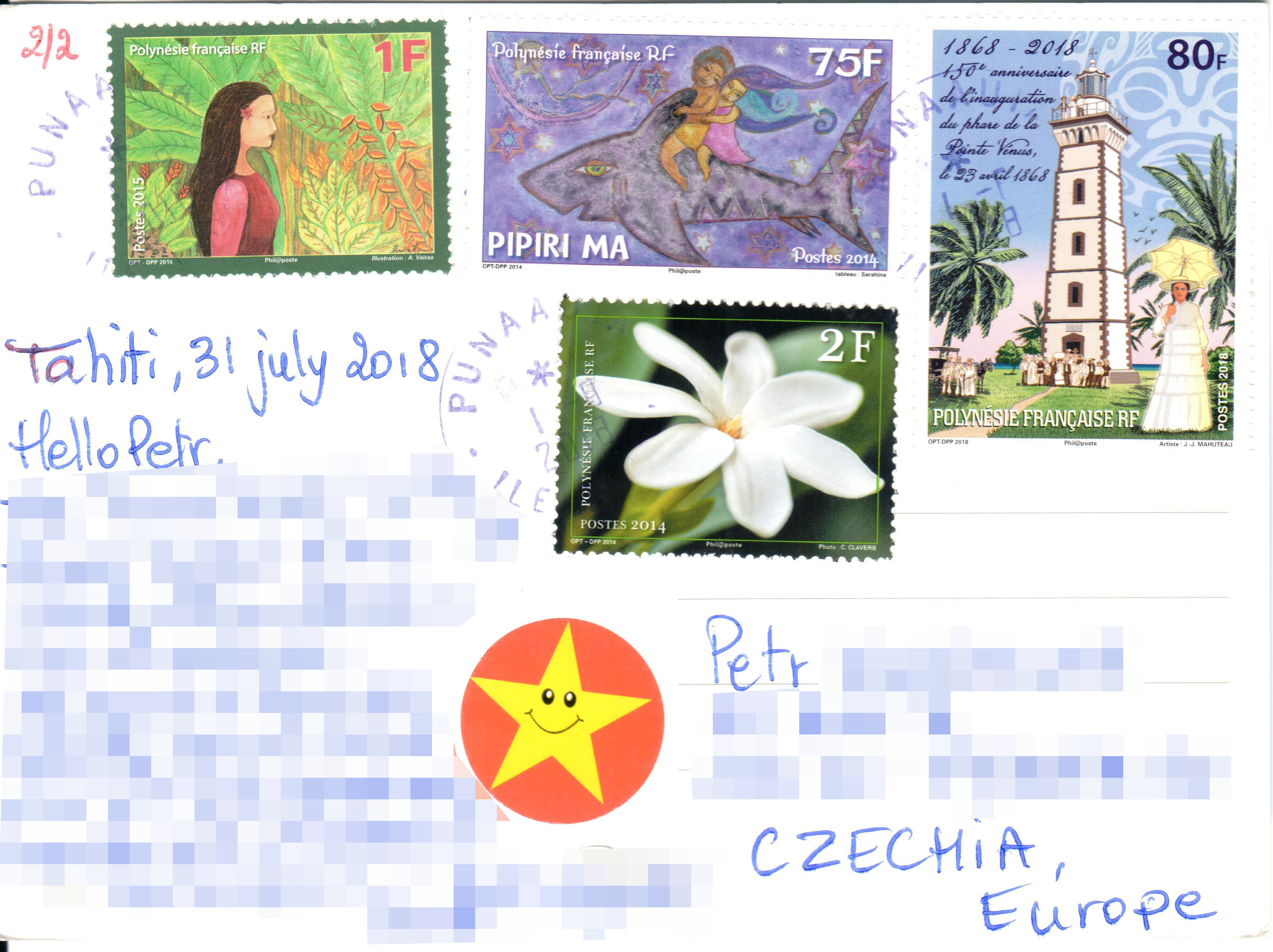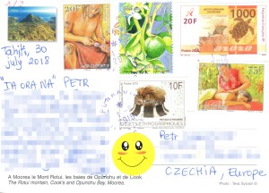 V pondělí 13. srpna 2018 jsem dostal dvě krásné pohlednice z Tahiti a blízkého okolí od Lea, který žije v městě Punaauia na ostrově Tahiti (který je na prvním pohledu). Na druhém je ostrov Moorea, který se nachází poblíž Tahiti a je proslulý krásnou modrou lagunou.