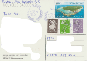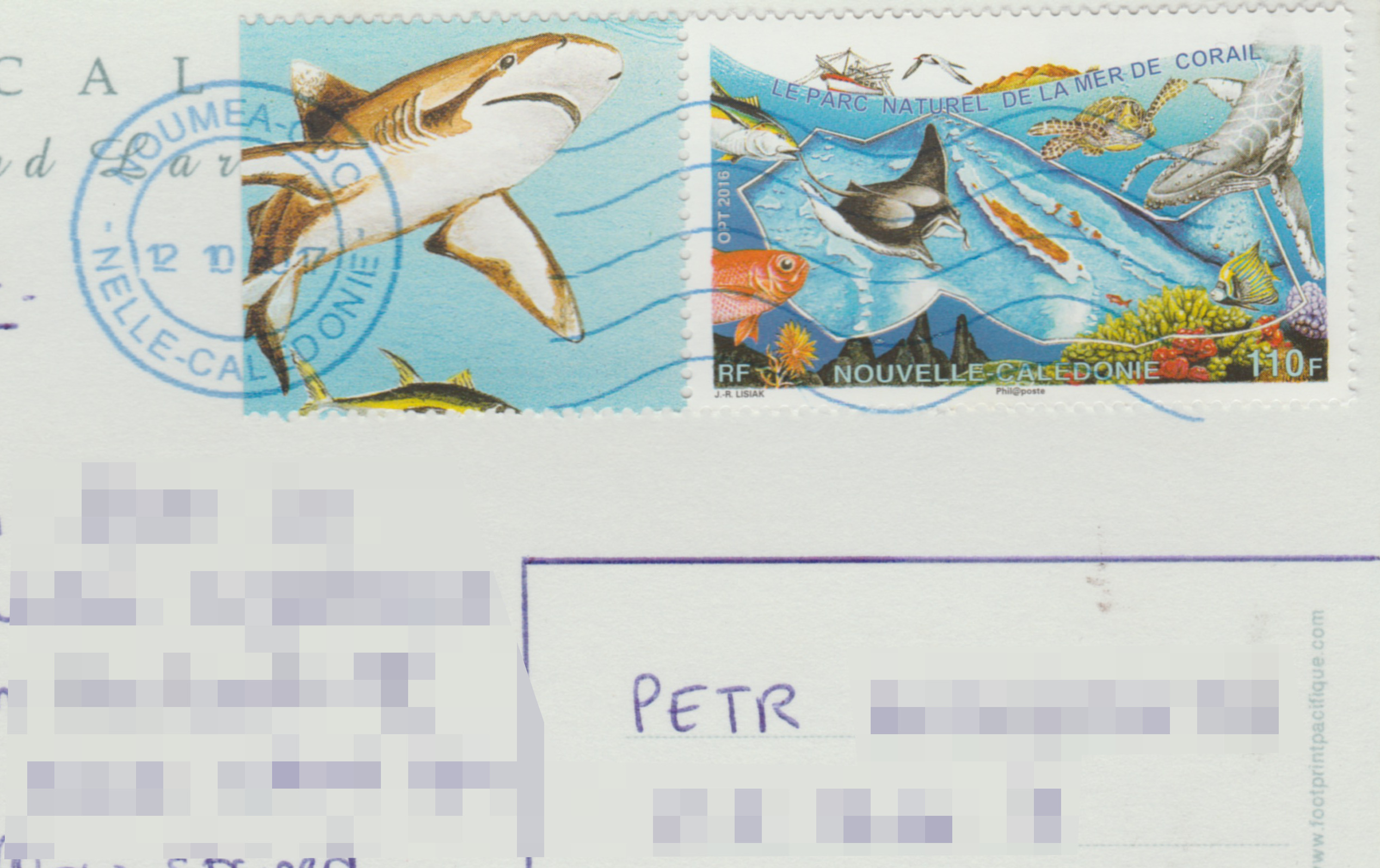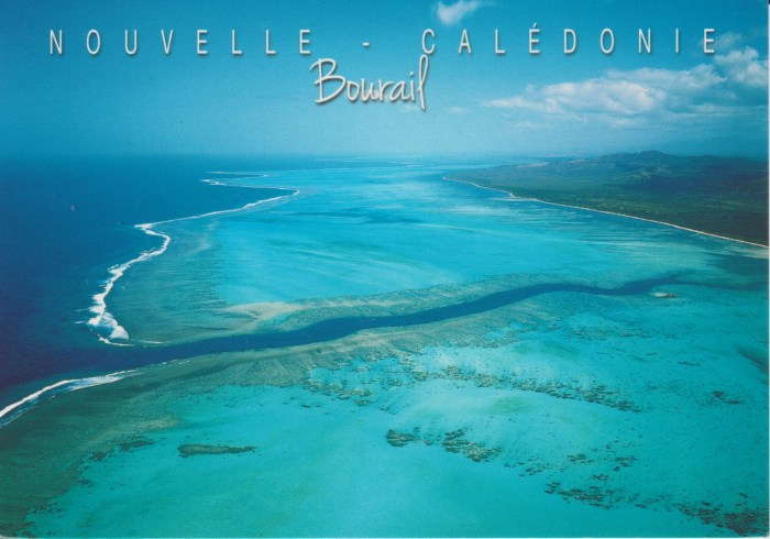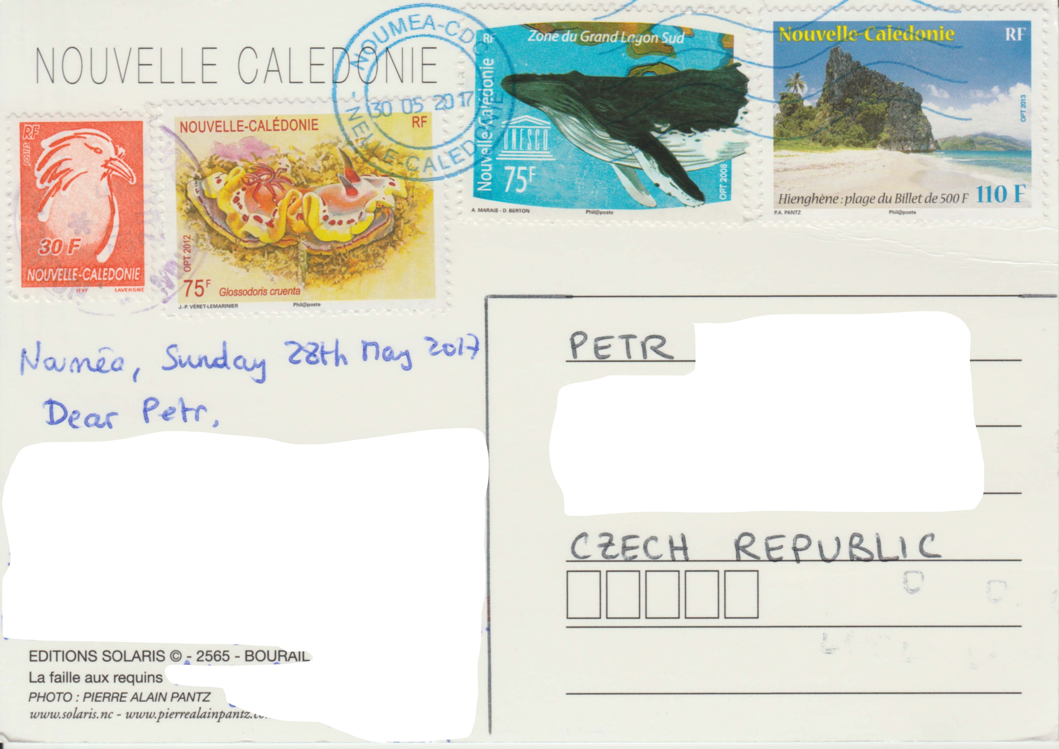 Druhý krásný pohled z Nové Kaledonie se po cestě zatoulala a cestoval do mé poštovní schránky od konce května až do pondělí 4. září 2017. Zobrazuje známý korálový útes v oblasti Bourail, vyhledávaný surfaři z celého světa, ale také spoustou žraloků.