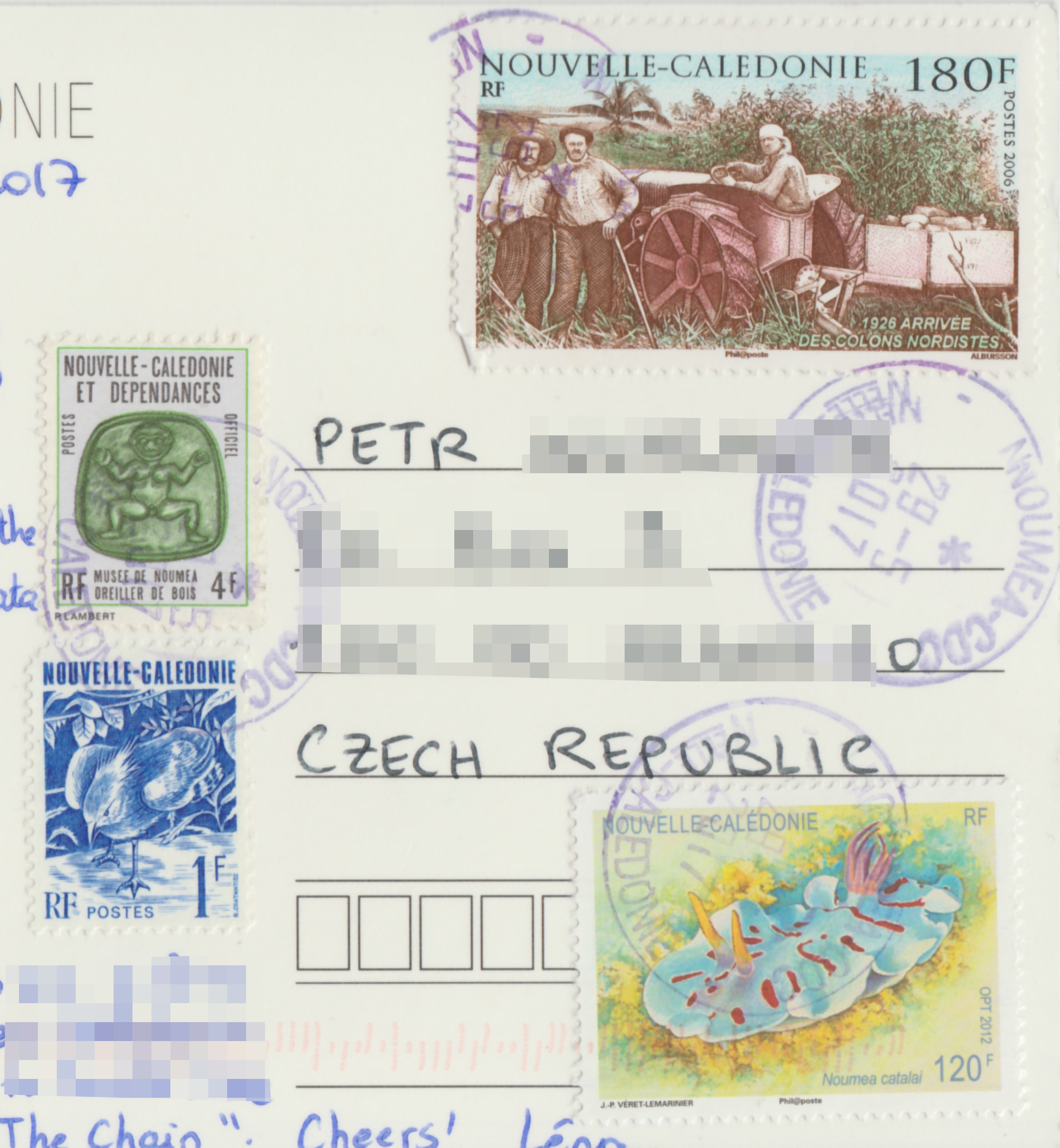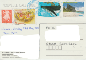 Nouméa je hlavním městem Nové Kaledonie. První krásný pohled z tohoto dalekého tichomořského místa do mé poštovní schránky dorazil ve čtvrtek 8. června 2017 a poslala mi jej Léna. Nová Kaledonie je zámořským územím Francouzské republiky a obývá ji přibližně 270 tisíc lidí. Skládá se z hlavního ostrova, nazvaného Grande Terre, dále z Chesterfieldových ostrovů, Souostroví Belep, Ostrova borovic a korálového souostroví Loyauté. Francie se oblasti zmocnila nominálně roku 1853 a poté, co byla roku 1864 na březích řeky Diahot objevena bohatá naleziště niklu, nastal obrovský rozmach jeho dolování. Původní obyvatelé, Kanakové, úplně odsunutí na okraj společnosti a uzavření do rezervací, povstali v několika vzpourách v roce 1878 a 1917. Francouzské občanství bylo místním lidem přiznáno až v roce 1953. Dnes je Nová Kaledonie vyhledávaným turistickým místem.