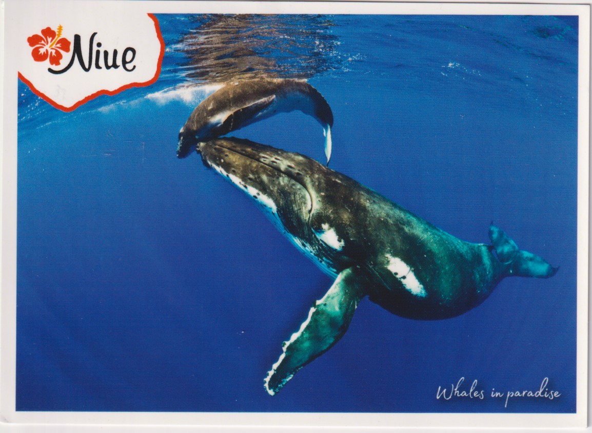 První pohlednice zdůrazňuje skutečnost, že vody kolem Niue slouží jako tradiční zóna pro velké množství velryb keporkaků (Megaptera novaeangliae), kteří sem pravidelně migrují, páří se a přivádí na svět potomstvo. V tomto regionu jsou přísně chráněni. Mezinárodní komerční lov keporkaky téměř vyhubil a v roce 1966, kdy došlo k zákazu, se jejich populace scvrkla na méně než 5000. Dnes činí téměř 135 000 kusů. Keporkaci jsou proslulí extrémně efektivním sluchem a schopností zpěvu mimořádně komplexních a dlouhých velrybích písní, které slouží podle současných vědeckých poznatků hlavně sociálnímu učení a upevňování vztahů. Keporkaci jsou také známí tím, že aktivně provádí skupinový agresívní “mobbing” kosatek a velkých žraloků, s cílem odehnat je a zabránit jim v lovu mláďat, jiných velryb či delfínů. Keporkaci jsou tak známí touto rozsáhlou praxí vnitro- i mezidruhové vzájemné pomoci a pospolitosti.