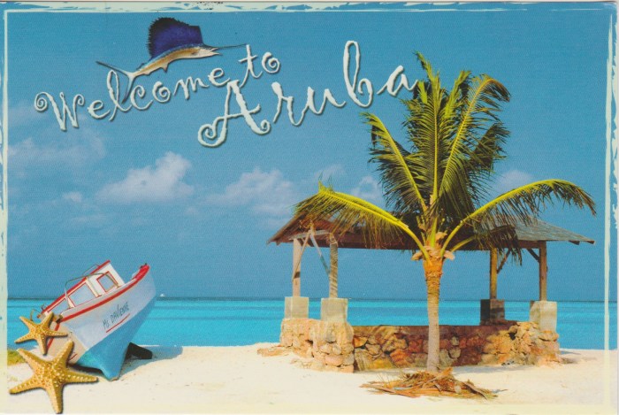 Ve středu 15. března 2017 jsem dostal první pohlednici z ostrova Aruba. Ten má status ustavující země Nizozemského království a od roku 1983 trvají dlouhodobé úvahy a diskuse o plné nezávislosti. Aruba se rozkládá severně od pobřeží Venezuely a má přiližně 32 kilometrů na délku a 10 kilometrů na šířku a obývá jej něco málo nad sto tisíc lidí. Hlavním zdrojem příjmů pro ostrovany je stejně jako v případě ostatních karibských ostrovů turistika.