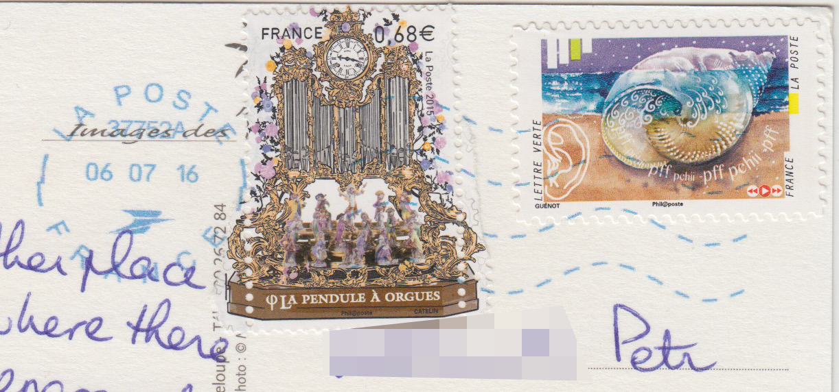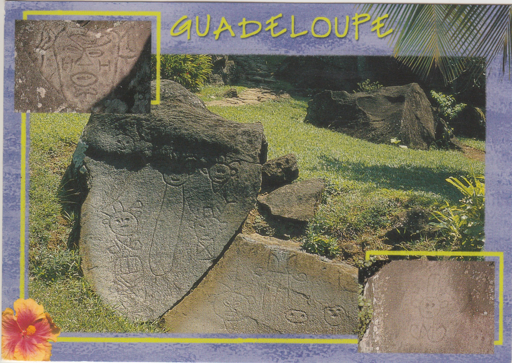 Guadeloupe má krásnou tropickou přírodu a je oblíbenou turistickou destinací. Ostrovy obývá něco málo více, než 400 tisíc lidí. Další dva pohledy z Guadelupe jsem dostal 12. července 2016. Na razítku můžete vidět ROC kód 37752A, což znamená poštu ve městě Les Abymes na ostrově Grande Terre. Na pohlednicích je tradiční mlýn na cukrovou třtinu a pak předkolumbovské skalní rytiny původních obyvatel kmene Arawak. Dnes jejich tradičním jazykem Lokono Dian hovoří už jen 2.500 lidí v Karibiku, v deltě Orinoka a ve Francouzské Guayaně.