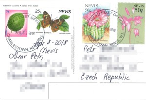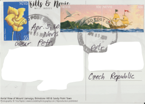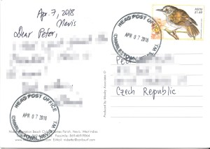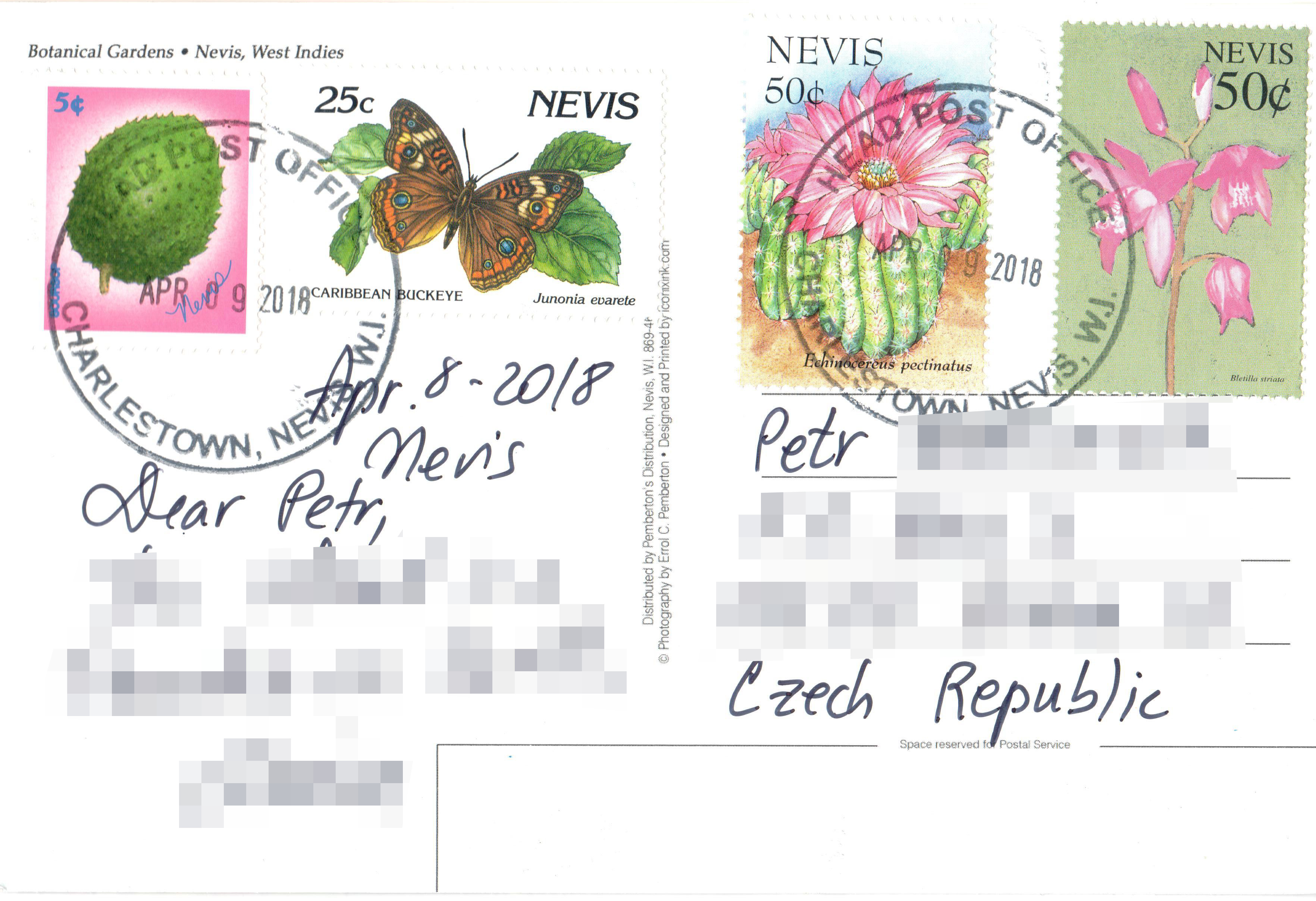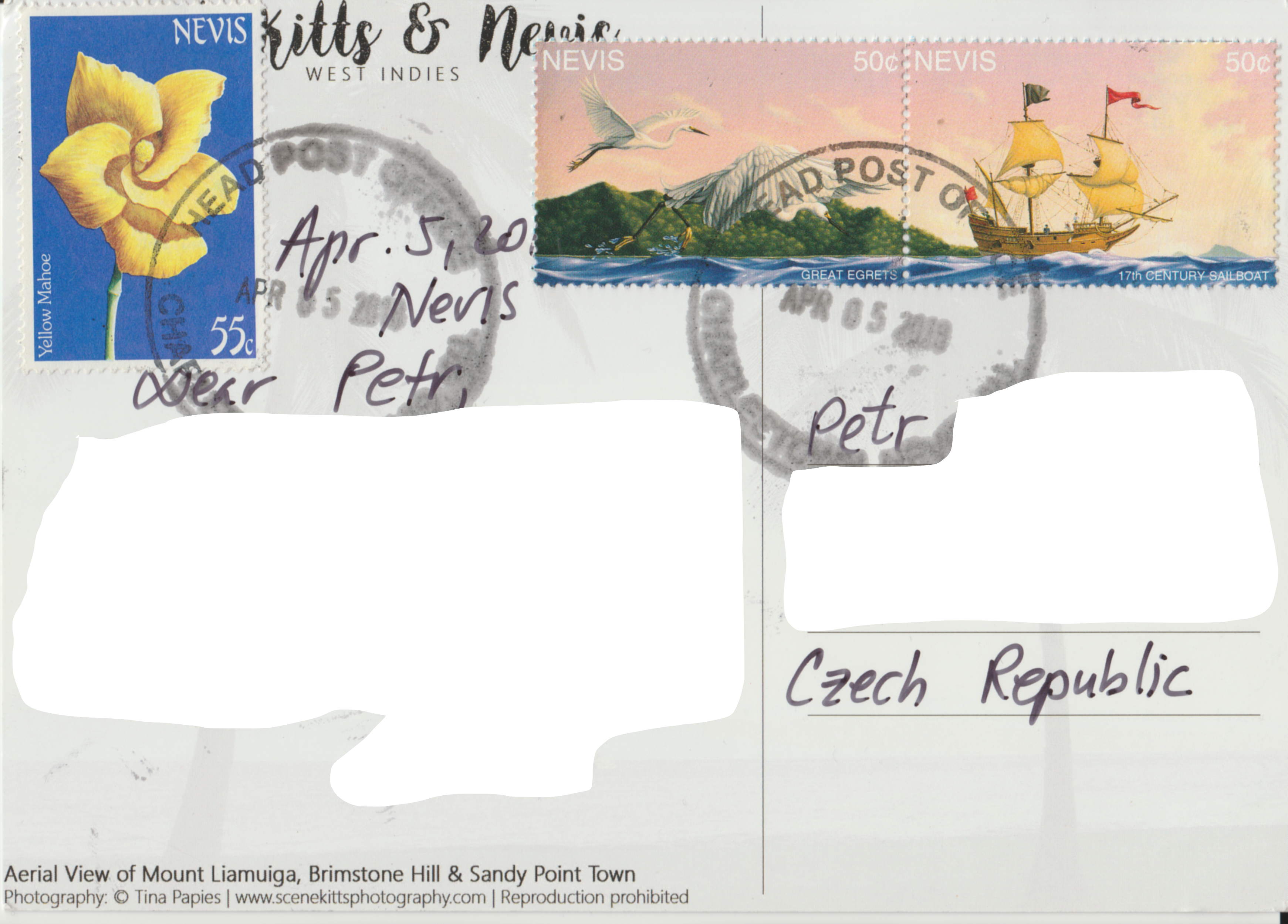 V pátek 20. dubna 2018 jsem dostal do své poštovní schránky dvě pohlednice z ostrova Nevis, součásti Federace Svatého Kryštova a Nevisu. Ostrov je menším sídlem ze dvou a od Sv. Kryštofa jej odděluje dvoukilometrový mělký průliv. Žije na něm přibližně 11 tisíc lidí a ostrov zhruba kónického tvaru má ve svém středu neaktivní vulkanický kužel. Ostrov sdílí historické osudy se svým větším sousedem. Od 17. století byl Nevis jedním z center pěstování cukrové třtiny, která na zdejších plantážích měla vysokou kvalitu a byla vysoce ceněna. Nevis se tak za britské správy stal jedním z center Atlantského obchodu s otroky, jednoho z největších historických zločinů proti lidskosti a přes něj bylo do Karibiku násilně dovezeno mnoho set tisíc Afričanů. Již na konci 17. století plantážníci z ostrova Nevis platili každoroční daň z počtu otroků několikanásobně vyšší, než všechny ostatní britské karibské kolonie dohromady a po roce 1700 zajišťoval ostrov Nevis více než 20% produkce cukru v rámci celého britského impéria. Dnes z ostrova probíhá prakticky neustálá intenzivní emigrace, hlavně do USA, každým rokem mizí přibližně 1% obyvatel. Zásadním zdrojem příjmů je již jen turistika.