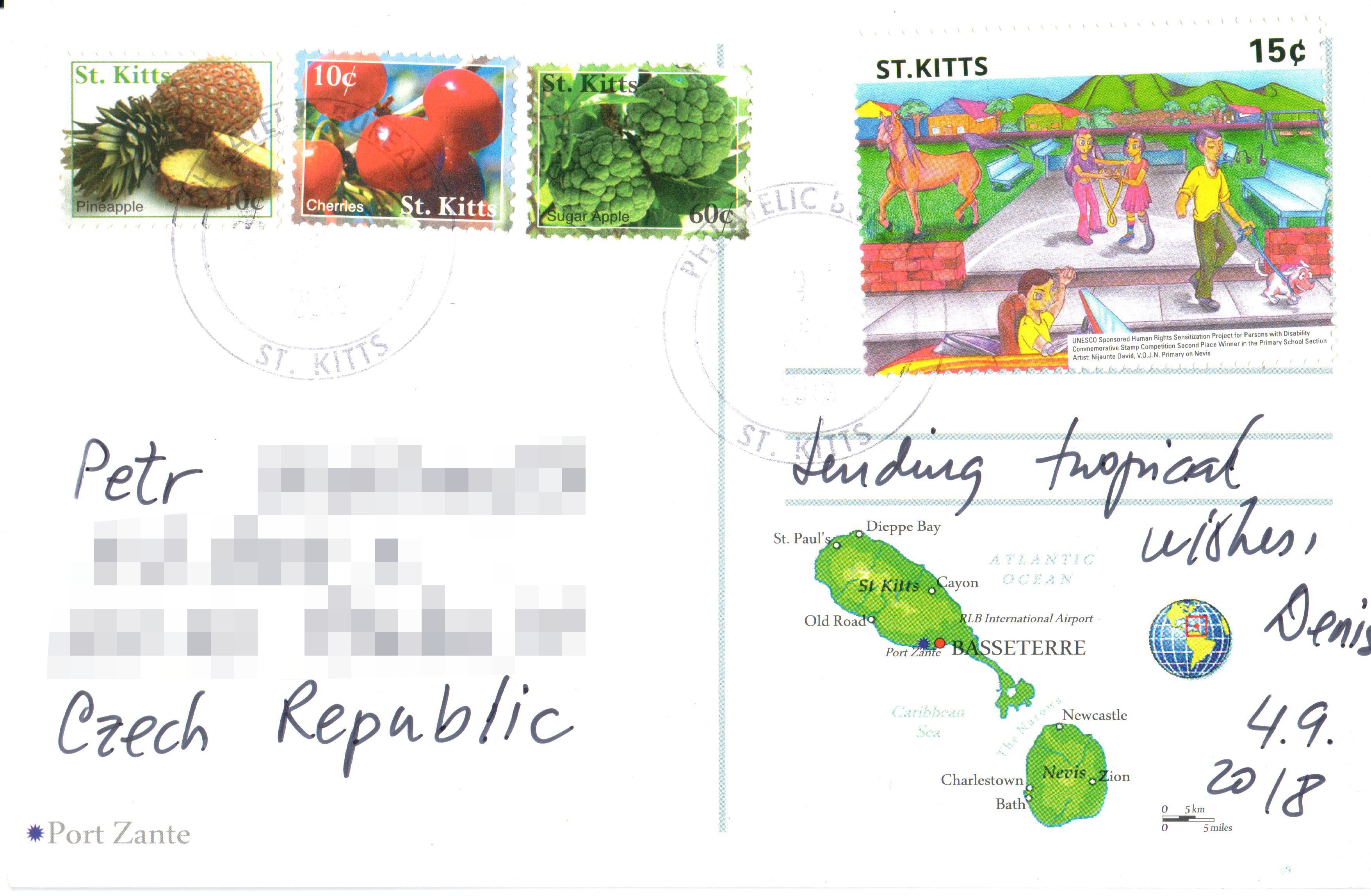 V pátek 20. dubna 2018 jsem do své poštovní schránky obdržel vůbec první pohlednici z ostrova Saint Kitts. Tento ostrov je součástí státního subjektu Federation of Saint Christopher and Nevis, neboli Federace ostrovů Svatý Kryštof a Nevis, ale každý z nich má vlastní poštovní službu a známky. Federace je součástí britského Commonwealthu a dříve k ní patřila i britská dependence Anguilla. V předkolumbovské době ostrov obývali indiáni etnika Kalinagua a nazývali jej Liamuiga. Kryštof Kolumbus zpozoroval Nevis poprvé v roce 1493 a jeho název Nevis je zkomoleninou původního španělského názvu Nuestra Señora de las Nieves neboli Panna Marie na sněhu, jehož původ je obtížně vysvětlitelný. V roce 1623 se na ostrovech usadili angličtí a francouzští kolonisté, kteří o tři roky později zahájili genocidní tažení proti indiánům etnika Kalinagua a v roce 1629 ostrov obsadili znovu Španělé, kteří zničili ostatní evropská sídla jen proto, aby jejich existenci o rok později znovu smluvně umožnili. Anglie a Francie poté z obou ostrovů vytvořily základnu pro další expanzi do Karibiku a ekonomický a sociální vzor otrokářské plantážnické ekonomiky, založené zejména na pěstování cukrové třtiny. Saint Kitts a Nevis dosáhly nezávislosti až v roce 1983 a jsou nejmladším samostatným státem v Severní Americe. Mezi oběma ostrovy neustále panuje politické napětí, kdy správa Nevisu obviňuje správu většího ostrova, že upřednostňuje jeho zájmy. Základním zdrojem příjmů pro oba ostrovy je dnes turistika.