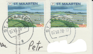 Na začátku srpna 2021 jsem od Denise dostal tento další raritní pohled z holandské částí ostrova Sint Maarten, zachycující legendární pláž Maho Beach, těsně přiléhající k přistávací dráze Princess Juliana International Airport. Přestože místní úřady na místo nainstalovaly varovnou tabuli, upozorňující na nebezpečí, plynoucí ze proudění, způsobeného přistávajícími letadly, avšak přesto se stále najdou stovky turistů, kteří chtějí získat extrémní zážitek letadla, přistávajícího těsně nad jejich hlavami.