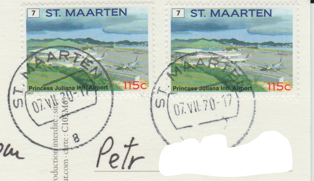 Na začátku srpna 2021 jsem od Denise dostal tento další raritní pohled z holandské částí ostrova Sint Maarten, zachycující legendární pláž Maho Beach, těsně přiléhající k přistávací dráze Princess Juliana International Airport. Přestože místní úřady na místo nainstalovaly varovnou tabuli, upozorňující na nebezpečí, plynoucí ze proudění, způsobeného přistávajícími letadly, avšak přesto se stále najdou stovky turistů, kteří chtějí získat extrémní zážitek letadla, přistávajícího těsně nad jejich hlavami.