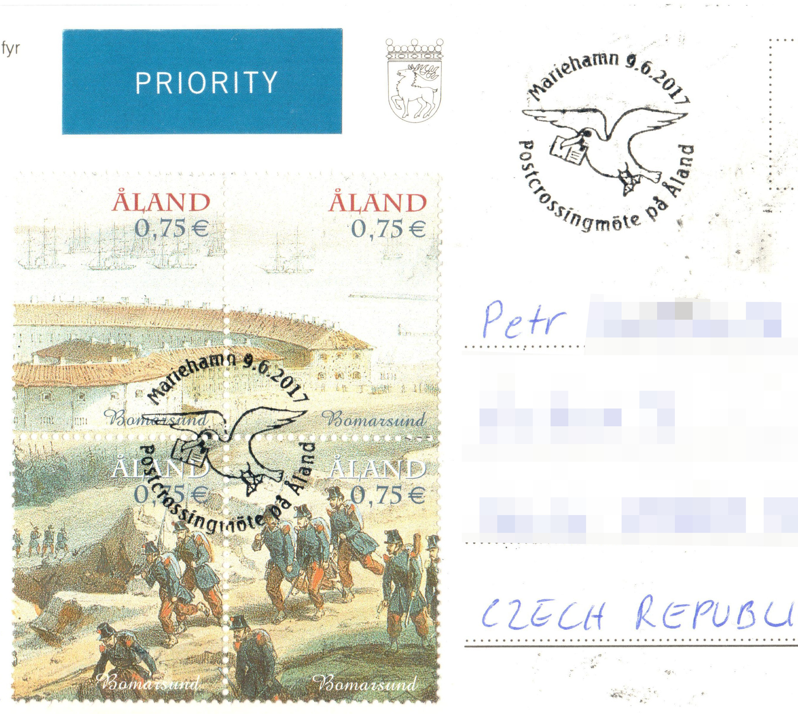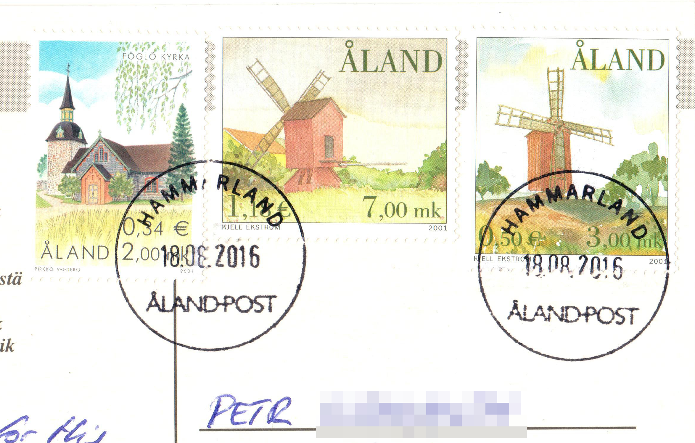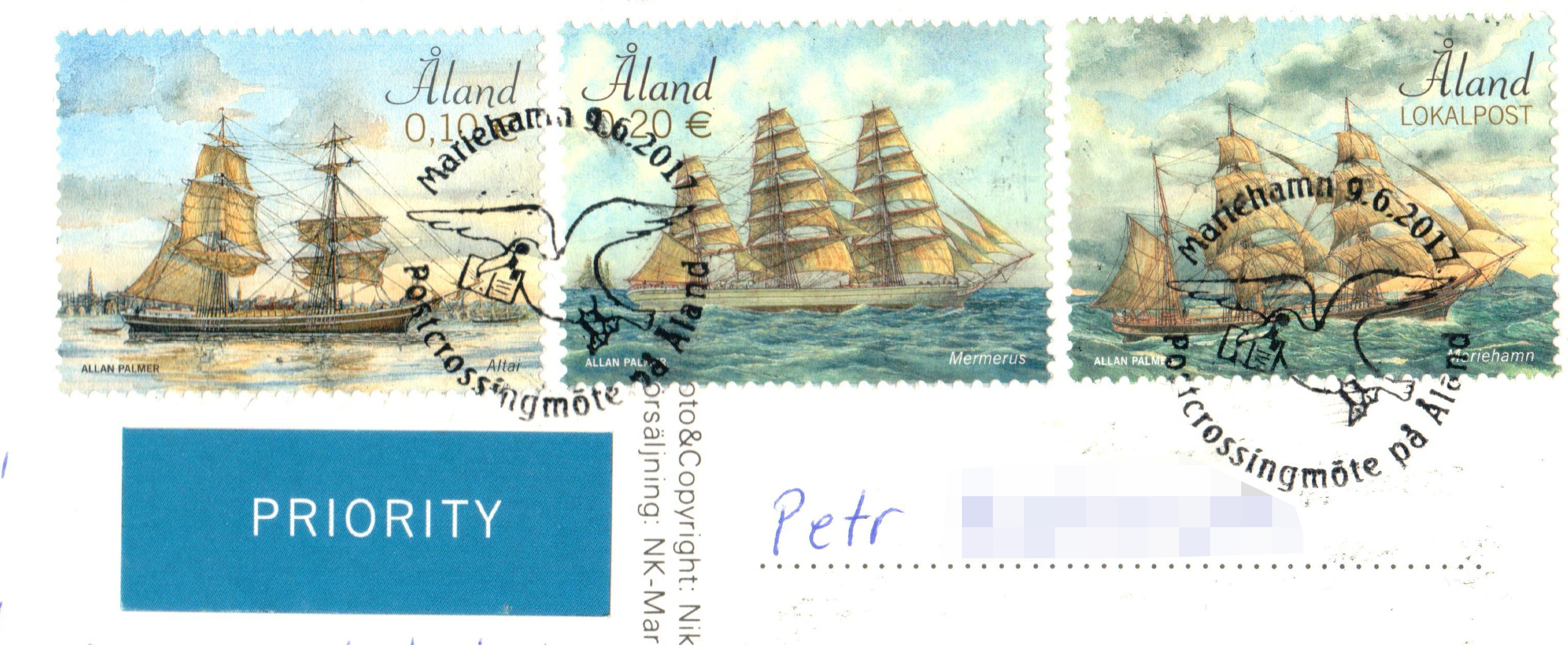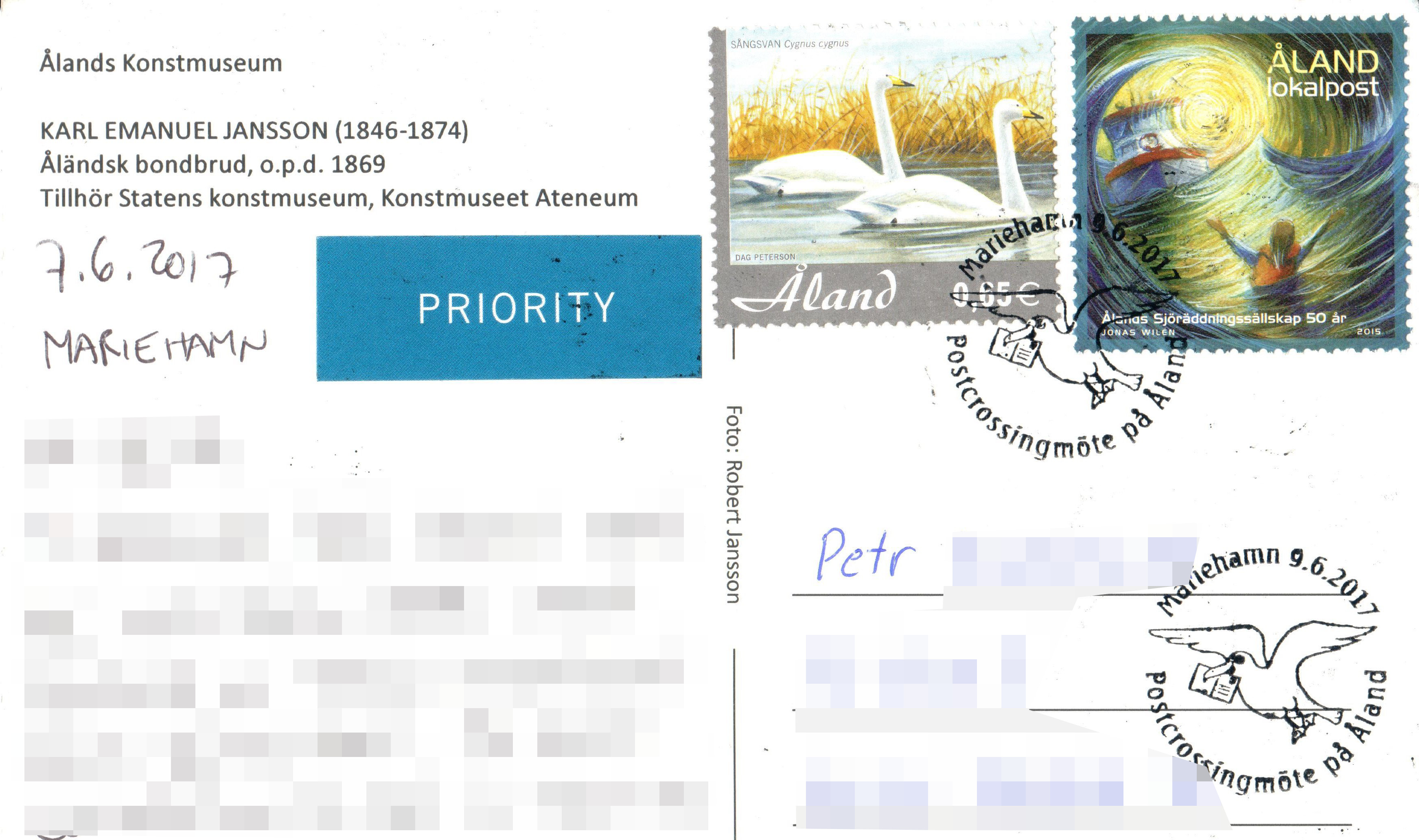 Na konci května 2017 jsem měl to štěstí a znovu strávil týden na Alandských ostrovech. Ještě větší štěstí mě potkalo v té souvislosti, že týden po mém odjezdu se na místě konal postcrosserský sraz a vděčím za mnohé skvělé finské postcrosserce Nině, která mi poslala tyto krásné pohledy, na kterých jsou tedy příležitostná razítka, která vznikla právě pro tento sraz. Pokud by to bylo jen trochu možné, na Alandy bych se okamžitě odstěhoval.