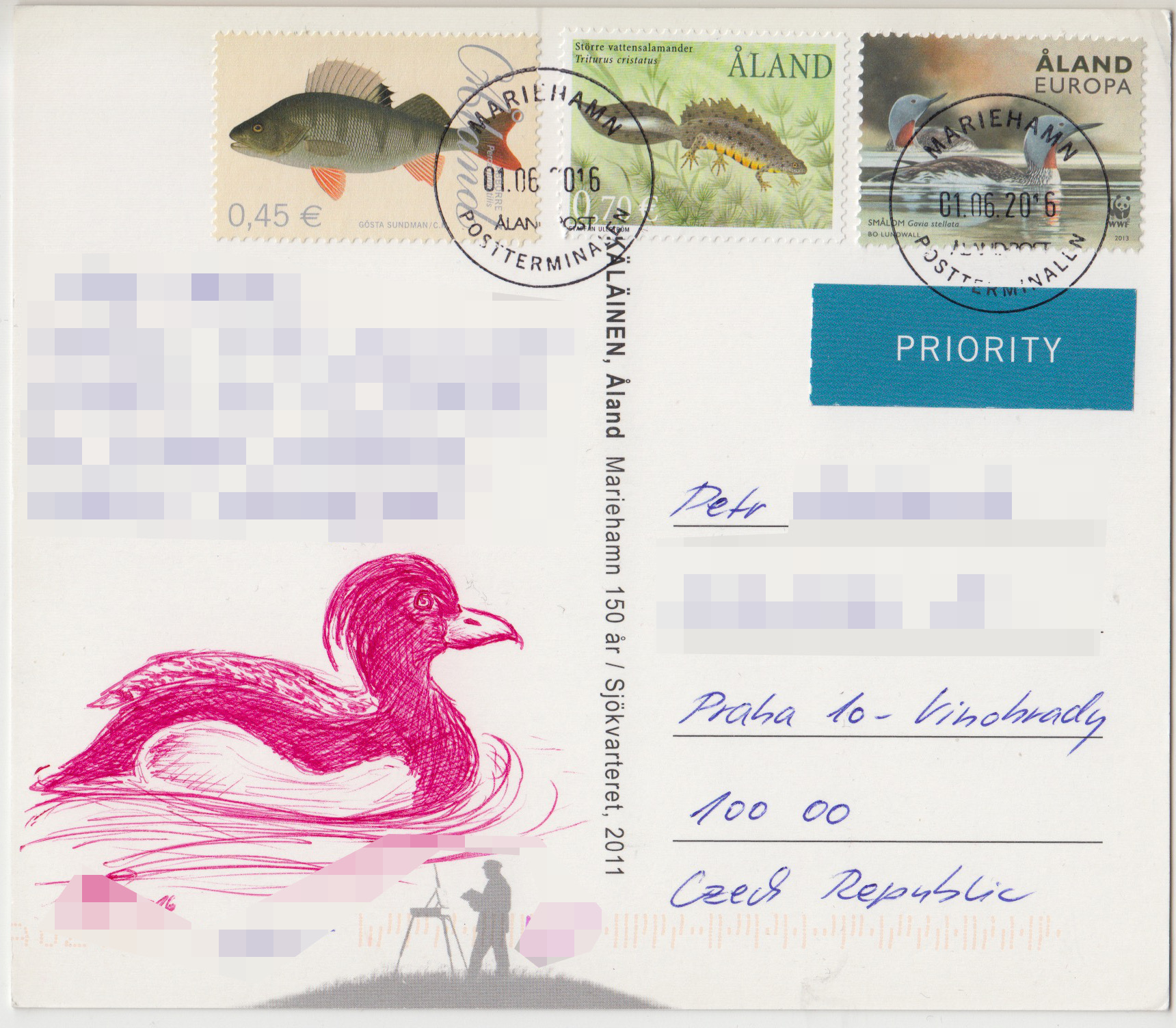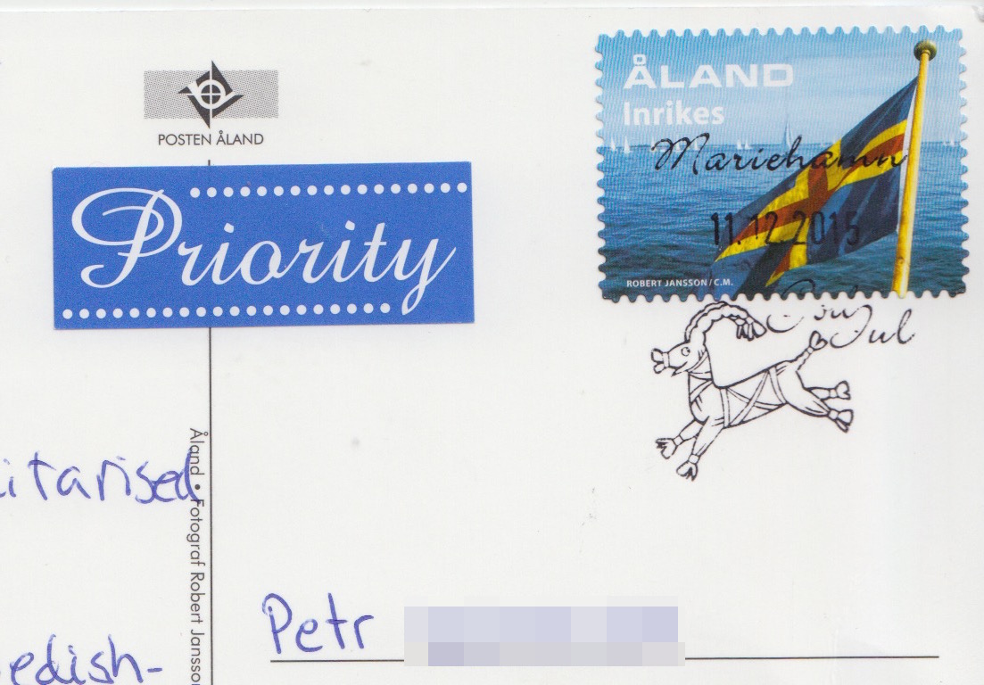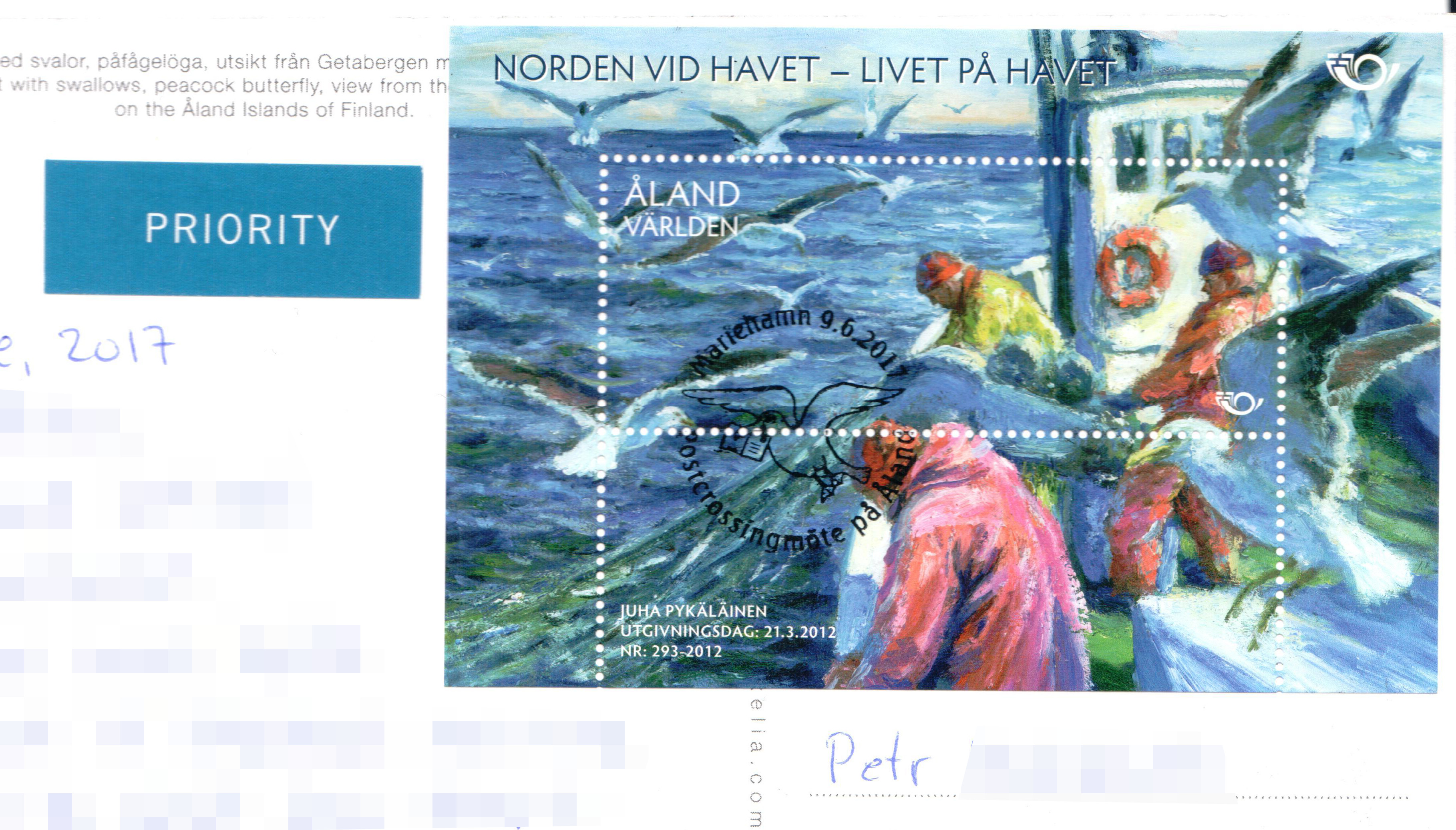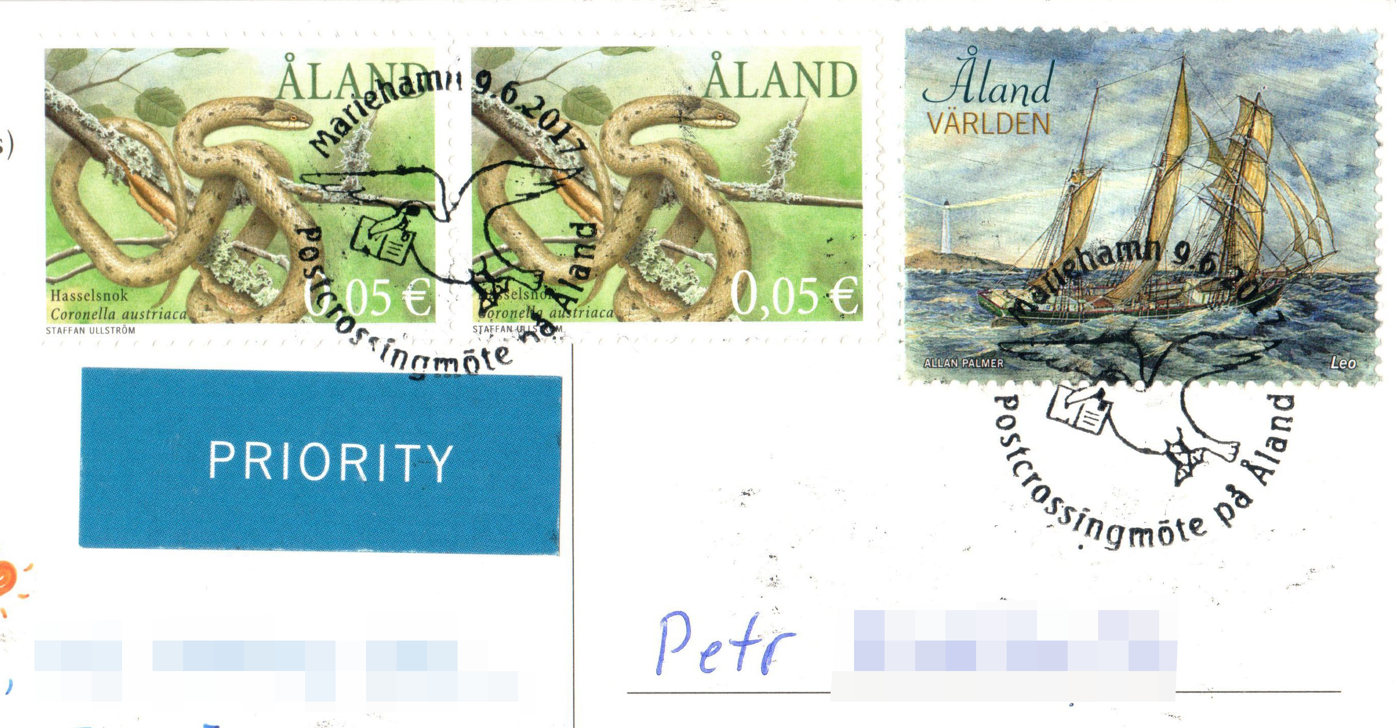 Na konci května 2017 jsem měl to štěstí a znovu strávil týden na Alandských ostrovech. Ještě větší štěstí mě potkalo v té souvislosti, že týden po mém odjezdu se na místě konal postcrosserský sraz a vděčím za mnohé skvělé finské postcrosserce Nině, která mi poslala tyto krásné pohledy, na kterých jsou tedy příležitostná razítka, která vznikla právě pro tento sraz. Pokud by to bylo jen trochu možné, na Alandy bych se okamžitě odstěhoval.