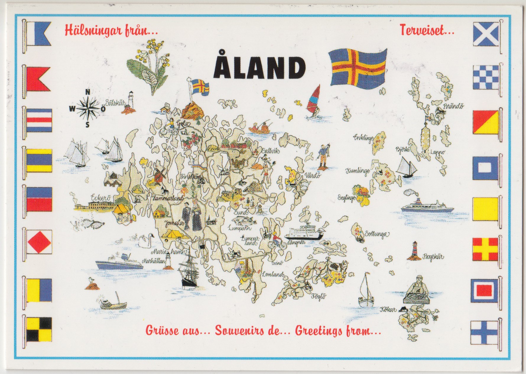 Ålandské ostrovy jsou autonomní, samosprávný a švédskojazyčný region Finska. Nacházejí se na prahu Botnického zálivu v Baltském moři. Skládají se z hlavního souostroví Fasta Åland a pak obrovského množství asi 6.500 menších ostrůvků a skalisek, které se táhnou až k finskému pobřeží. Autonomní status byl souostroví garantován Společností národů (Liga národů) v roce 1921. Souostroví má vlastní parlament, politickou samosprávu a také poštovní službu s vlastními poštovními známkami. Můj první pohled z Åland dorazil v pátek 20. listopadu 2015. Zobrazuje námořnickou kapli u hlavního města Mariehamn, kde se dodnes konají svatby. V pondělí 14. prosince dorazily další dva krásné pohledy, za které vděčím Nině. Nemohu si pomoci, ale toto místo se mi zdá věru překrásné. V květnu 2016 jsem měl to štěstí, abych strávil na Ålandských ostrovech celý týden a s pomocí skupiny českých a estonských postcrosserů, která se v Mariehamnu zastavila na několik dní krátce po mně, se moje sbírka pohledů z Åland krásně rozrostla.