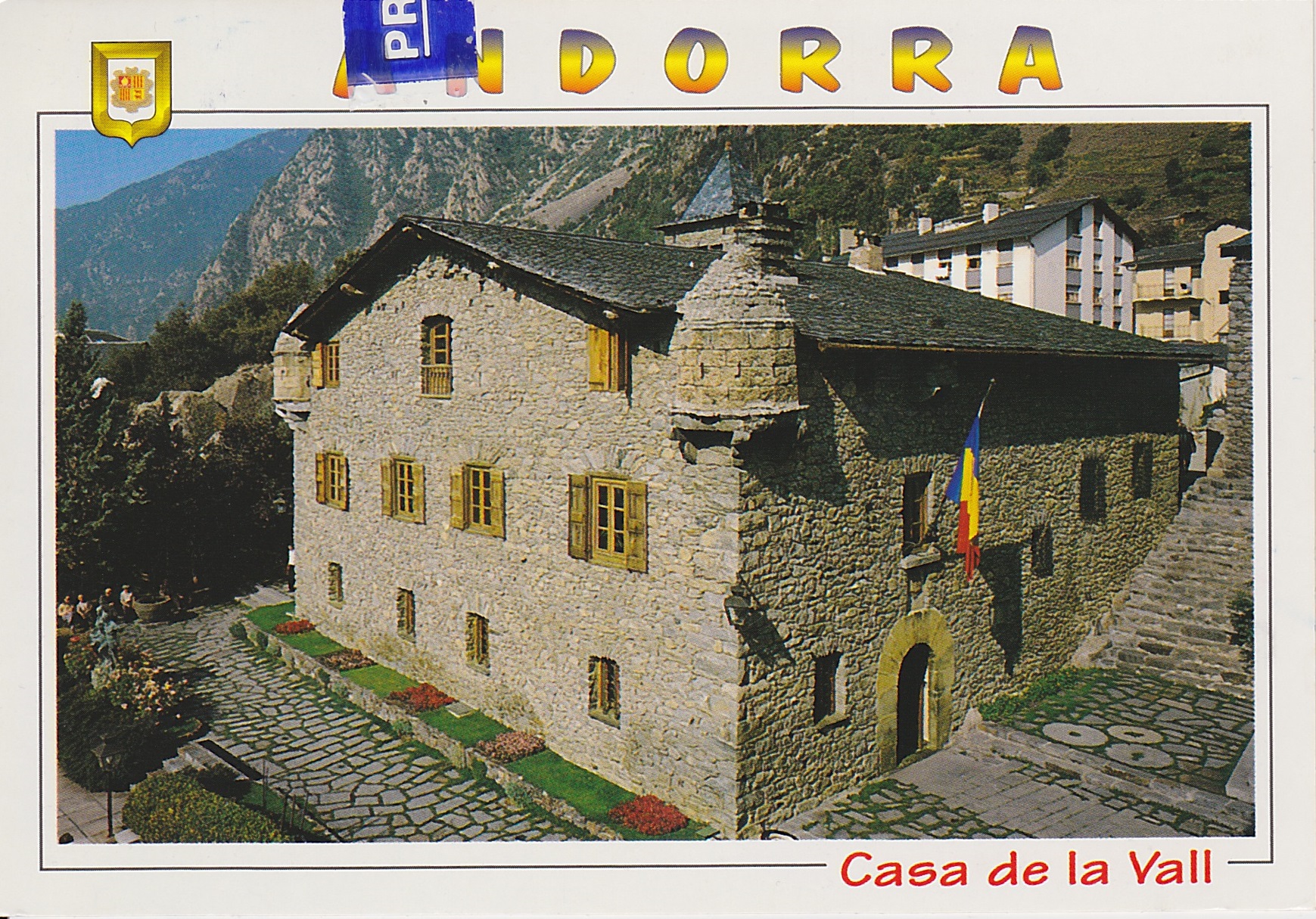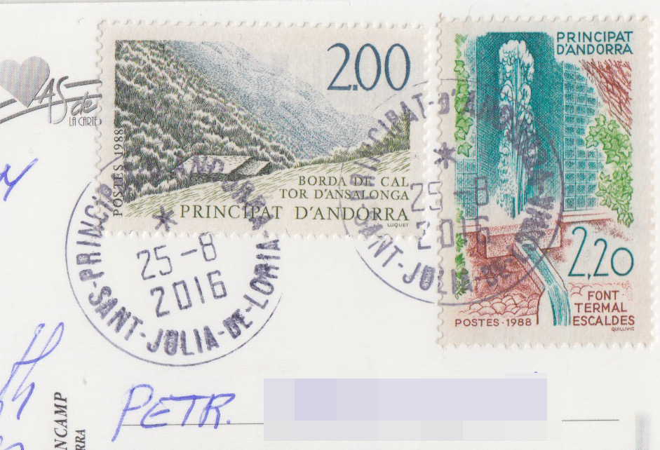 Můj první pohled ze srpna 2015, náležející k francouzsko-andorrskému poštovnímu systému (Postes). Andorra má zvláštní duální státoprávní subjektivitu, kdy se jedná o knížectví, mající dva společné prince – spoluvládce: španělského biskupa z Urgellu a hlavu francouzského státu, nyní prezidenta. Francouzský prezident je tak jedinou hlavou státu na světě, který je zároveň prezidentem republikánského zřízení a knížetem ve zřízení monarchistickém. Toto uspořádání odráží složité vyjednávání míru mezi francouzskou a španělskou korunou během raného novověku. Původní nárok na knížecí spoluvládu měl rod francouzských hrabat z Foix, který se jí posléze vzdal ve prospěch francouzského krále. Na pohledu je historická stavba Casa de la Vall, sídlo andorrské Generální rady, neboli instituce parlamentního typu. Dům byl původně postaven v roce 1580 rodinou Busquet jako opevněná hlavní budova statku. Dnes v něm zasedá celkem 28 volených představitelů země. V přízemí se nachází soudní síň a v prvním patře státní archiv a místnost, kde byla v roce 1993 připravována andorrská ústava.