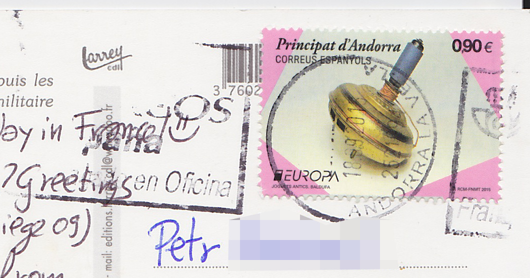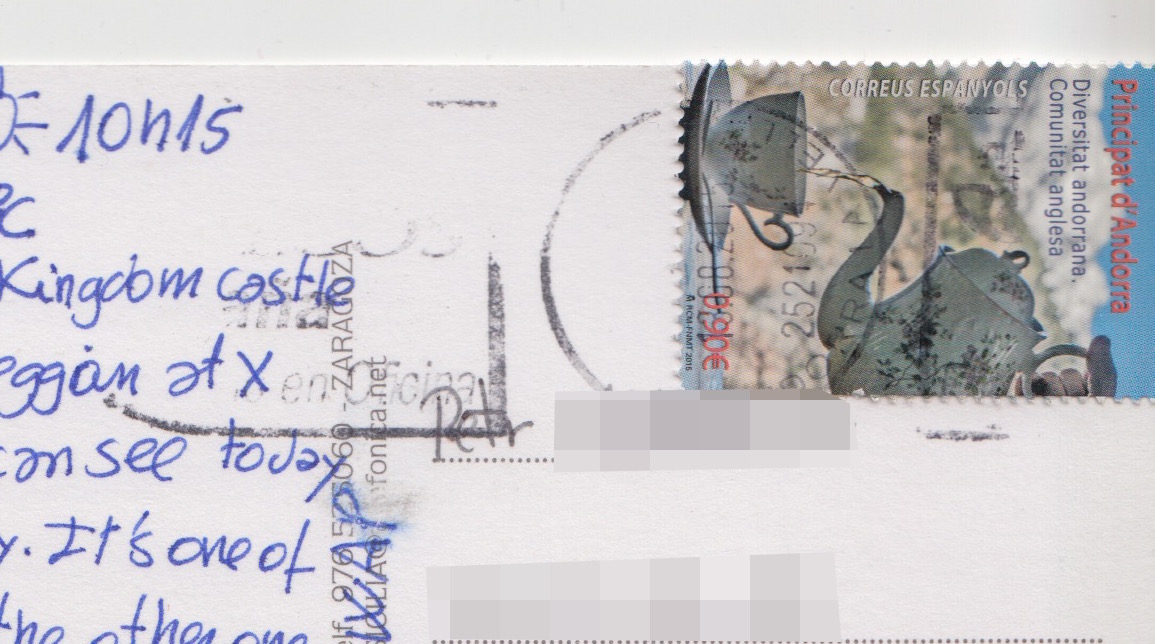 Andorra je knížectví, založené chartou již v roce 988. Je to jeden z evropských mikrostátů, který má přibližně 85.000 obyvatel. Vládnou mu dvě spolu-knížata – španělský katolický biskup z Urgellu a pak hlava francouzského státu, v součanosti prezident republiky. V zemi proto existuje zvláštní duální poštovní systém – pošta španělská (Correus Espanyols) a pak francouzská (Postes), které mají nejen vlastní subjektivitu, ale také vlastní odlišné poštovní schránky. Můj první pohled z Andorry, který náleží ke španělsko-andorrskému poštovnímu systému, přišel v pondělí 17. srpna 2015 a zobrazuje historický navarský hrad v Javieru.