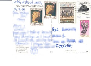 Na podzim 2018 jsem v rámci svého swapu z Grónska dostal tyto dva krásné pohledy z Itálie s fortifikační architekturou.V pátek 10. srpna jsem dostal tento překrásný pohled sochy sv. Jiří od Donatella (slavný italský renesanční sochař jménem Donato di Niccolò di Betto Bardi – 1386/1466). Tuto krásnou sochu zhotovil v roce 1417 ve Florencii na zakázku místního platnéřského cechu, neboli cechu výrobců brnění a ochranné zbroje. Socha se dodnes nachází ve florentském kostele Orsanmichele. Svatý Jiří byl podle legendy voják pretoriánské gardy císaře Diokleciána a byl popraven za to, že se odmítl zříci víry. Náleží mezi nejvýznamnější historické křesťanské svaté, pro ortodoxní a východní církve je takzvaný Velký svatý, megalomartyr (μεγαλομάρτυρ). V katolické tradici patří mezi Čtrnáct svatých pomocníků, o kterých se ještě často traduje, že jejich přímluvy jsou mimořádně účinné. Je také protagonistou známé legendy o sv. Jiřím a drakovi. Nicméně už papež sv. Gelasius I. na konci 5. století n. l. deklaroval, že sv. Jiří patří mezi ty svaté, kteří jsou nedoložitelní jakýmikoli důvěryhodnými svědectvími a jejichž skutečné činy “jsou známé jen Bohu” (nikoli lidem). Již jezuitský historik Hippolyte Delehaye nalezl historické dokumenty, které objasňují, že sv. Jiří je fiktivní postava, která byla částečně inspirována ariánským křesťanským biskupem Jiřím Kapadockým, který byl ve 4. století n. l. nějakou dobu biskupem v Alexandrii a došel velkého věhlasu a respektu. V 6. století se již objevují Acta Sancti Georgii, kde je legenda již kompletní. V některých islámských textech je sv. Jiří uctíván jako prorocká postava pod názvem جرجس, Jiriyas. Ovšem zvláště od konce 11. století byl kult sv. Jiřího jako patrona vojáků mocně posílen během křížových výprav a ustupuje se od něj až v druhé polovině 20. století. Dodnes je však například patronem skautů.