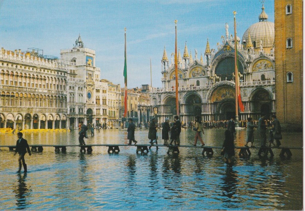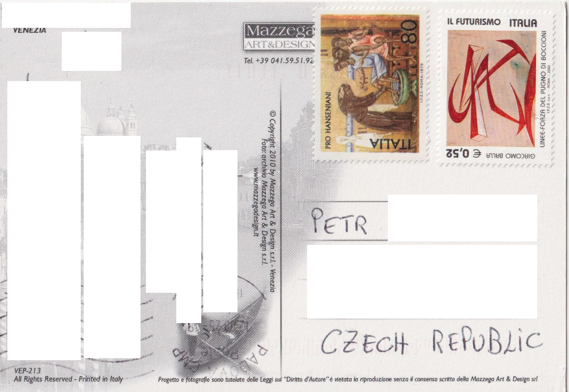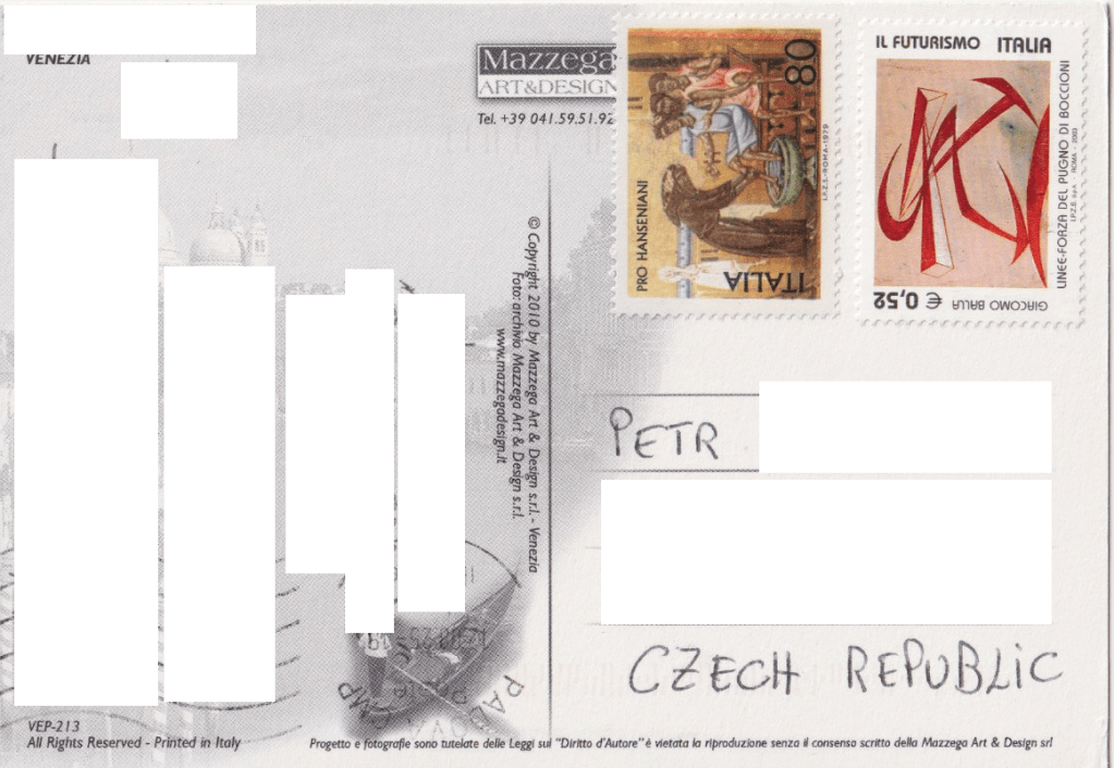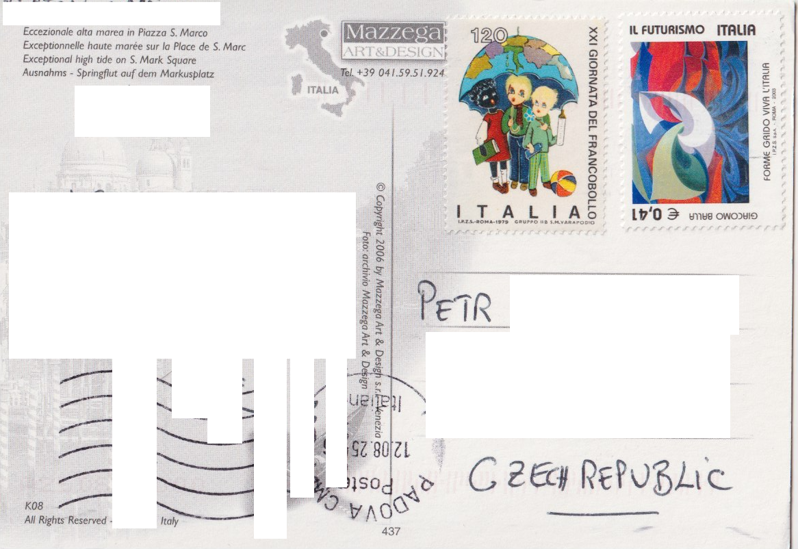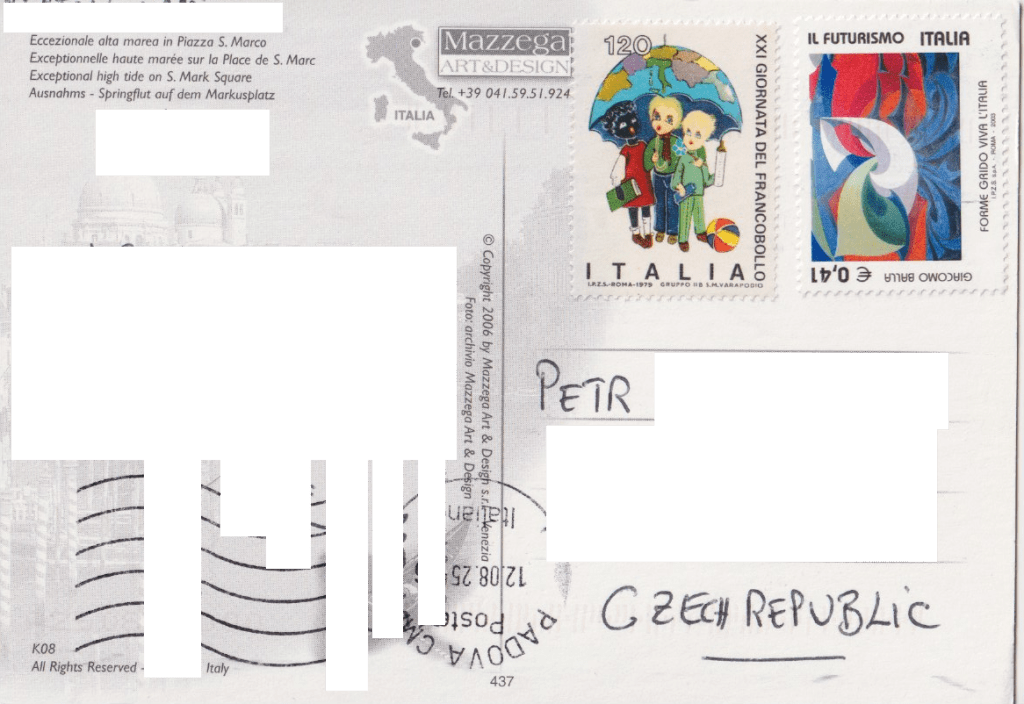 V pondělí 1. září 2025 do mé poštovní schránky dorazily dva krásné pohledy Benátek od Massima. Na prvním je náměstí sv. Marka při vysoké vodě, kdy jsou na místě instalovány typické dřevěné chodníčky. Na druhém je jeden z místních kanálů.
