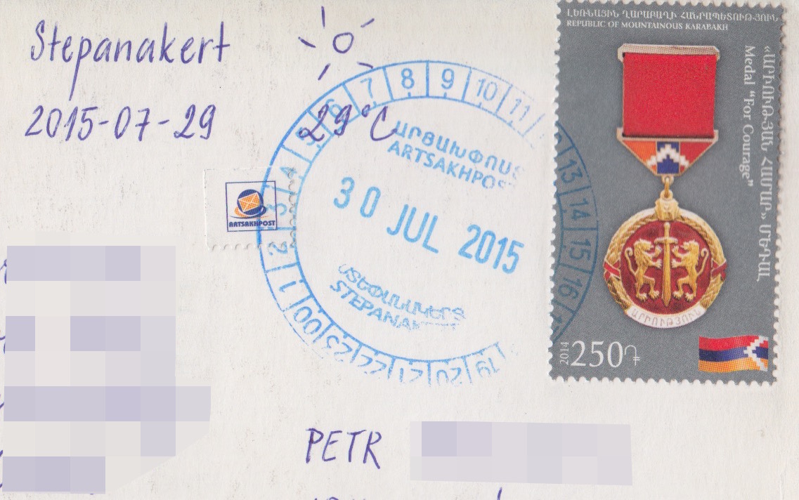 Moje první dva pohledy z Náhorně-Karabašské republiky dorazily od Miroslavy, která letos navštívila Kavkaz, v úterý 11. srpna 2015. Náhorní Karabach je de facto nezávislé, ale většinou mezinárodně neuznané území, obývané z velké většiny etnickými Armény, které je ze všech stran uzavřeno územím Azerbajdžánu. Má bohatou a dramatickou historii a předmětem sporu mezi Arménií a Azerbajdžánem bylo již od roku 1917, od rozpadu carského impéria. V letech 1988-1994 zde probíhala takzvaná Náhorně-karabašská válka, která nakonec skončila mezinárodně zprostředkovaným příměřím. Oblast je de facto vojensky obsazená arménskou armádou a mezi oběma státy dosud nebyla podepsána mírová smlouva.