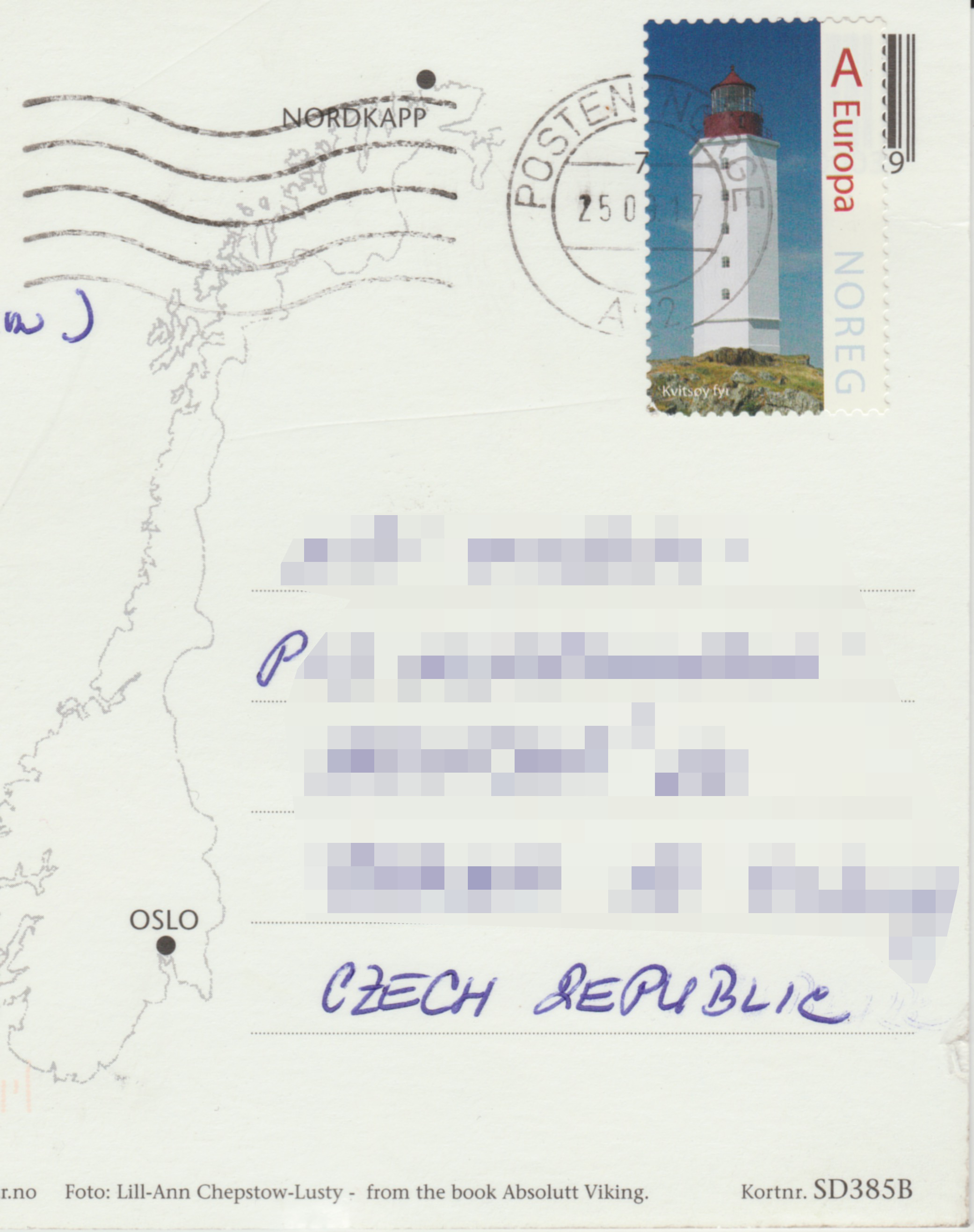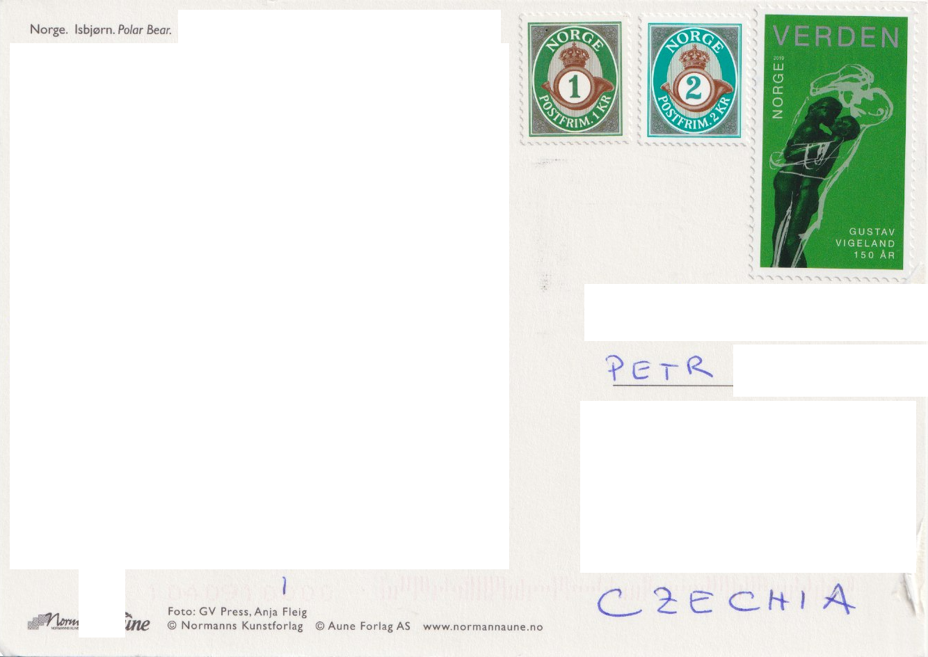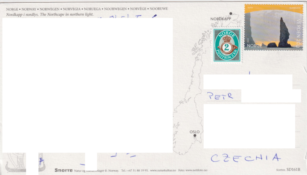 V pátek 5. září 2025 jsem do své poštovní schránky dostal tuto krásnou pohlednici polární záře nad Nordkapem, a to od své drahé. Přišla také pohlednice s “rodinkou” ledních medvědů. Ti se v Norsku vyskytují v oblasti Špicberk (Svalbard), kde tvoří takzvanou BS-subpopulaci, nazvanou podle Barentsova moře. Tato populaci čítá minimálně 300 jedinců, kteří se vyskytují po celé ploše souostroví a často migrují tam a zpět směrem na Zemi Františka Josefa, velké souostroví, které se nachází na území Ruska – tamější populace přesahuje 2500 kusů.Ve středu 12. července 2023 jsem do své poštovní schránky dostal od Svenjy tuto krásnou pohlednici z norských Lofot.V roce 2019 jsem do své poštovní schránky dostal i tuto krásnou žánrovou pohlednici z Norska.V úterý 7. srpna 2018 jsem dostal krásnou pohlednici z Norska, zobrazující Loď z Tuny, neboli Tuneskipet, umístěnou v muzeu vikingských lodí Vikingskipshuset na poloostrově Bygdøy v Oslu. Loď byla objevena v roce 1867 a sloužila jsko součást pohřební výbavy pro vikingského aristokrata. Loď byla více než 22 metrů dlouhá a měla 11 nebo 12 párů vesel.