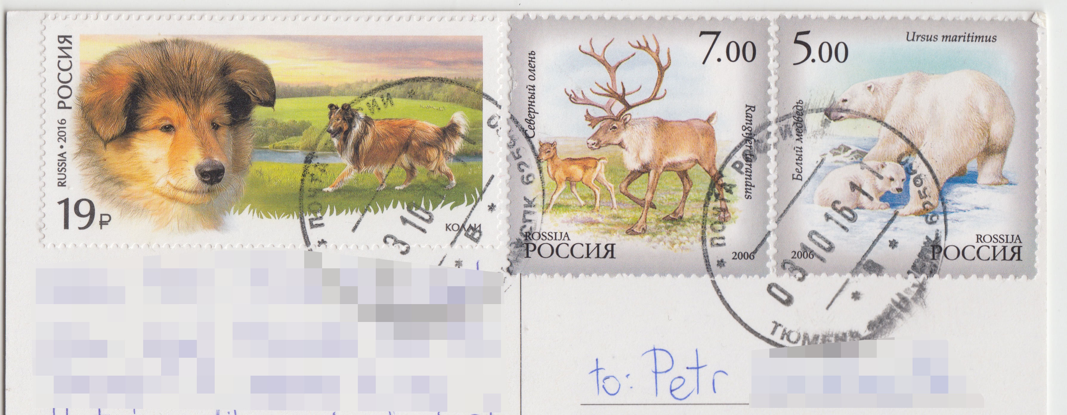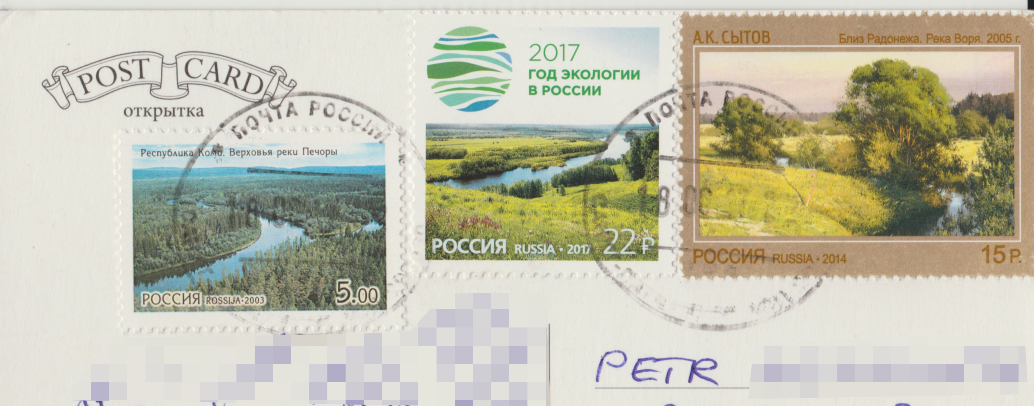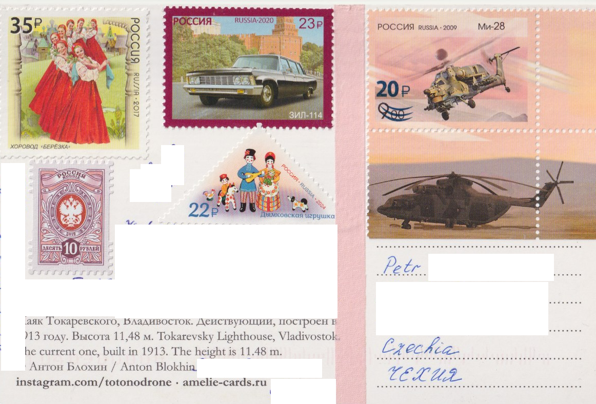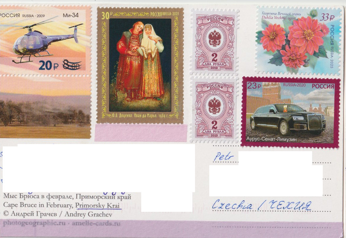 V pátek 5. září 2025 jsem do své poštovní schránky dostal tento překrásný pohled majáku Tokarevskij u dálněvýchodního Vladivostoku, který byl vztyčen roku 1913. Pohledy z Ruska vždy nesou hořkou příchuť toho, že Rusko je válečným agresorem, ale jestli je něco z Postcrossingu směrem do Ruska a z něj patrné, tak to, že minimálně postcrosseři opravdu nejsou ti, kteří by podporovali válečnou agendu Putinovy diktatury. Na druhém pohledu je zimní, únorová scenerie rozeklaného pobřeží tvořeného bazaltovými sloupovými útvary na mysu Bruce (pojmenovaném po kapitánovi britské válečné lodi, která místo poprvé zanesla do map kolem roku 1855), který se nachází asi 200 kilometrů od Vladivostoku.Důvod, proč mám tak rád pohlednice z Ruska, není Rusko, toto staré, pochmurné, krvavé suchozemské koloniální impérium. Důvody jsou dva: jednak tradice a kultura obrovské spousty nejrůznějších neruských a neevropských kultur a etnik, které ruské impérium (ve svých různých formách) již staletí utlačuje a zadruhé dechberoucí přírodní krásy, které se nachází na území této odporné diktatury. Snad například v souvislosti s ruskou agresí proti Ukrajině, probíhající od roku 2022, dojde ke zhroucení Putinova režimu a budu mít více důvodů pokračovat v rozšiřování své “ruské” sbírky. V srpnu 2025 jsem do své sbírky dostal dvě krásné pohlednice. První zobrazuje pasáž z pohoří Ťan-šan a druhá zachycuje tuvinské šamanské tradice, konkrétně obětování ohni.Na konci června 2023 jsem v rámci svého swapu z Alderney a Guernsey obdržel i tyto dvě pohlednice ze současného Ruska, bohužel zapleteného do kruté agresívní války na Ukrajině, která poznamenala i mezinárodní svět postcrossingu. Pohlednice jsou něčím velmi zvláštní: Čečenská republika, součást Ruské federace, pro níž je typická velmi tvrdý autokratický režim, je na pohlednicích představena ve smyslu svých historických a přírodních krás… Pevně doufám, že válka bude již brzy minulostí, bude nastolen mír a spravedlnost pro oběti i přeživší a nebudu prožívat ambivalentní pocity při pohledu na takové pohlednice. Pohlednice z Ruska docházejí tradičně překrásně vybavené poštovními známkami a i tyto dvě nebyly výjimkou.Dne 1. září 2021 jsem v rámci svého swapu z Vatikánu a San Marina dostal tento další krásný pohled Kižského ostrova a jeho dřevěných kostelů.Na Oněžském jezeře se nachází ostrov Kiži a na něm komplex několika historických dřevěných kostelů, zapsaných od roku 1990 do seznamu památek UNESCO, takzvaný Kižský pogost (Кижский погост). Kostely pocházejí z 18. nebo začátku 19. století. Kromě nich byl na ostrově vytvořen skanzen historických staveb z Karélie. V oblasti se ještě hovoří vepštinou (vepsän kel’), starým baltofinským jazykem, v něm “kiži” znamená řasy, rostoucí na dně jezera. Vepština je stále ohrožený jazyk, v roce 1989 měla pouhých 6500 posledních mluvčích. V roce 1988 byla založena Společnost pro vepskou kulturu a zvláště Nina Zajceva, redaktorka nově založených vepských novin Kodima (Vlast), sestavila potřebné učebnice a dokonce pomohla se založením literárního časopisu. V záchraně vepštiny je aktivní také finský literární vědec a překladatel Markko Nieminen.Pohled s kamčatským medvědem hnědým (Ursus arctos beringianus), který jsem dostal na podzim 2018 v rámci svého swapu z Grónska.V létě 2019 jsem dostal od Žeňy tuto krásnou pohlednici, zobrazující rysa ostrovida (Lynx lynx) z Přímořského kraje, rozkládajícího se na Dálném východě podél Ochotského moře.
