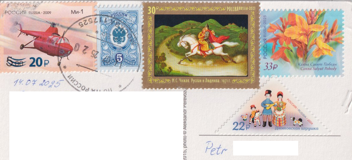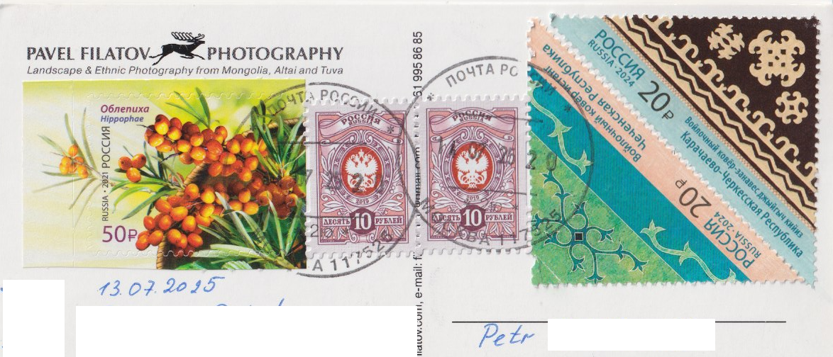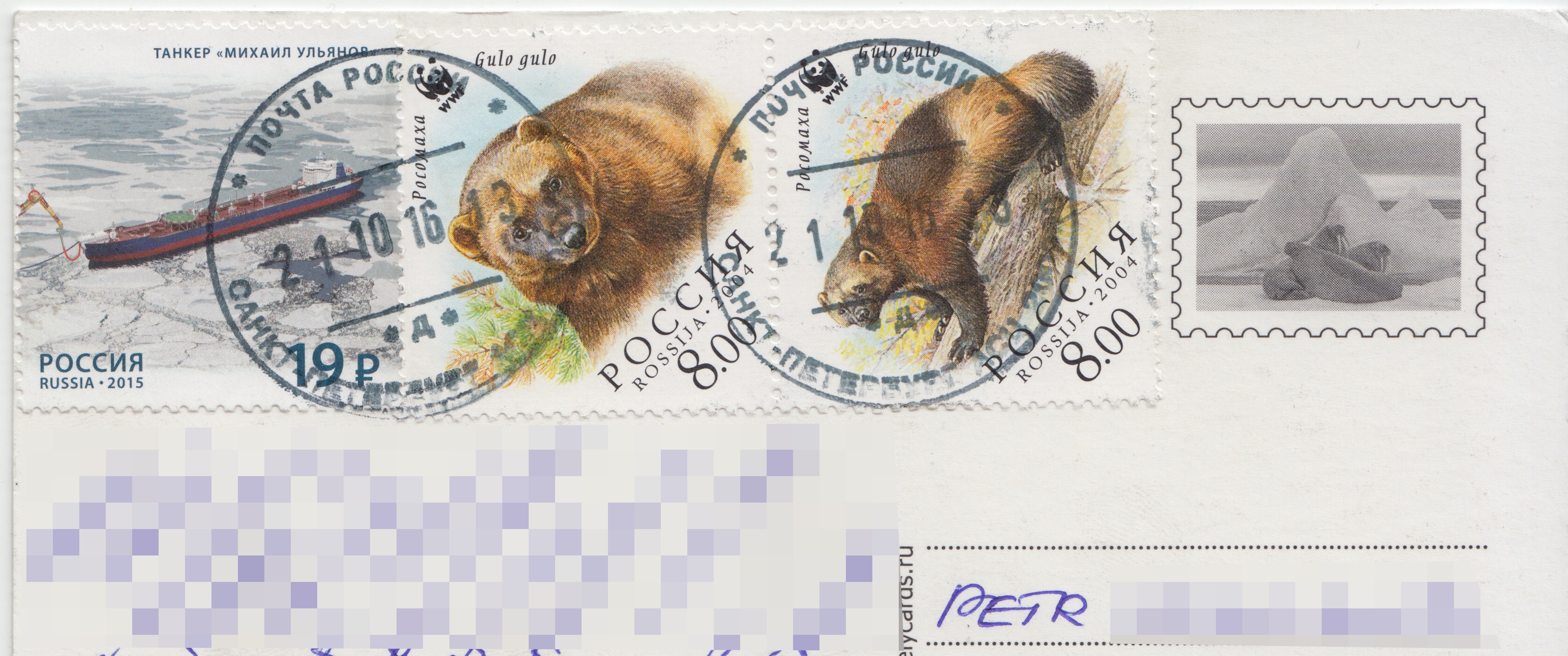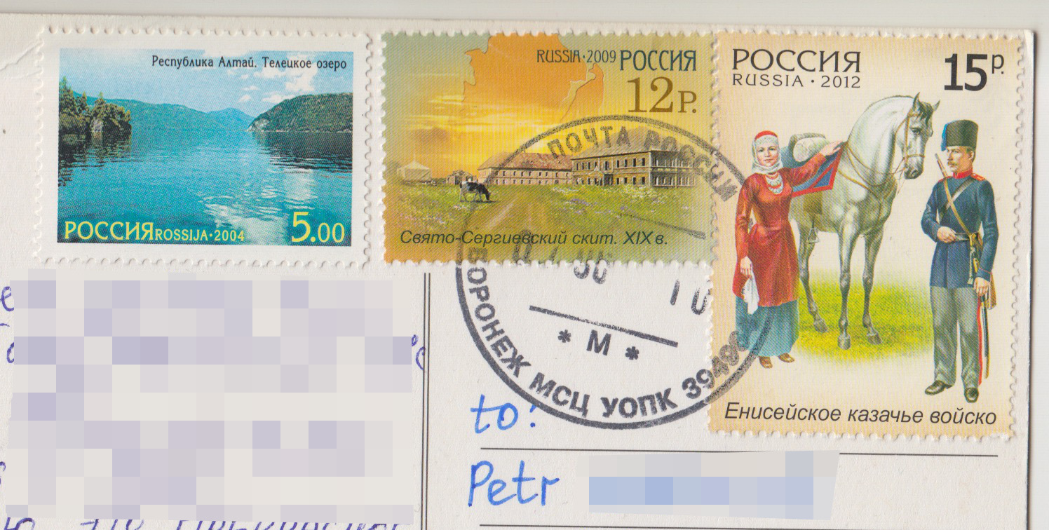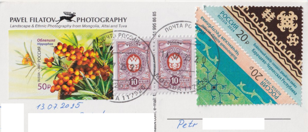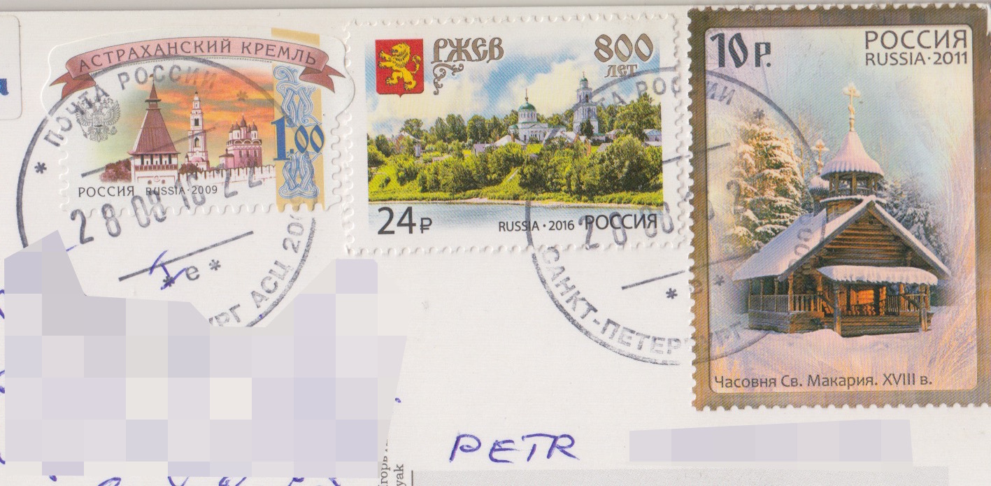 V pátek 5. září 2025 jsem do své poštovní schránky dostal tento překrásný pohled majáku Tokarevskij u dálněvýchodního Vladivostoku, který byl vztyčen roku 1913. Pohledy z Ruska vždy nesou hořkou příchuť toho, že Rusko je válečným agresorem, ale jestli je něco z Postcrossingu směrem do Ruska a z něj patrné, tak to, že minimálně postcrosseři opravdu nejsou ti, kteří by podporovali válečnou agendu Putinovy diktatury. Na druhém pohledu je zimní, únorová scenerie rozeklaného pobřeží tvořeného bazaltovými sloupovými útvary na mysu Bruce (pojmenovaném po kapitánovi britské válečné lodi, která místo poprvé zanesla do map kolem roku 1855), který se nachází asi 200 kilometrů od Vladivostoku.Důvod, proč mám tak rád pohlednice z Ruska, není Rusko, toto staré, pochmurné, krvavé suchozemské koloniální impérium. Důvody jsou dva: jednak tradice a kultura obrovské spousty nejrůznějších neruských a neevropských kultur a etnik, které ruské impérium (ve svých různých formách) již staletí utlačuje a zadruhé dechberoucí přírodní krásy, které se nachází na území této odporné diktatury. Snad například v souvislosti s ruskou agresí proti Ukrajině, probíhající od roku 2022, dojde ke zhroucení Putinova režimu a budu mít více důvodů pokračovat v rozšiřování své “ruské” sbírky. V srpnu 2025 jsem do své sbírky dostal dvě krásné pohlednice. První zobrazuje pasáž z pohoří Ťan-šan a druhá zachycuje tuvinské šamanské tradice, konkrétně obětování ohni.Na konci června 2023 jsem v rámci svého swapu z Alderney a Guernsey obdržel i tyto dvě pohlednice ze současného Ruska, bohužel zapleteného do kruté agresívní války na Ukrajině, která poznamenala i mezinárodní svět postcrossingu. Pohlednice jsou něčím velmi zvláštní: Čečenská republika, součást Ruské federace, pro níž je typická velmi tvrdý autokratický režim, je na pohlednicích představena ve smyslu svých historických a přírodních krás… Pevně doufám, že válka bude již brzy minulostí, bude nastolen mír a spravedlnost pro oběti i přeživší a nebudu prožívat ambivalentní pocity při pohledu na takové pohlednice. Pohlednice z Ruska docházejí tradičně překrásně vybavené poštovními známkami a i tyto dvě nebyly výjimkou.Dne 1. září 2021 jsem v rámci svého swapu z Vatikánu a San Marina dostal tento další krásný pohled Kižského ostrova a jeho dřevěných kostelů.Na Oněžském jezeře se nachází ostrov Kiži a na něm komplex několika historických dřevěných kostelů, zapsaných od roku 1990 do seznamu památek UNESCO, takzvaný Kižský pogost (Кижский погост). Kostely pocházejí z 18. nebo začátku 19. století. Kromě nich byl na ostrově vytvořen skanzen historických staveb z Karélie. V oblasti se ještě hovoří vepštinou (vepsän kel’), starým baltofinským jazykem, v něm “kiži” znamená řasy, rostoucí na dně jezera. Vepština je stále ohrožený jazyk, v roce 1989 měla pouhých 6500 posledních mluvčích. V roce 1988 byla založena Společnost pro vepskou kulturu a zvláště Nina Zajceva, redaktorka nově založených vepských novin Kodima (Vlast), sestavila potřebné učebnice a dokonce pomohla se založením literárního časopisu. V záchraně vepštiny je aktivní také finský literární vědec a překladatel Markko Nieminen.Pohled s kamčatským medvědem hnědým (Ursus arctos beringianus), který jsem dostal na podzim 2018 v rámci svého swapu z Grónska.V létě 2019 jsem dostal od Žeňy tuto krásnou pohlednici, zobrazující rysa ostrovida (Lynx lynx) z Přímořského kraje, rozkládajícího se na Dálném východě podél Ochotského moře.