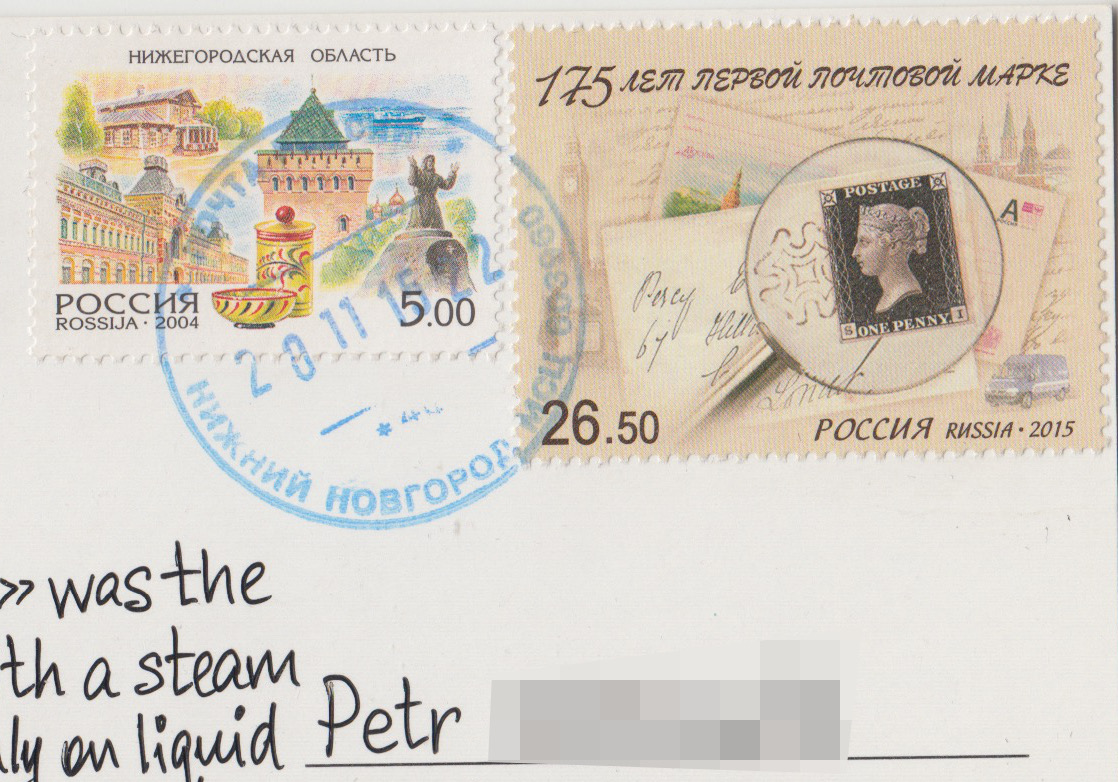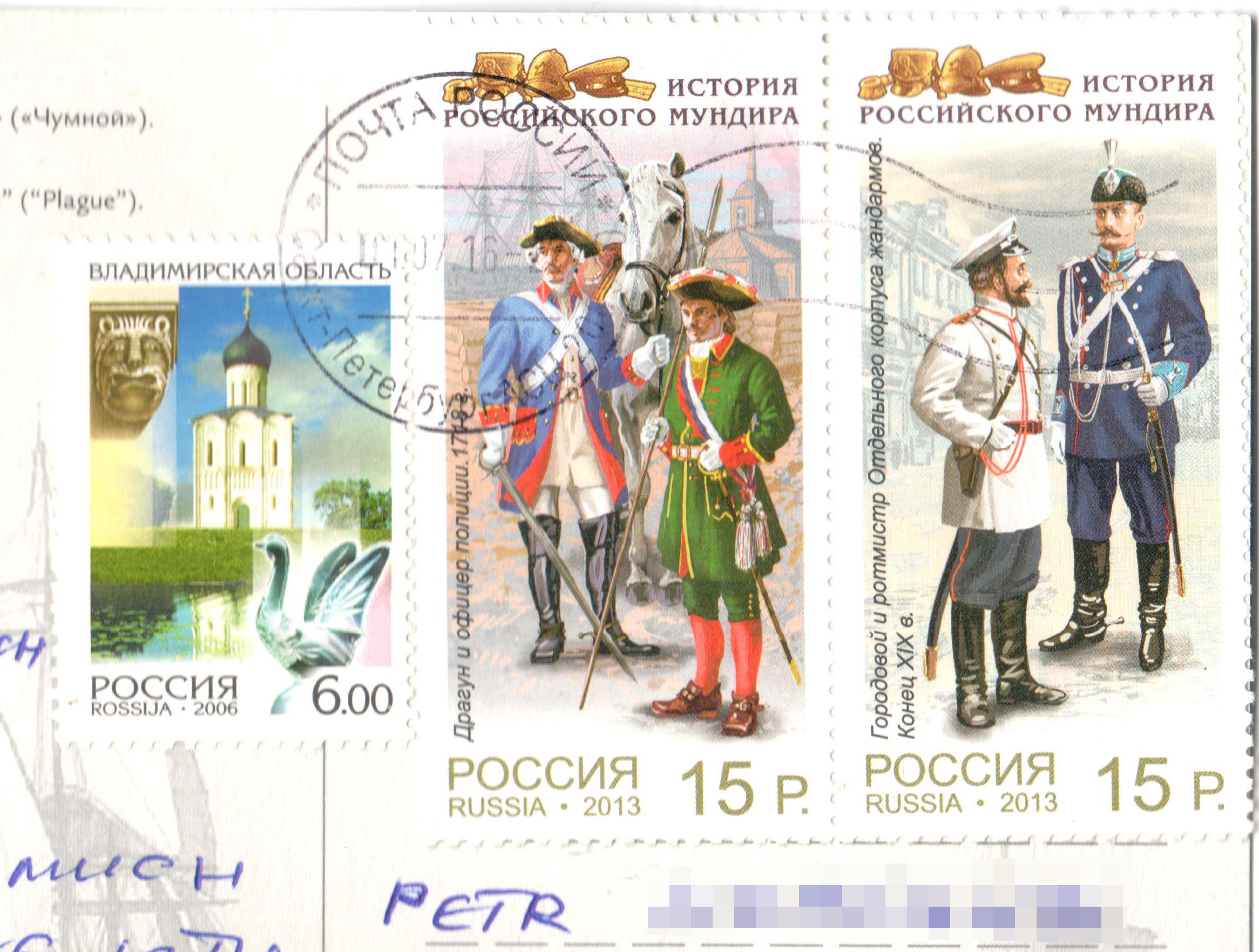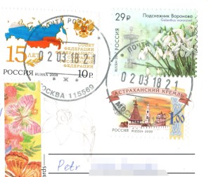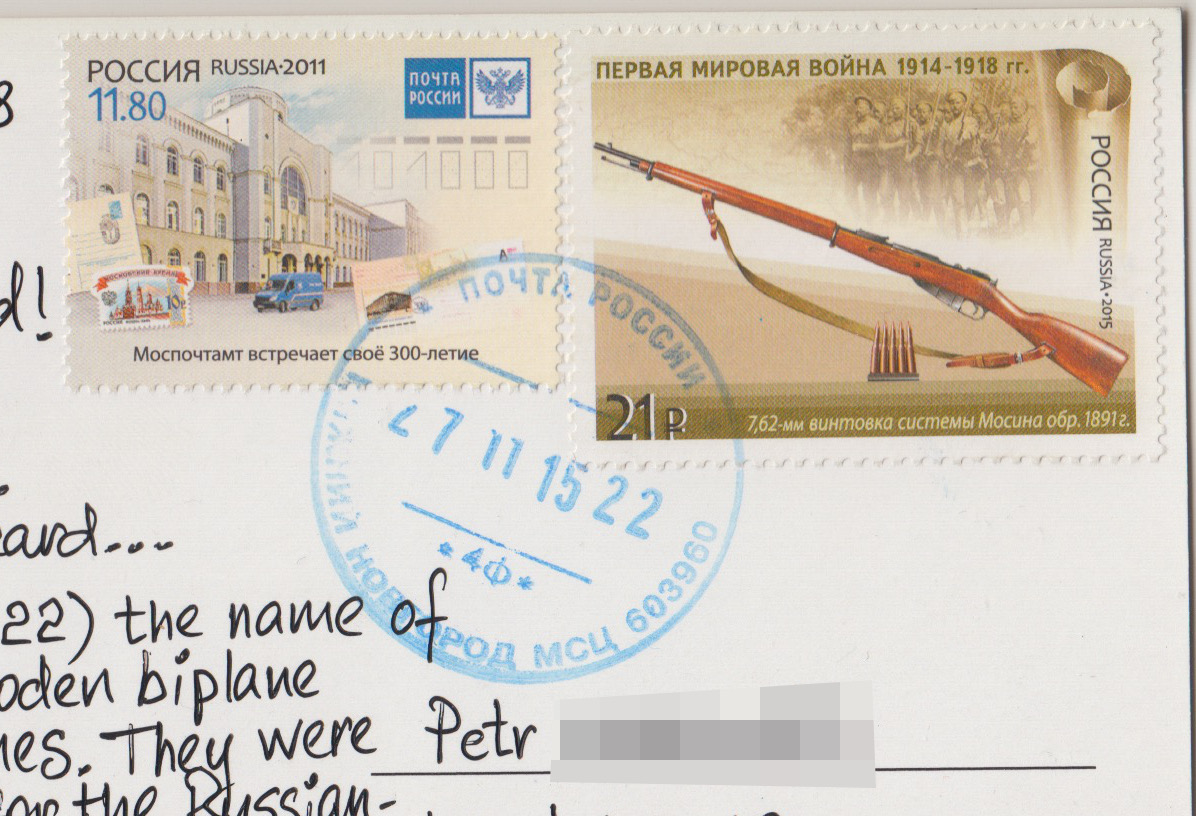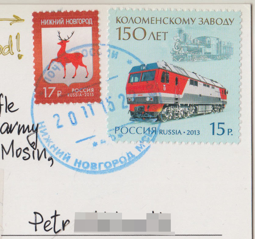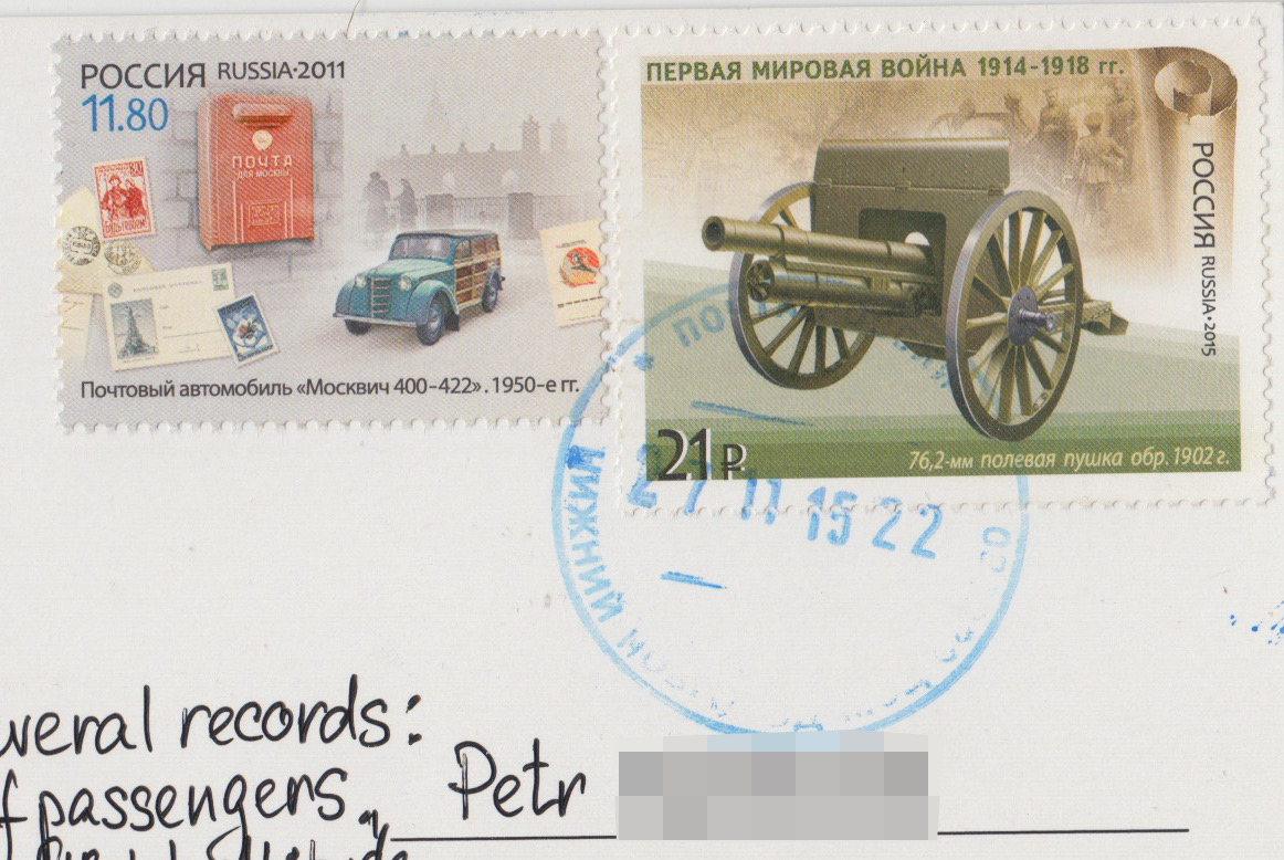 V pátek 5. září 2025 jsem do své poštovní schránky dostal tento překrásný pohled majáku Tokarevskij u dálněvýchodního Vladivostoku, který byl vztyčen roku 1913. Pohledy z Ruska vždy nesou hořkou příchuť toho, že Rusko je válečným agresorem, ale jestli je něco z Postcrossingu směrem do Ruska a z něj patrné, tak to, že minimálně postcrosseři opravdu nejsou ti, kteří by podporovali válečnou agendu Putinovy diktatury. Na druhém pohledu je zimní, únorová scenerie rozeklaného pobřeží tvořeného bazaltovými sloupovými útvary na mysu Bruce (pojmenovaném po kapitánovi britské válečné lodi, která místo poprvé zanesla do map kolem roku 1855), který se nachází asi 200 kilometrů od Vladivostoku.Důvod, proč mám tak rád pohlednice z Ruska, není Rusko, toto staré, pochmurné, krvavé suchozemské koloniální impérium. Důvody jsou dva: jednak tradice a kultura obrovské spousty nejrůznějších neruských a neevropských kultur a etnik, které ruské impérium (ve svých různých formách) již staletí utlačuje a zadruhé dechberoucí přírodní krásy, které se nachází na území této odporné diktatury. Snad například v souvislosti s ruskou agresí proti Ukrajině, probíhající od roku 2022, dojde ke zhroucení Putinova režimu a budu mít více důvodů pokračovat v rozšiřování své “ruské” sbírky. V srpnu 2025 jsem do své sbírky dostal dvě krásné pohlednice. První zobrazuje pasáž z pohoří Ťan-šan a druhá zachycuje tuvinské šamanské tradice, konkrétně obětování ohni.Na konci června 2023 jsem v rámci svého swapu z Alderney a Guernsey obdržel i tyto dvě pohlednice ze současného Ruska, bohužel zapleteného do kruté agresívní války na Ukrajině, která poznamenala i mezinárodní svět postcrossingu. Pohlednice jsou něčím velmi zvláštní: Čečenská republika, součást Ruské federace, pro níž je typická velmi tvrdý autokratický režim, je na pohlednicích představena ve smyslu svých historických a přírodních krás… Pevně doufám, že válka bude již brzy minulostí, bude nastolen mír a spravedlnost pro oběti i přeživší a nebudu prožívat ambivalentní pocity při pohledu na takové pohlednice. Pohlednice z Ruska docházejí tradičně překrásně vybavené poštovními známkami a i tyto dvě nebyly výjimkou.Dne 1. září 2021 jsem v rámci svého swapu z Vatikánu a San Marina dostal tento další krásný pohled Kižského ostrova a jeho dřevěných kostelů.Na Oněžském jezeře se nachází ostrov Kiži a na něm komplex několika historických dřevěných kostelů, zapsaných od roku 1990 do seznamu památek UNESCO, takzvaný Kižský pogost (Кижский погост). Kostely pocházejí z 18. nebo začátku 19. století. Kromě nich byl na ostrově vytvořen skanzen historických staveb z Karélie. V oblasti se ještě hovoří vepštinou (vepsän kel’), starým baltofinským jazykem, v něm “kiži” znamená řasy, rostoucí na dně jezera. Vepština je stále ohrožený jazyk, v roce 1989 měla pouhých 6500 posledních mluvčích. V roce 1988 byla založena Společnost pro vepskou kulturu a zvláště Nina Zajceva, redaktorka nově založených vepských novin Kodima (Vlast), sestavila potřebné učebnice a dokonce pomohla se založením literárního časopisu. V záchraně vepštiny je aktivní také finský literární vědec a překladatel Markko Nieminen.Pohled s kamčatským medvědem hnědým (Ursus arctos beringianus), který jsem dostal na podzim 2018 v rámci svého swapu z Grónska.V létě 2019 jsem dostal od Žeňy tuto krásnou pohlednici, zobrazující rysa ostrovida (Lynx lynx) z Přímořského kraje, rozkládajícího se na Dálném východě podél Ochotského moře.