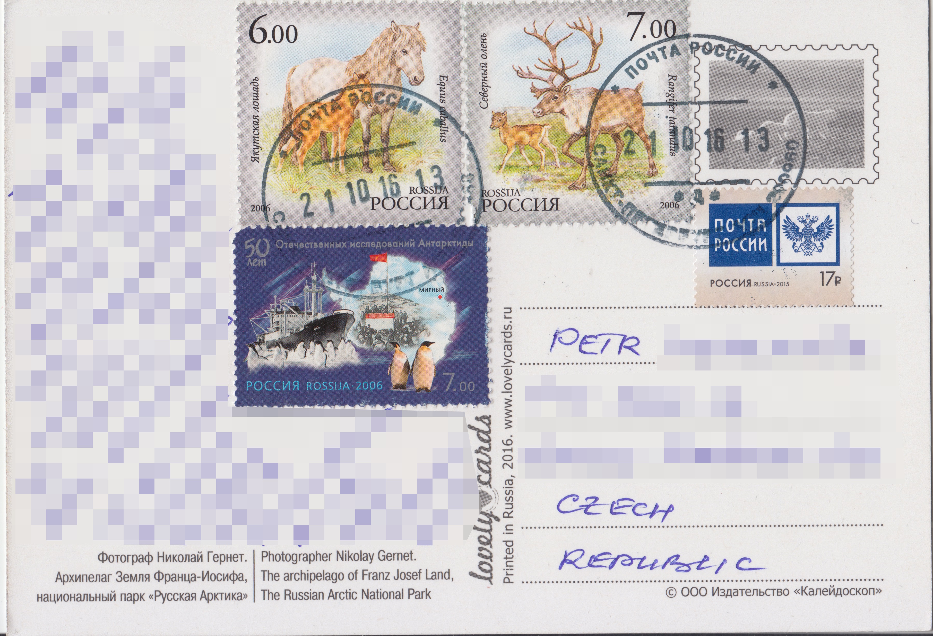 V pondělí 31. 10. 2016 jsem od Julie dostal čtyři krásné pohlednice z ruské Arktické rezervace na Zemi Františka Josefa I., zachycující místní lední medvědy, polární lišky a mrože. Země Františka Josefa je velké arktické souostroví, obydlené permanentně pouze kvůli ruské vojenské základně, nacházející se v Severním ledovém oceánu na rozhraní Barentsova a Karského moře. Celkem 85% souostroví je trvale zaledněno a samotné místo bylo objeveno až v roce 1873 rakouskou polární expedicí, mířící na Severní pól. Od roku 2012 je souostroví součástí Ruského národní arktického parku a je do něj zakázán přístup jakýchkoli turistů. Až do roku 1926 bylo souostroví považováno za terra nulius, neboli zemi, nepatřící nikomu, ale tehdy na něj vznesl nárok Sovětský svaz, proti čemuž dodnes protestuje Norsko a od roku 1929 je na místě sovětská, později ruská vojenská základna a letiště.