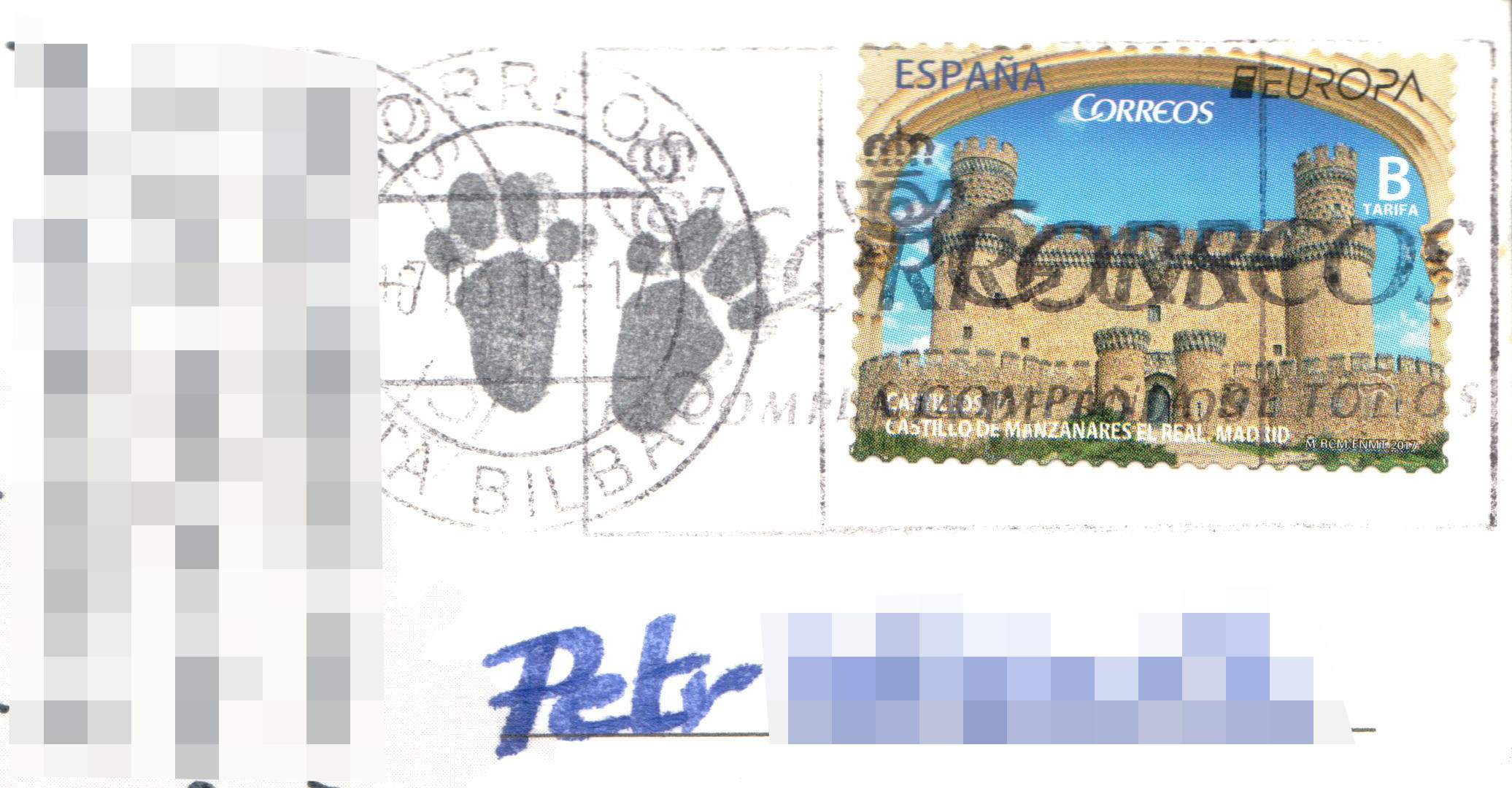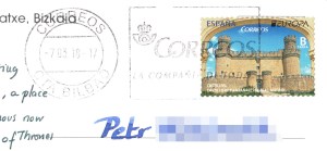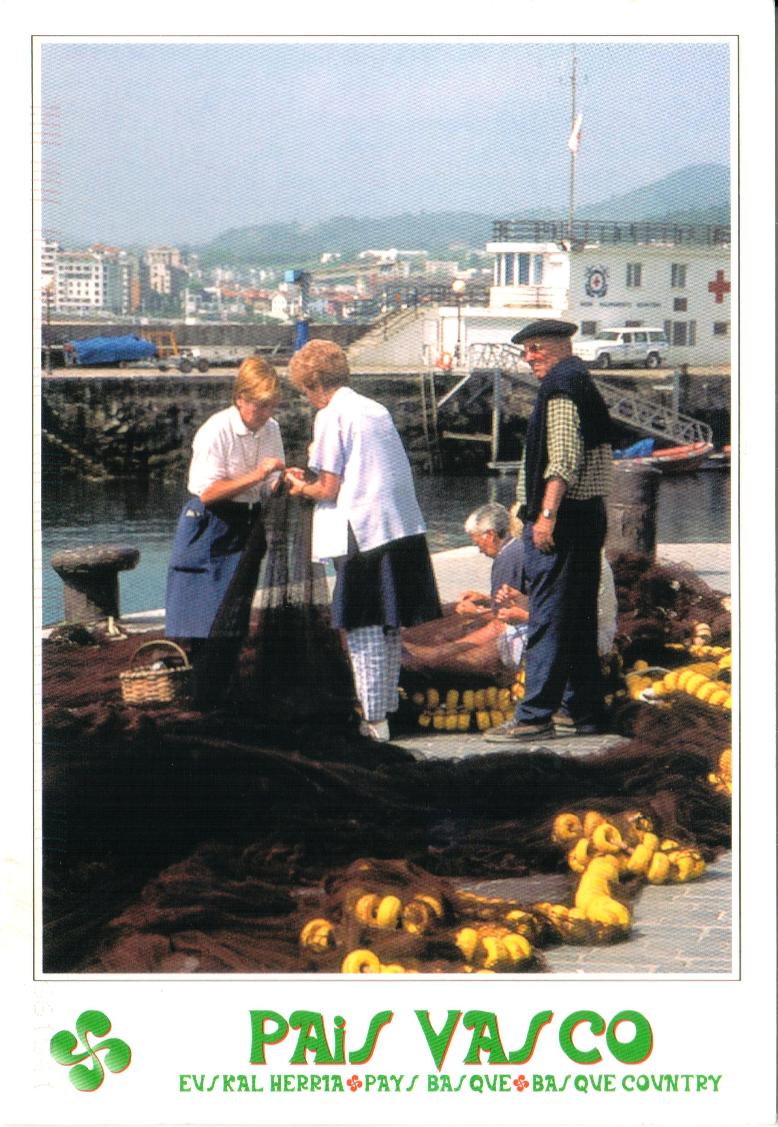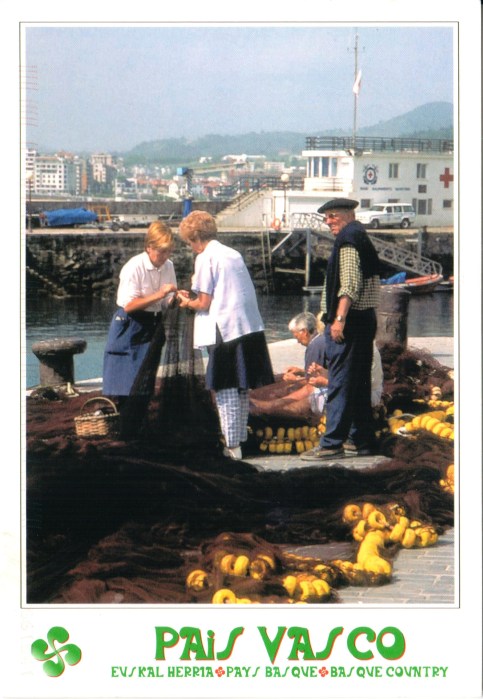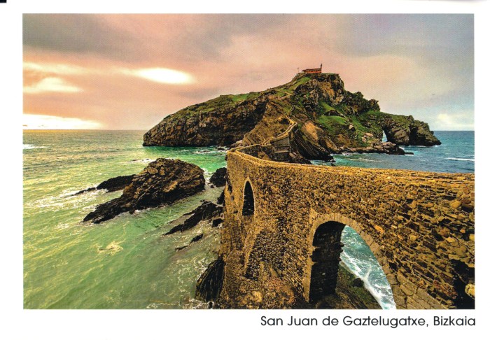 San Juan de Gaztelugaxte je malebný ostrov na pobřeží Biskajského zálivu v Baskicku, na němž se nachází kostel, zasvěcený sv. Janu Křtiteli. V baskičtině znamená název místa “skalní hrad”. K místu vede úzká stezka, po níž je nutno ke kostelu vstoupat celkem 241 schodů. Pohlednice mi dorazila na konci března 2018 společně s druhou, zachycující místní lidi na rybím trhu.