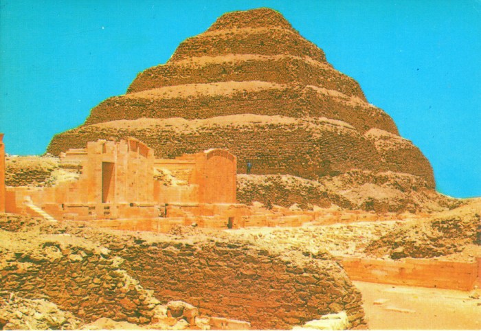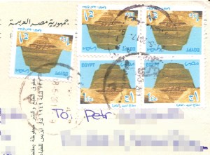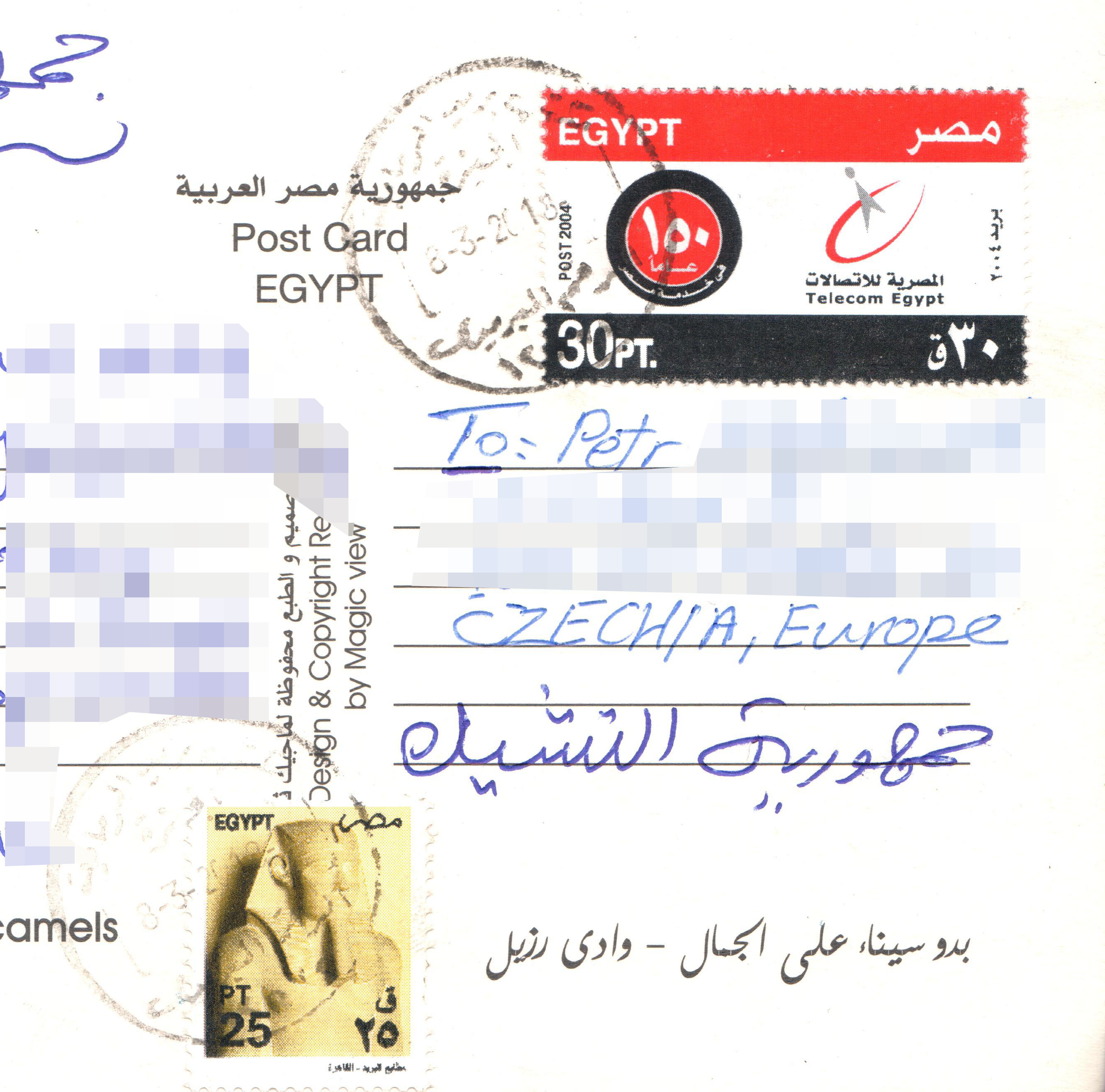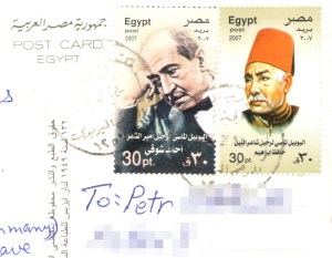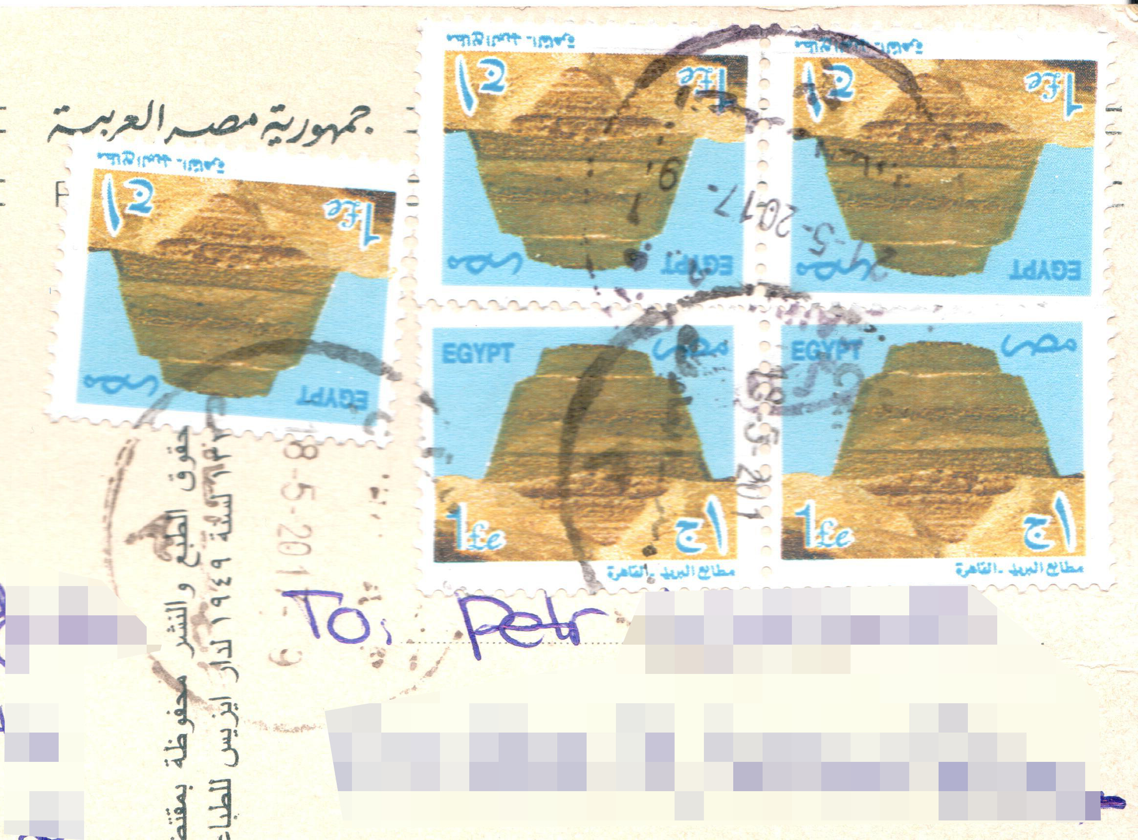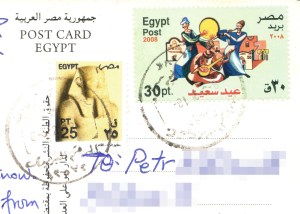 Ve středu 4. dubna 2018 do mé poštovní schránky dorazily tři pohlednice z Egypta od Mohammeda. Na první z nich jsou zachyceni sinajští Beudíni v údolíé Wadi Razil. Na druhé je zachycen interiér mešity Mohammeda Aliho v káhirské citadele a na třetí je Džóserova pyramida, neboli Stupňovitá pyramida v Sakkáře. Nechal ji kolem roku 2600 př. n. l. vystavět druhý panovník třetí dynastie.