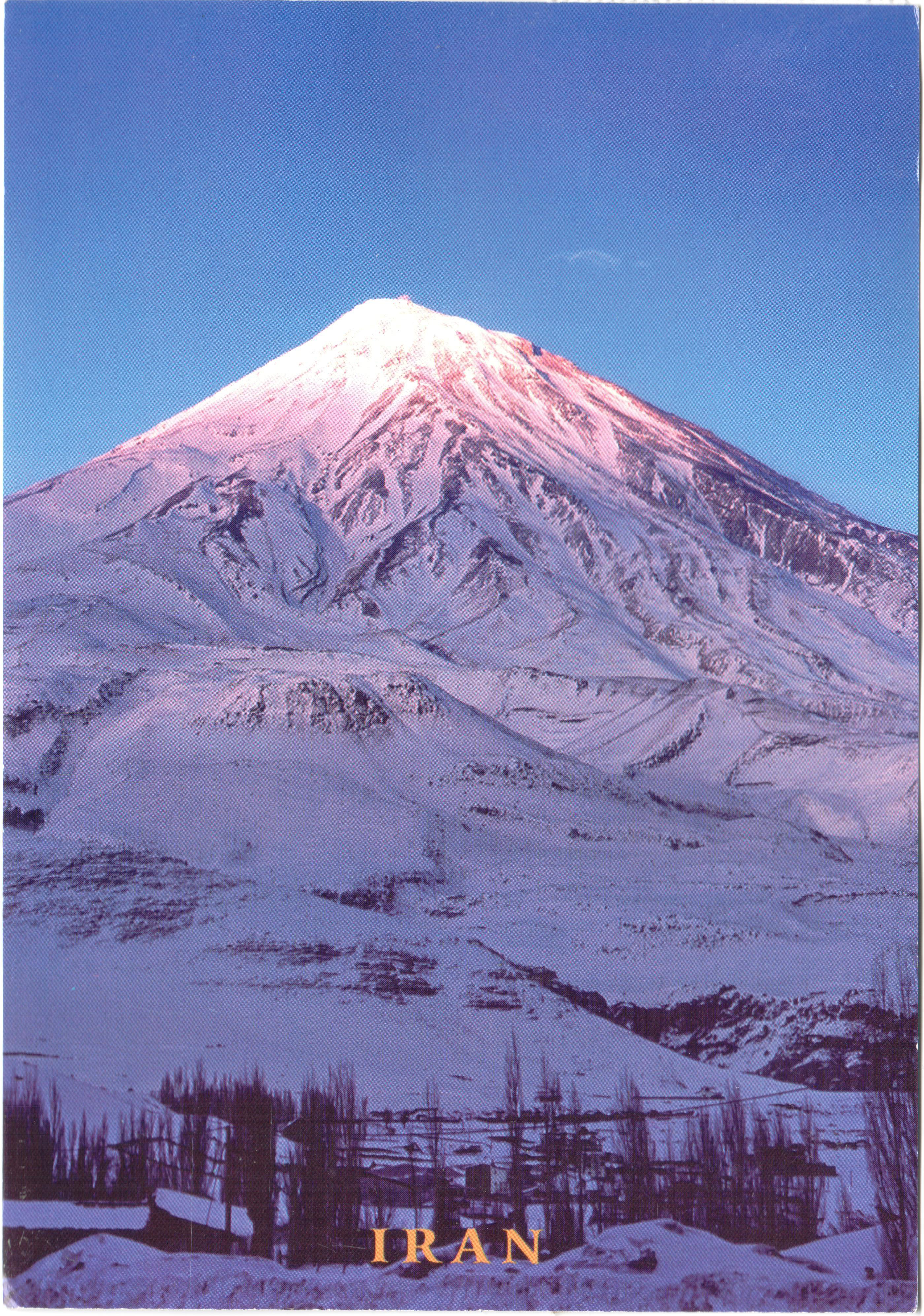 Na této pohlednici je majestátní Damávand, 4667 metrů vysoká potenciálně stále aktivní sopka, nacházející se v severní části země a představující nejvyšší vulkanickou horu celé Asie. Hora nese bohaté symbolické mytologické významy a je podstatná zejména pro starou zoroastrovskou kulturu. V ní byla sídlem tříhlavého draka Azh Dahak. V nejdůležitější rané sbírce zoroastrovských textů, Avestě, je Azh Dahak zosobním všeho zla, špatnosti a slabosti.