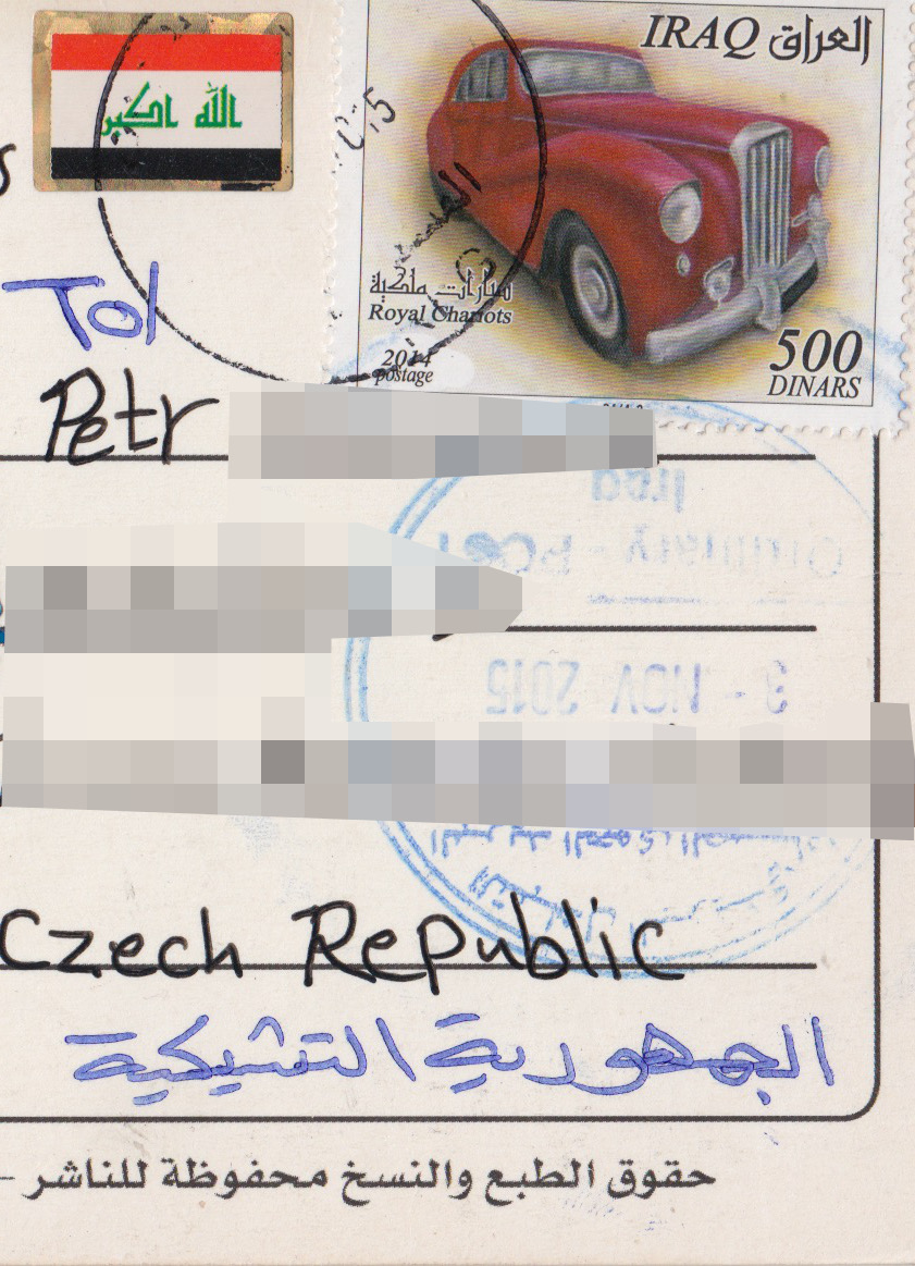Má druhá, třetí a čtvrtá pohlednice z Iráku dorazily od Mohameda z Bagdádu v pondělí 16. 11. 2015. Irák je překrásná historická země, rozkládající se kolem řek Eufrat a Tigris, která je bohužel během posledních 40 let sužována krutou a tragickou historií, plnou válek a zahraniční intervence. Doufejme, že se situace na Středním Východě nakonec stabilizuje a i Mohamed si bude moci v bezpečí užívat Postcrossingu jako my ostatní. Poslal mi dvě krásné historické pohlednice z roku 1914, zachycující tržiště v Bagdádu a jižní mokřady u Basry. Na třetí pohlednici je známí moderní sousoší Qahrumana, které vytvořil vynikající moderní irácký sochař Mohamed Ghani Hikmet. Socha symbolizuje vodu jako dárkyni života a je umístěna na jednom bagdádském náměstí.