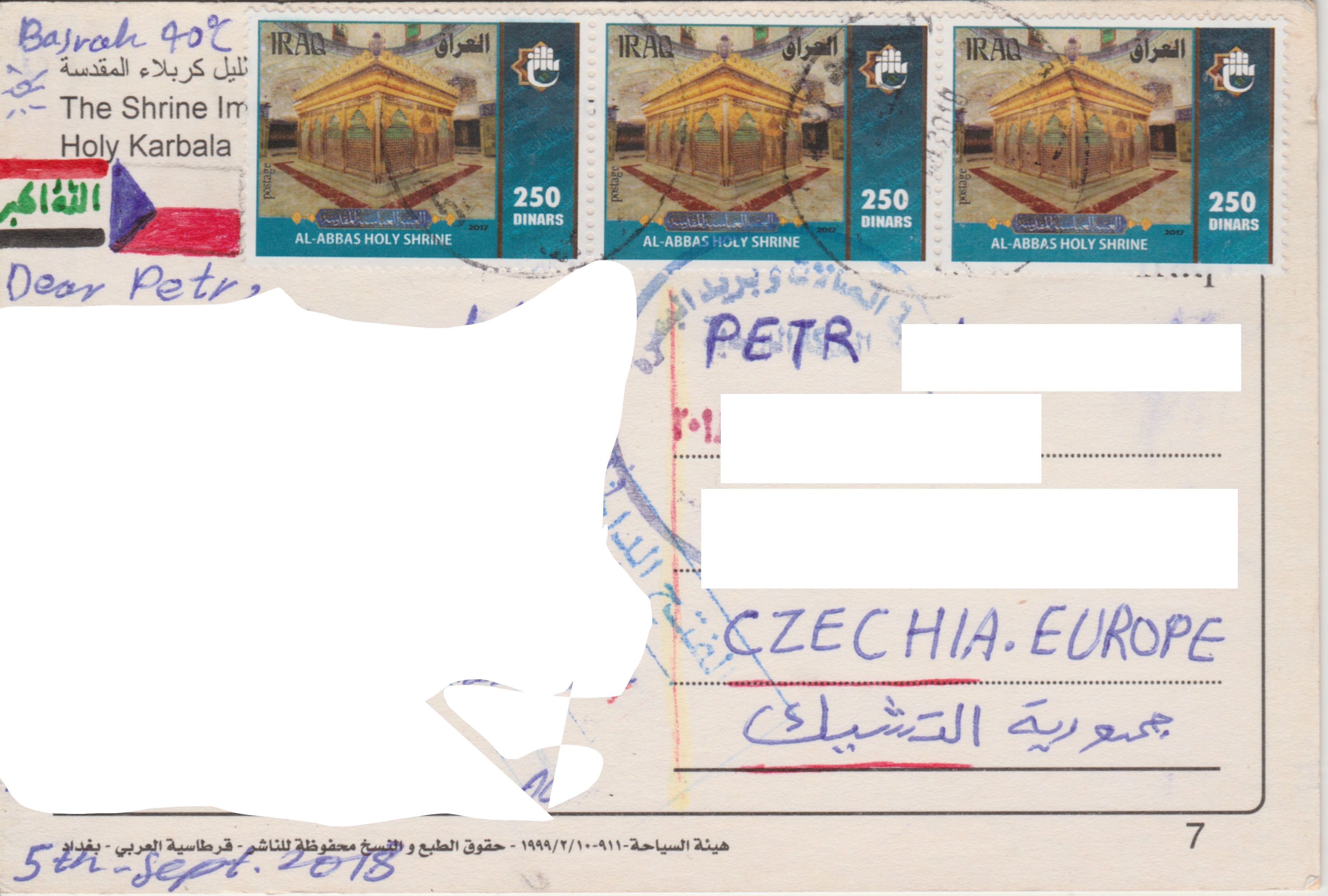 V pátek 12. října 2018 jsem do své poštovní schránky dostal tuto krásnou pohlednici, noční záběr na svatyni imáma Husajna Aliho v irácké Karbale. Husajn Ali je třetí imám islámské tradice, Muhammadův vnuk a představuje klíčovou postavu pro šiítskou tradici v islámu.