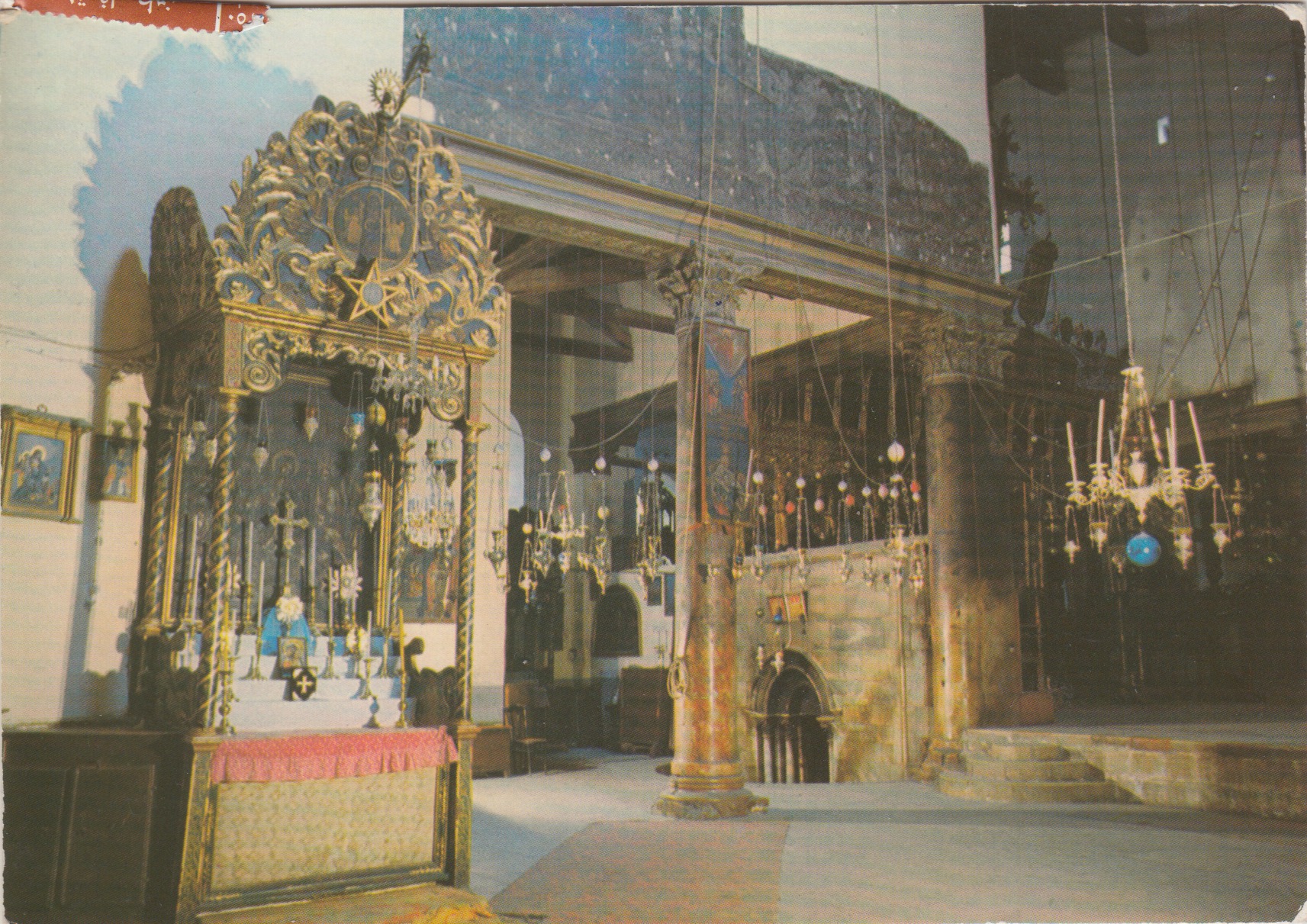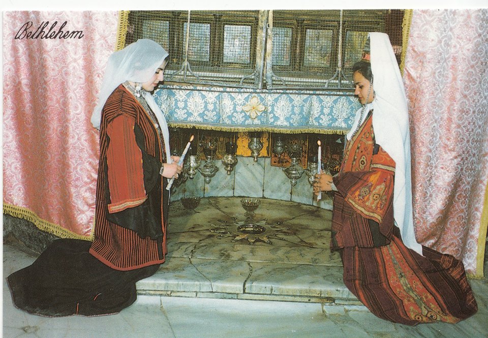 Dvě palestinské křesťanky, modlící se v Betlémě, Kostele narození Páně, který představuje jedno z klíčových sakrálních míst pro křesťanství. Kostel se má rozkládat na místě, kde se podle biblických textů narodil Ježíš.