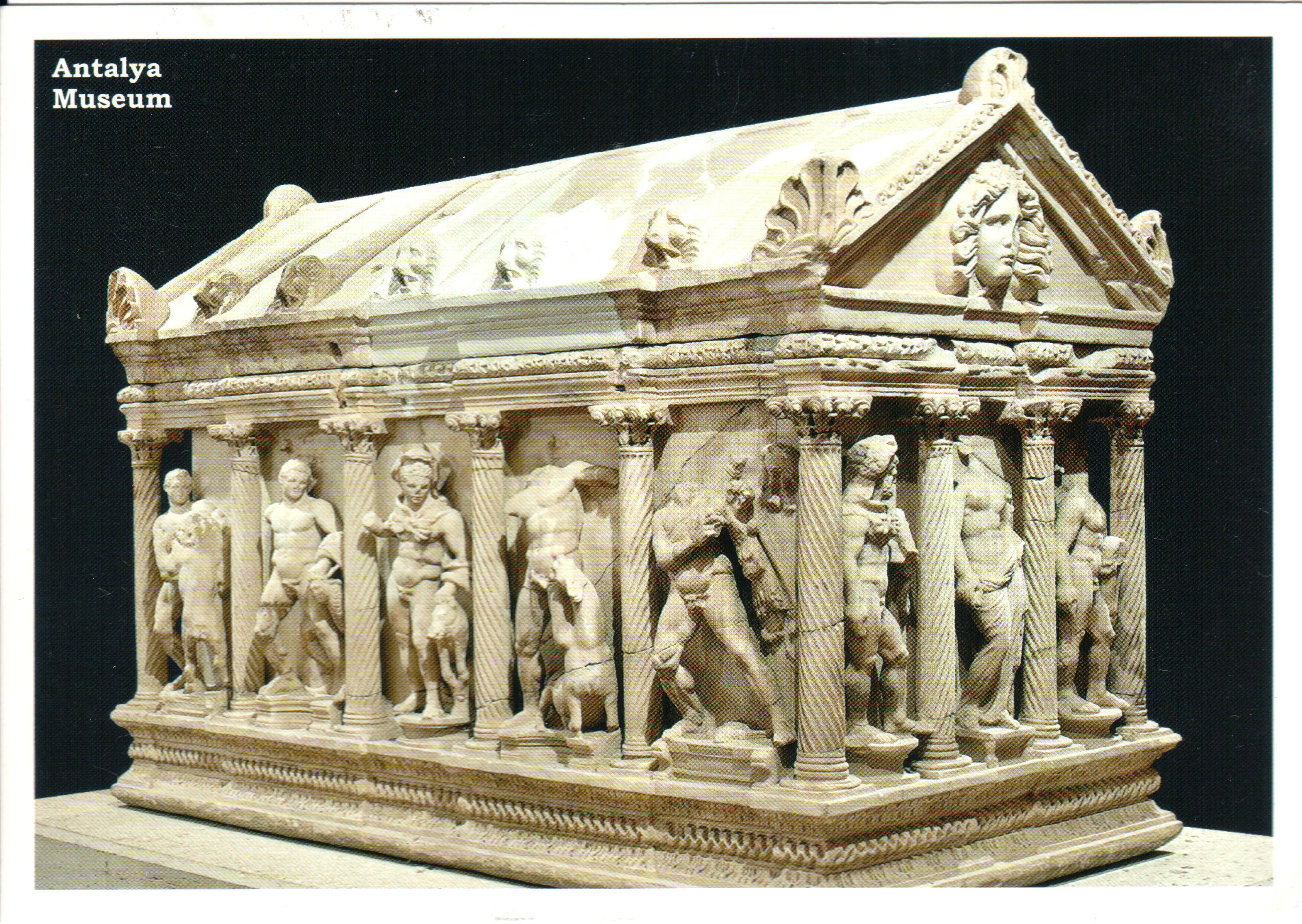 Na konci března 2018 jsem dostal tuto pozoruhodnou pohlednici z archeologického muzea Antalya, zachycující takzvaný Héraklovský sarkofág, pocházející z období přibližně 250-260 n. l. Osud památky je mimořádně dramatický: z Turecka byl propašován někdy kolem roku 1968 do soukromé sbírky ve Švýcarsku, odkud se po více než 50 letech znovu vrátil do země a byl veřejně vystaven. Sarkofág původně pocházel z antického města Dokimon ve stejné oblasti.