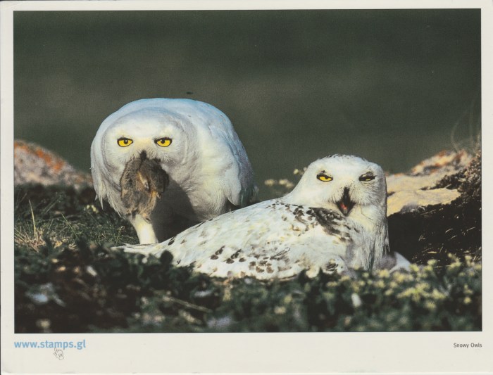 V pondělí 17. září 2018 jsem do své poštovní schránky dostal tento krásný pohled z Grónska, za který vděčím zajímavému člověku, s nímž jsem se na své cestě do této země setkal: Steve Haenisch neboli Backpackersteve má web i youtube kanál, který rozhodně stojí za návštěvu! Dva dny poté, co jsme se rozloučili v hlavním městě Norska Nuuku, pokračoval dále na sever, aby mimo jiné přenocoval na ledovci poblíž města a letiště Kangerlussuaq. Na pohlednici jsou sovice sněžné (Bubo scandiacus), které představují jedno z ikonických zvířat Grónska.