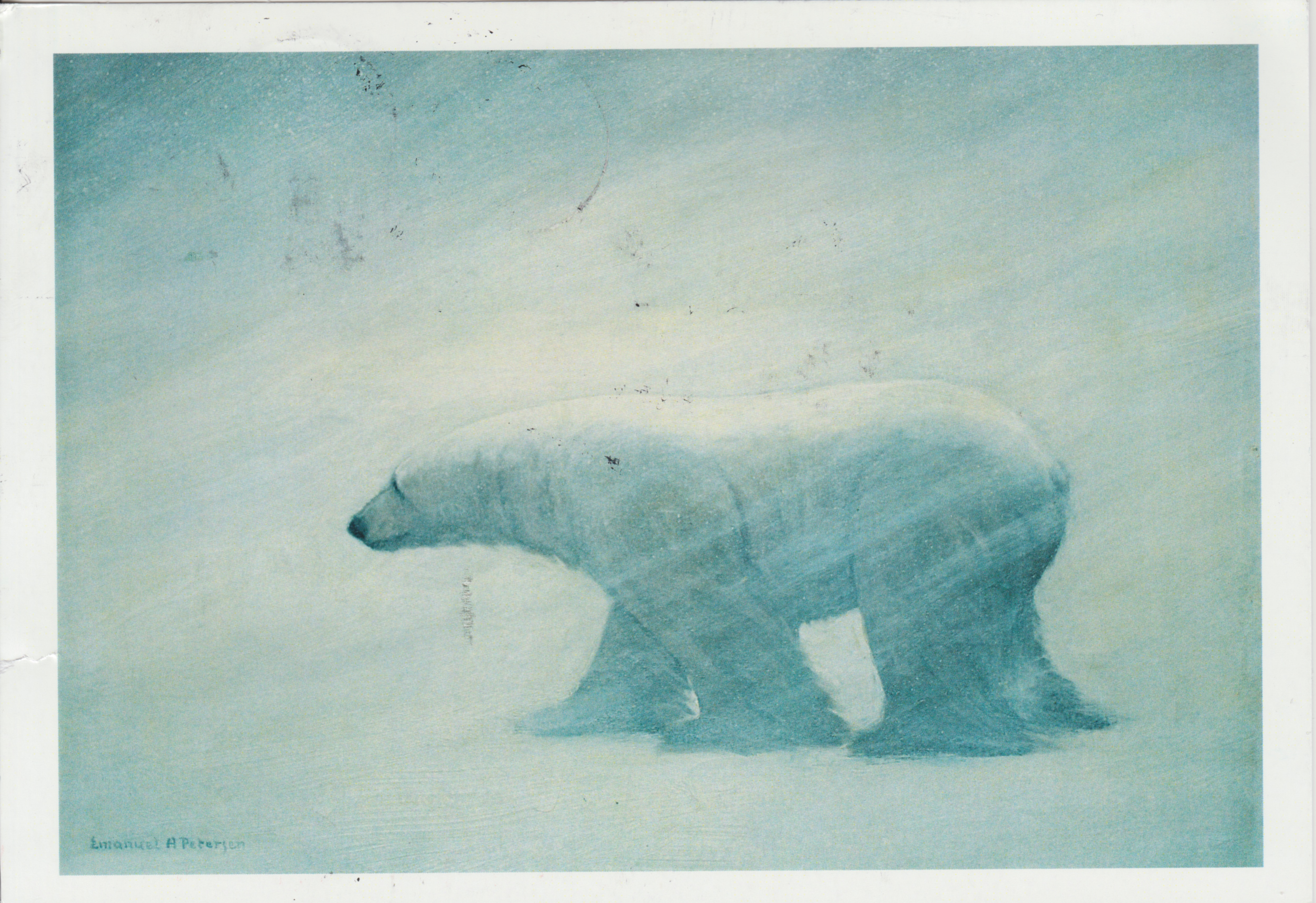 Na této pohlednici je pohled “osamocený lední medvěd ve sněhové bouři”, malba od slavního dánského malíře Emanuela A. Petersena.