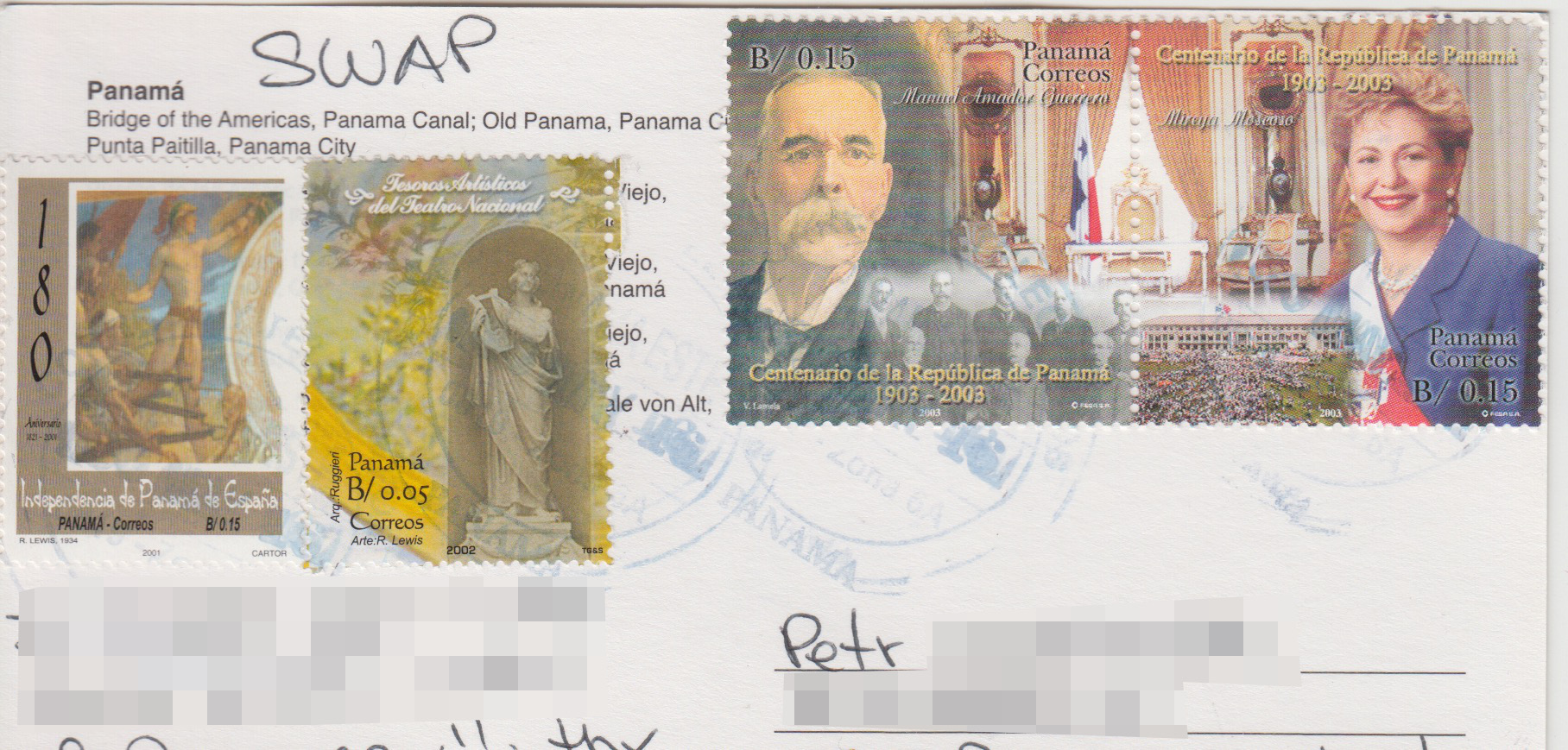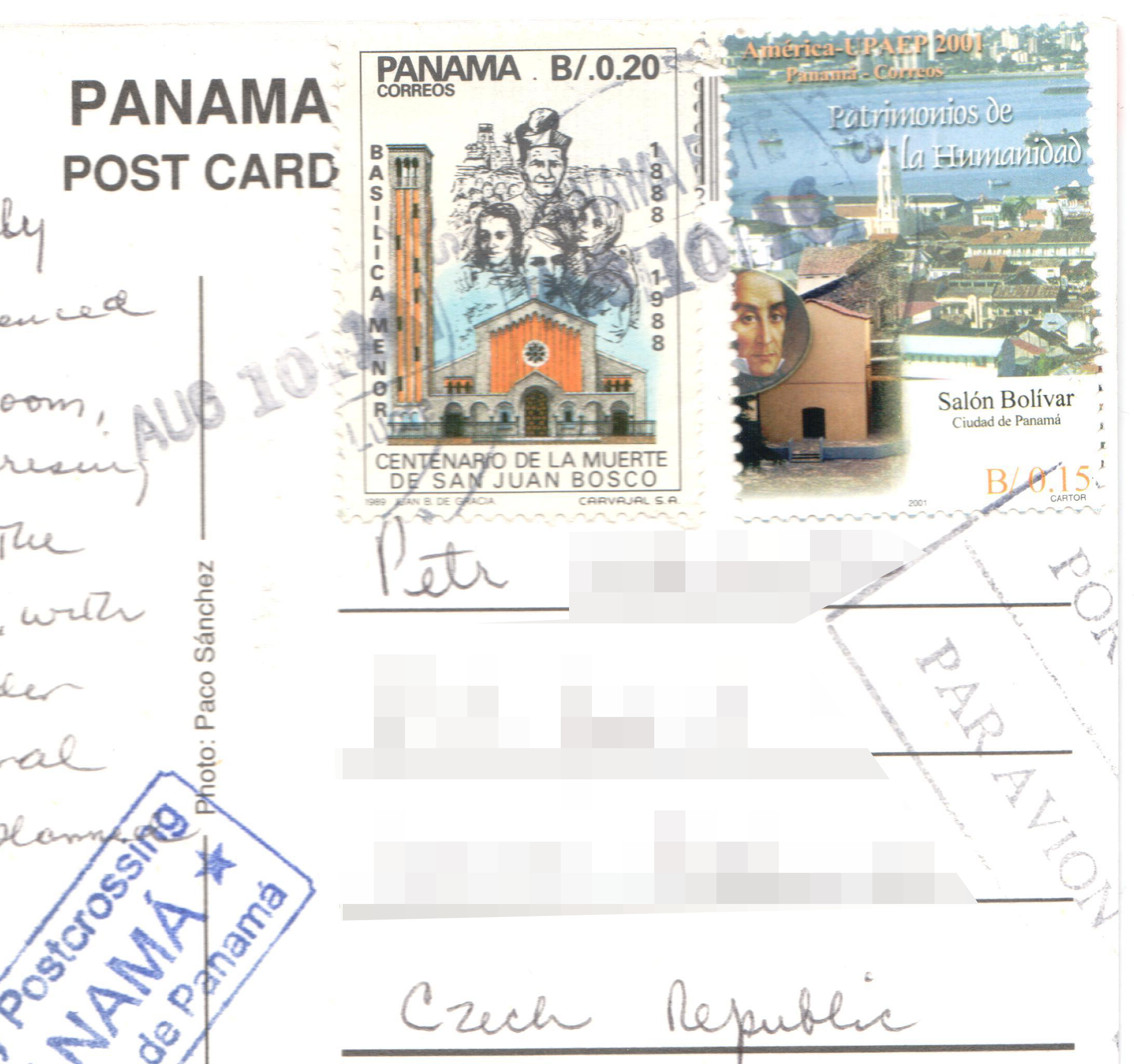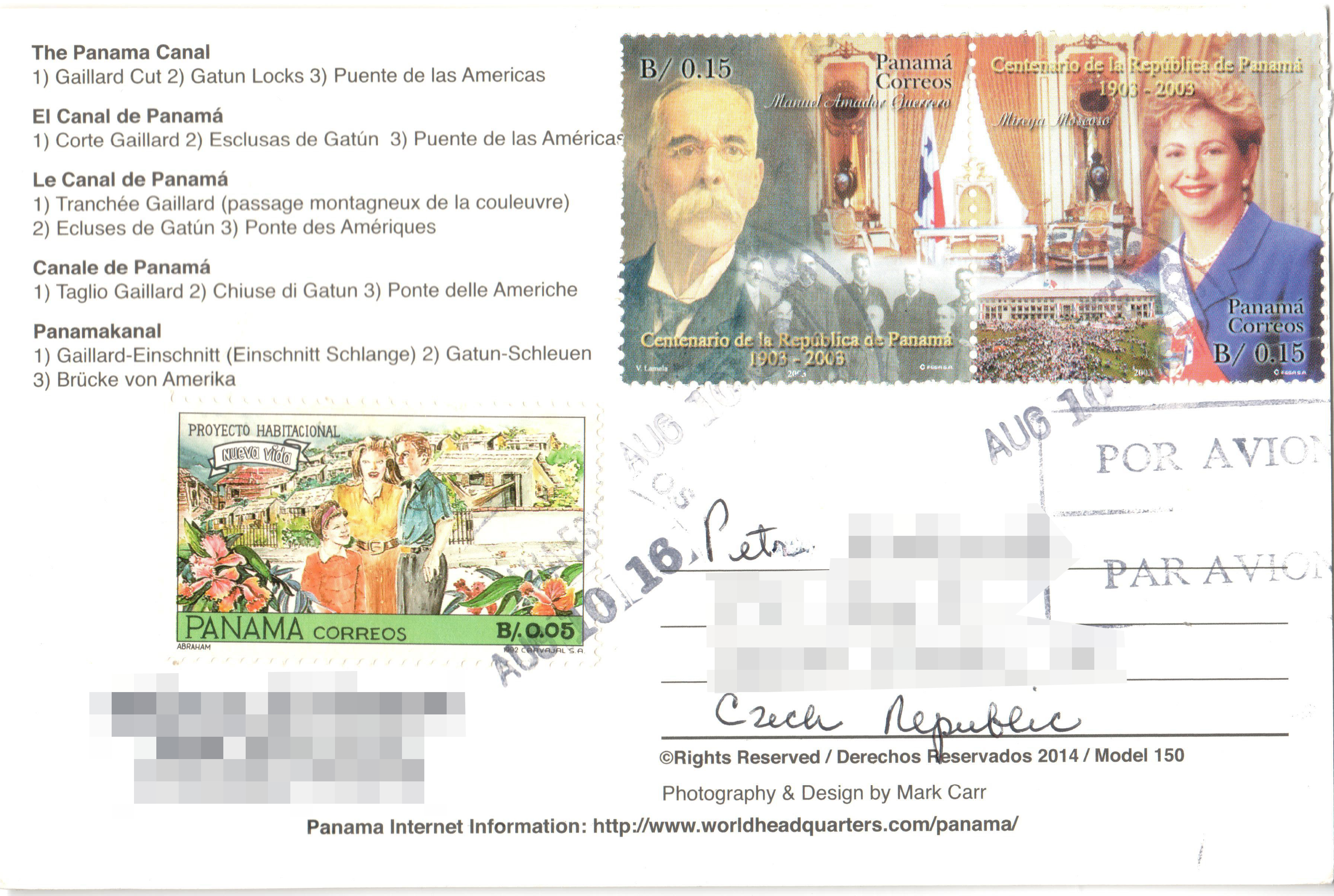 Můj první pohled z Panamy dorazil po dlouhém čekání 8. dubna 2015. Odeslán byl 12. února. Pošta z některých latinskoamerických zemí opravdu cestuje velmi pomalu, ale o to větší mě čeká překvapení. Na pohledu jsou klasické panamské lidové kroje, které se nosí zejména během nejrůznějších hudebních slavností a koncertů.