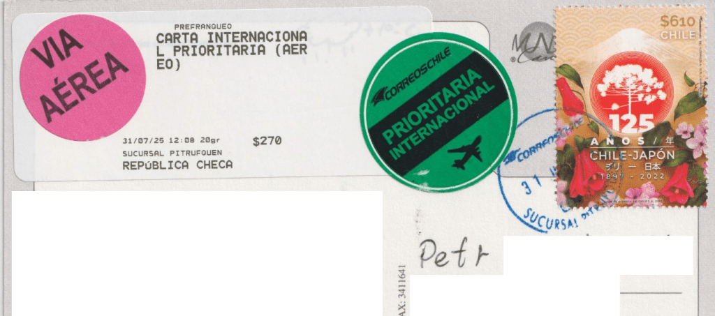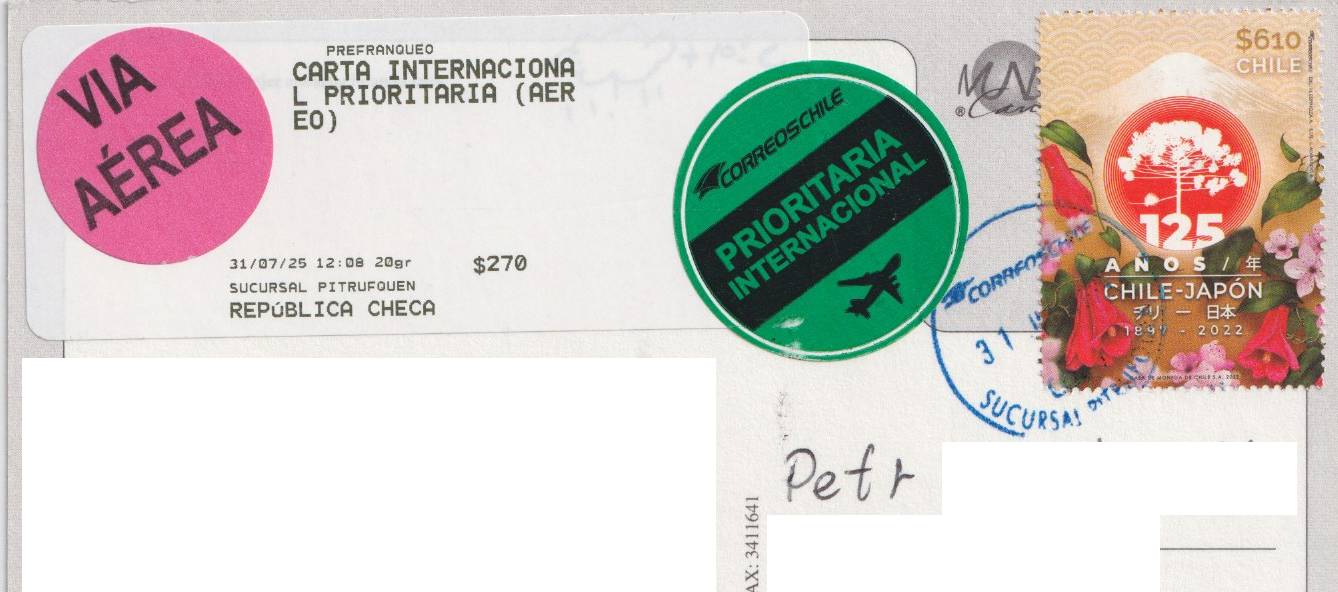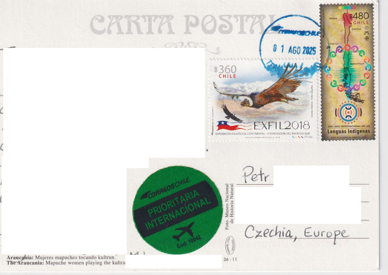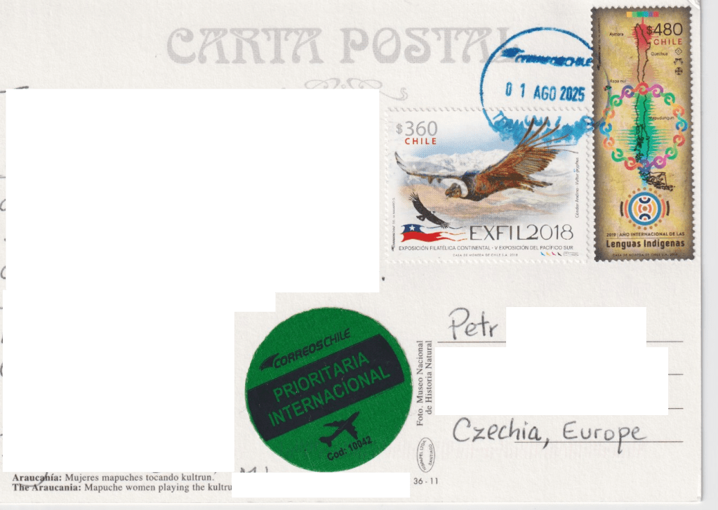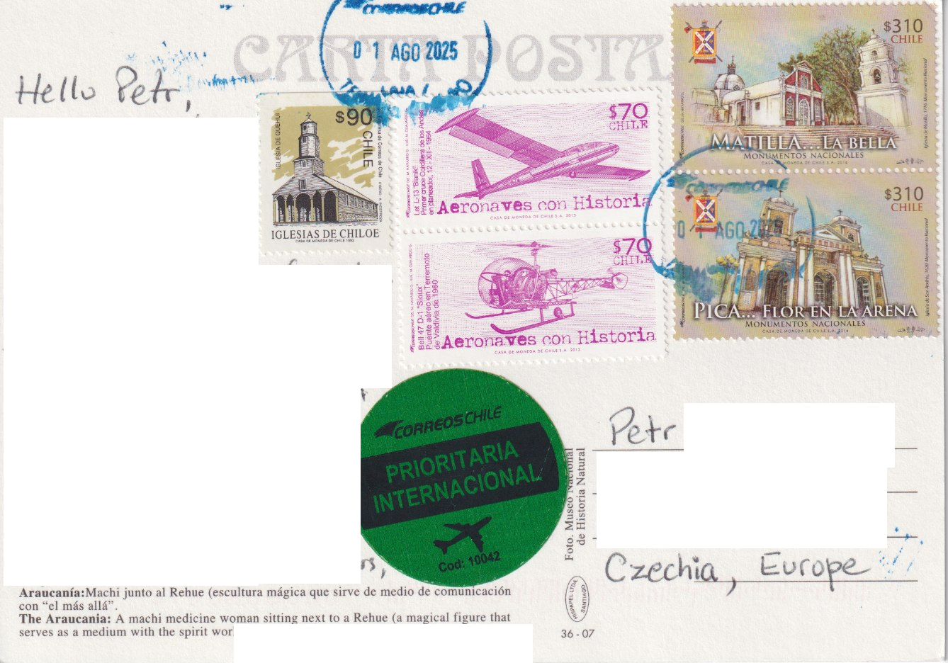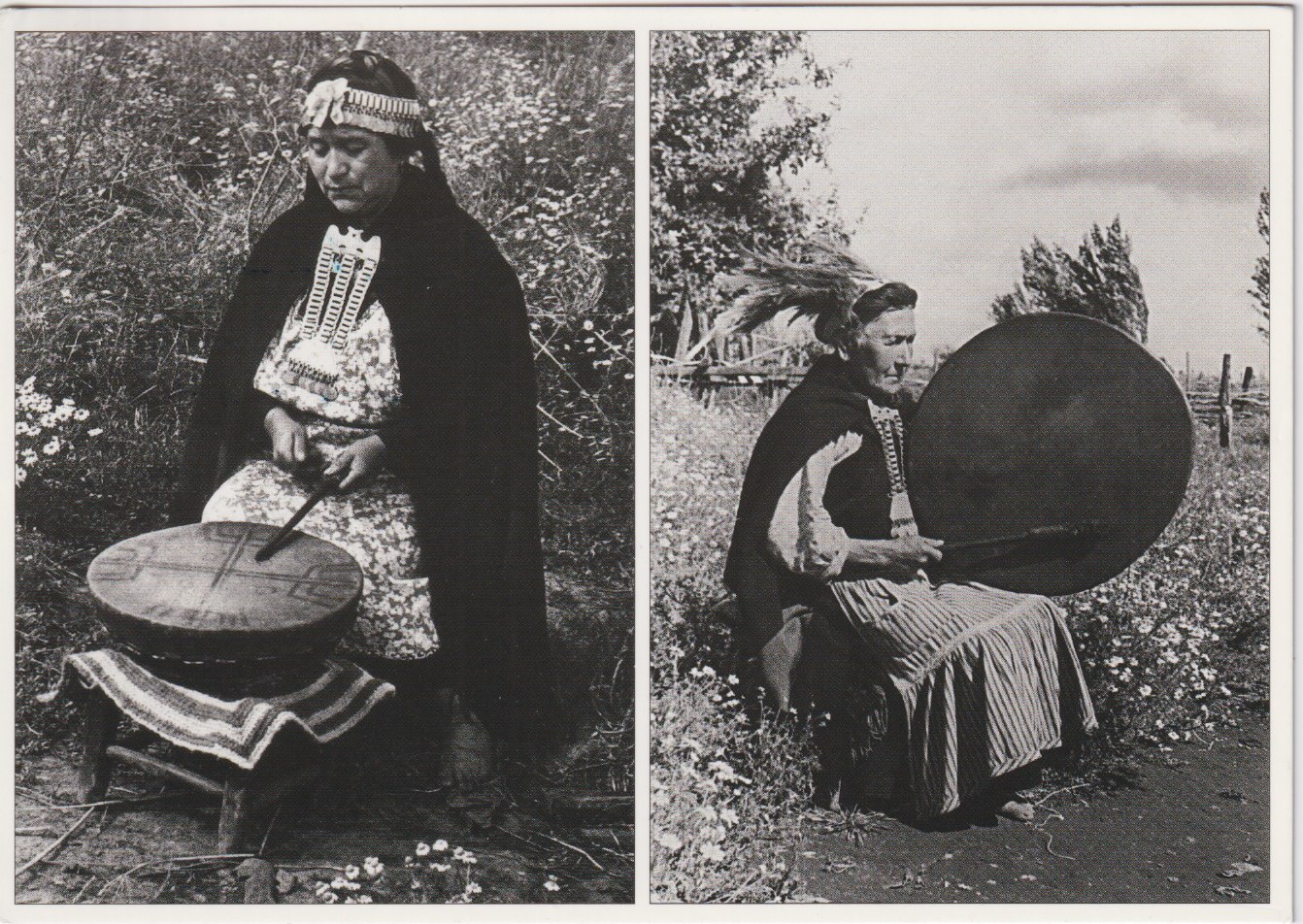 Na pohlednici se nachází mapučská šamanka, hrající na tradiční rituální buben, kultrun. Vpravo se nachází jeden z klasických velmi prostých mapučských totemů, o nichž se věří, že představují brány mezi světy živých a mrtvých. V mapučské kultuře hrají ženy velmi významnou roli co se týče spirituality a šamanství. Na konci srpna 2025 jsem dostal tyto dvě krásné černobílé pohlednice od Moniky, která žije přímo ve městě Temuco v Araukánii a má po Mapuche velké pochopení a sympatizuje s nimi.