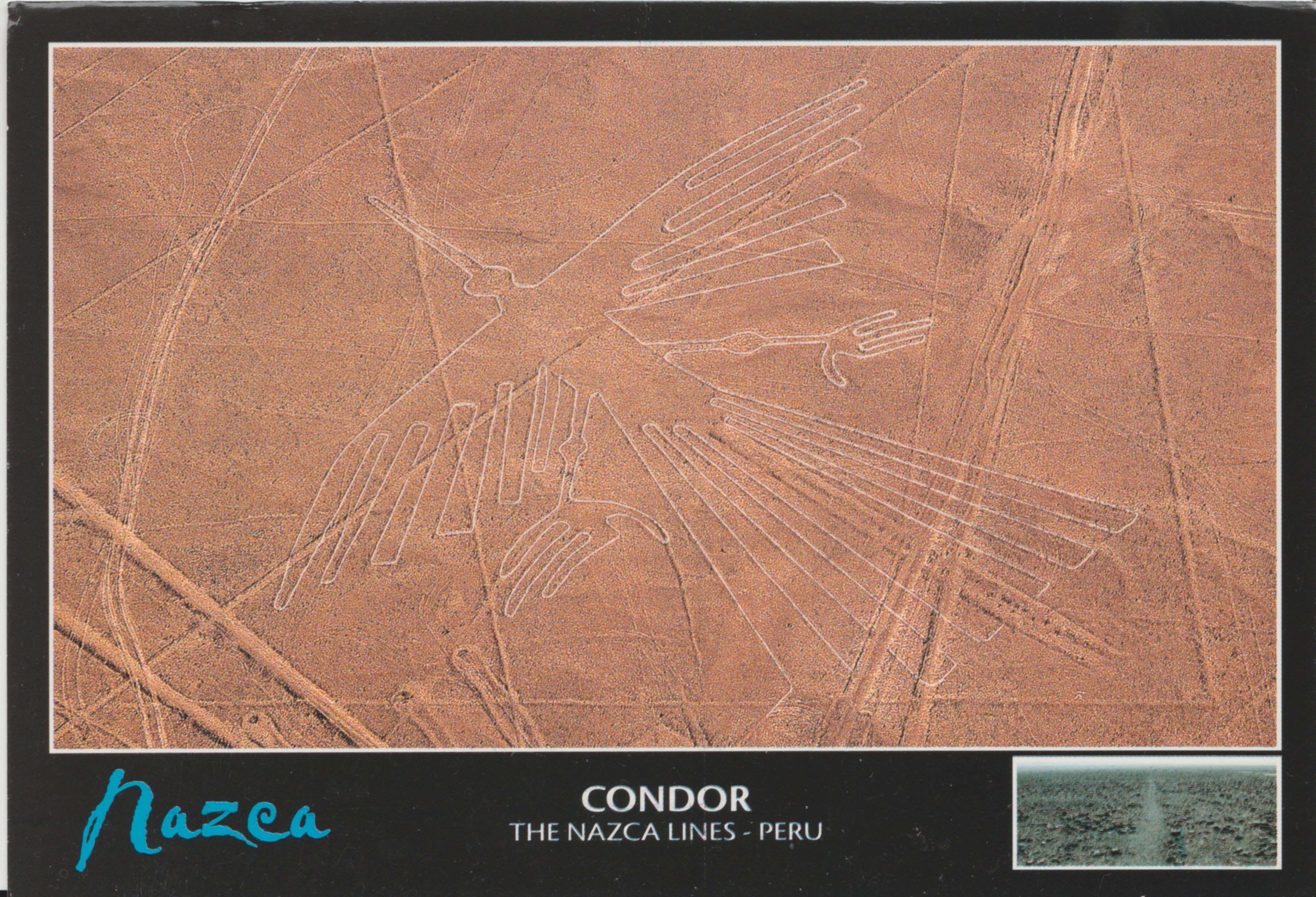 Na konci července 2023 jsem do své poštovní schránky dostal další pohled se slavnými obrazci na planině Nazca, zachycující také figuru kondora. Na pohledu byl použit překrásný známkový aršík, zachycující také ostatní linie. Jedná se o takzvané geoglyfy, které vznikly systematickým odstraněním horní vrstvy vulkanického prachu. Obrazce, kterých je celkem více než 300, vytvořili místní obyvatelé z tzv. kultury Nazca, která byla na místě přítomna přibližně v letech 800 př. n. l až 200 n. l. a o které máme naprosté minimum vědomostí. Přestože obrazce již v roce 1563 zmiňuje ve svých textech španělský conquistador Pedro Cieza de León, pokládal je za pouhé stezky, nebo ukazatele směru. Geoglyfy byly objeveny až ve dvacátých letech minulého století během průzkumu oblasti ze vzduchu a jejich první systematický průzkum podnikl americký historik a archeolog Paul Kosok v letech 1940–1941. Dodnes není vůbec jisté jakou metodou byly vytvořeny a hlavně jaký byl jejich kulturní smysl. V roce 2022 bylo objeveno 168 dalších nových obrazců, které jsou aktuálně dokumentovány. Kromě obrazců se na planině vyskytují i dlouhé linie. Antropologové, archeologové a historici vedou spory o důvodu vytvoření obrazců a obecně se předpokládá, že plnily jistý astronomicko-kosmologický účel. Někteří astronomové podporují teorii, že se jedná o mapu hvězdné oblohy.