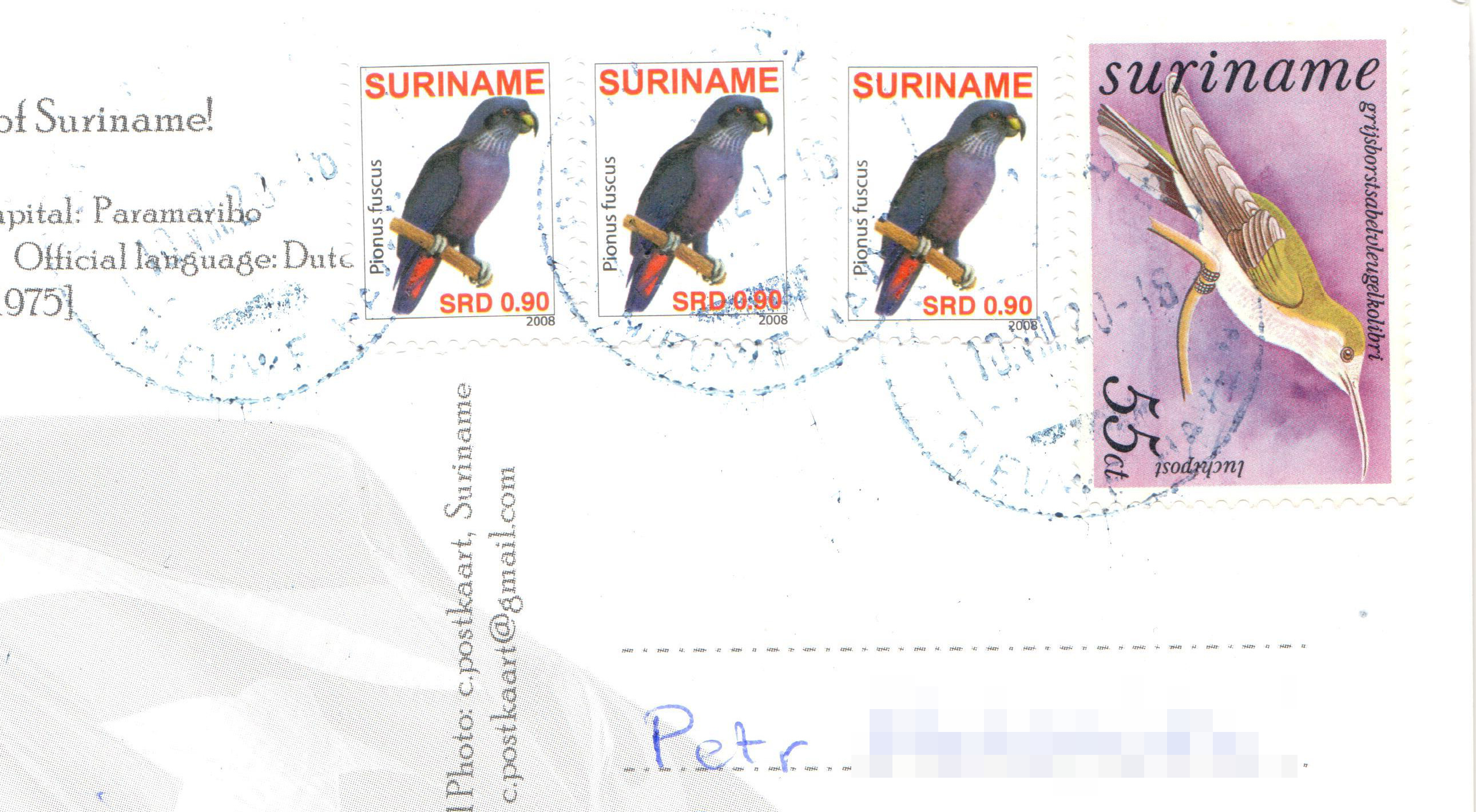 První pohled ze Surinamu dorazil do mé poštovní schránky v pátek 19. srpna 2016. Surinam je nejmenší země Latinské Ameriky, rozkládající se mezi Francouzskou Guayanou a Guayanou. V roce 1975 získala nezávislost na Nizozemí. Většina z necelých 570 tisíc obyvatel žije v hlavním městě Paramaribo a jeho okolí. Surinam byl osídlen již kolem roku 3000 př. n. l. indiánskými kulturami Arawaků. Na začátku 17. století založili kolem ústí řeky Suriname první plantáže nizozemští a angličtí kolonisté. O území se vedly vleklé spory, až roku 1665 Bredský mír skončil Druhou anglo-nizozemskou válku. Tato mírová smlouva měla dalekosáhlé následky, protože Nizozemí získalo Surinam, ale vzdalo se své kolonie kolem města Nový Amsterdam, které bylo následně přejmenováno na New York a stalo se střediskem pozdějších Spojených států amerických. Během 18. století z koloniálních plantáží uprchlo mnoho otroků, kteří založili novou kulturu, takzvanou Maroon, která prošla rychlým procesem etnogeneze a v 19. století se již jednalo o opoziční společnost a kulturu, žijící v poloilegalitě a konfliktu se společností koloniální. Otroctví bylo v Nizozemí zrušen až v roce 1873 a následně lidé, nucení pracovat na plantážích, masově opustili své utlačovatele a přesunuli se většinou do hlavního města. Nizozemská vláda proto do Surinamu importovala mnoho nových dělníků z Indonésie. V roce 1941 armáda USA obsadila Surinam, aby zabezpečila po porážce Nizozemí v první fázi války tamější strategicky důležité bauxitové doly. Tím začal pomalý proces dekolonizace. Surinam má dnes nesmírně bohatou přírodu, vyznačující se hlubokou a nevídanou biodiverzitou. Středosurinamská přírodní rezervace je součástí Světového dědictví UNESCO. Země má dále bohaté zlaté doly a vyváží hliník, zlato a korund (extrémně tvrdý minerál).