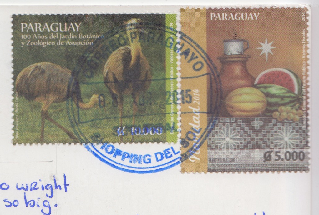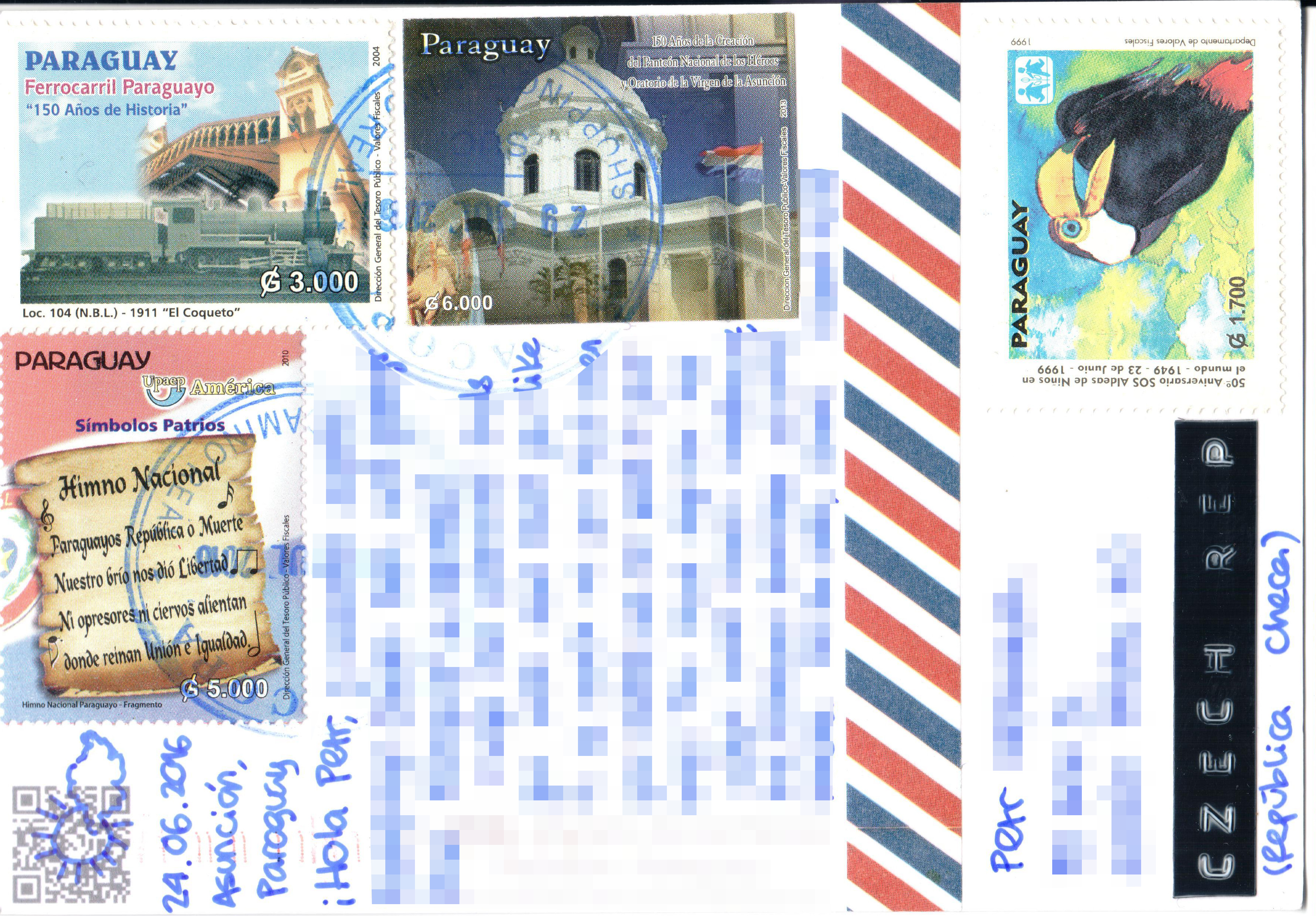 Můj první pohled z Paraguaye dorazil v úterý 21. dubna 2015 a rovnou s krásnými známkami. Paraguay získal nezávislost na Španělsku v roce 1811 a od té doby země zažívala dosti dramatickou historii, která vyvrcholila nejdéle existující vojenskou diktaturou v Latinské Americe v letech 1954 – 1989. Paraguay je zajímavý tím, že v místní kultuře má stále významnou pozici tradiční indiánská kultura Guaraní. Z koloniálních dob naneštěstí v zemi přetrvalo extrémně koncentrované vlastnictví půdy a nejpalčivější otázkou v současném Paraguayi je sociální problém – 20% obyvatel žije ve stavu, který OSN označuje jako extrémní nouzi. Nejhůře jsou zasaženi indiáni Guaraní, kteří se stále nacházejí na okraji společnosti.